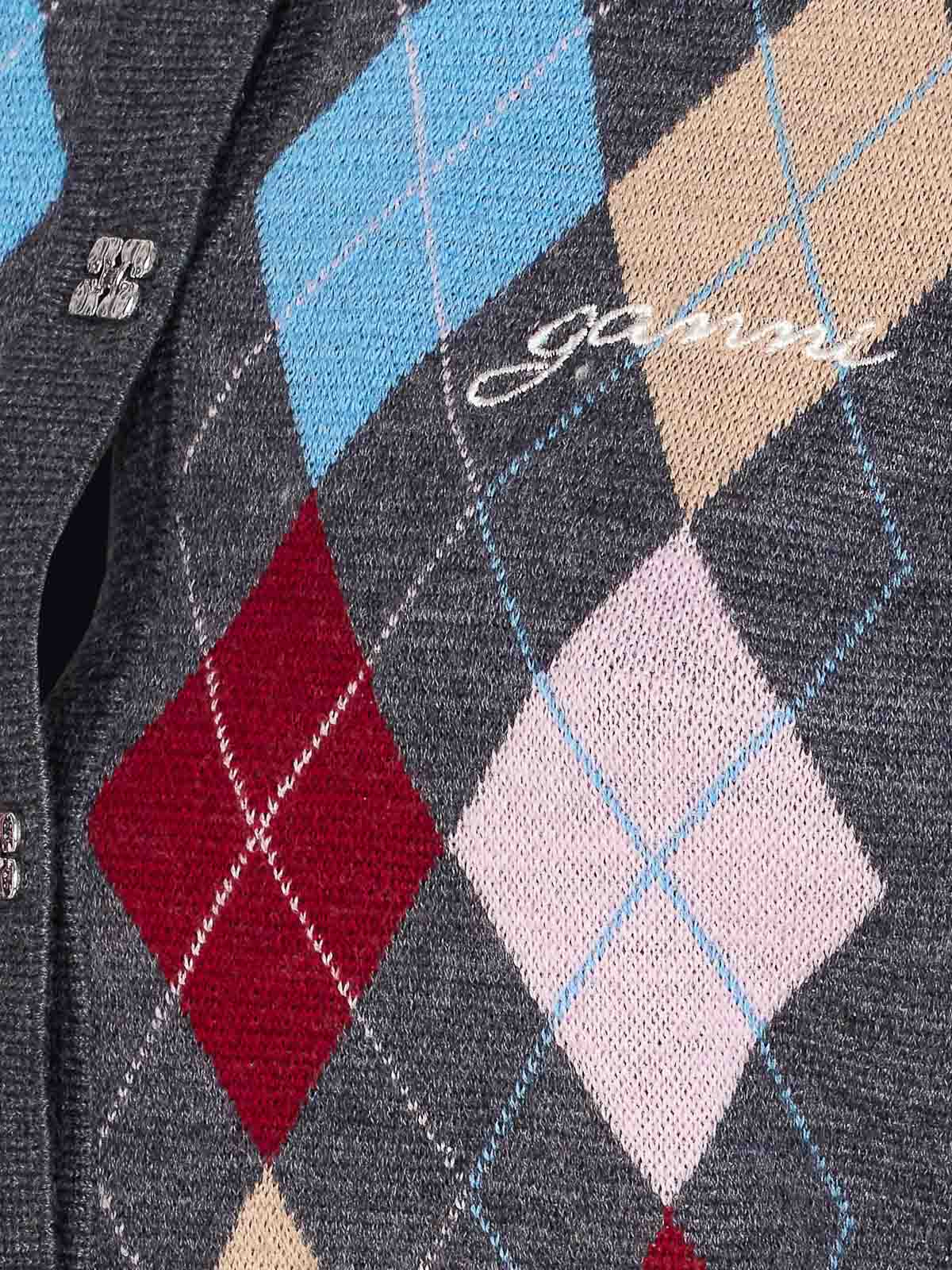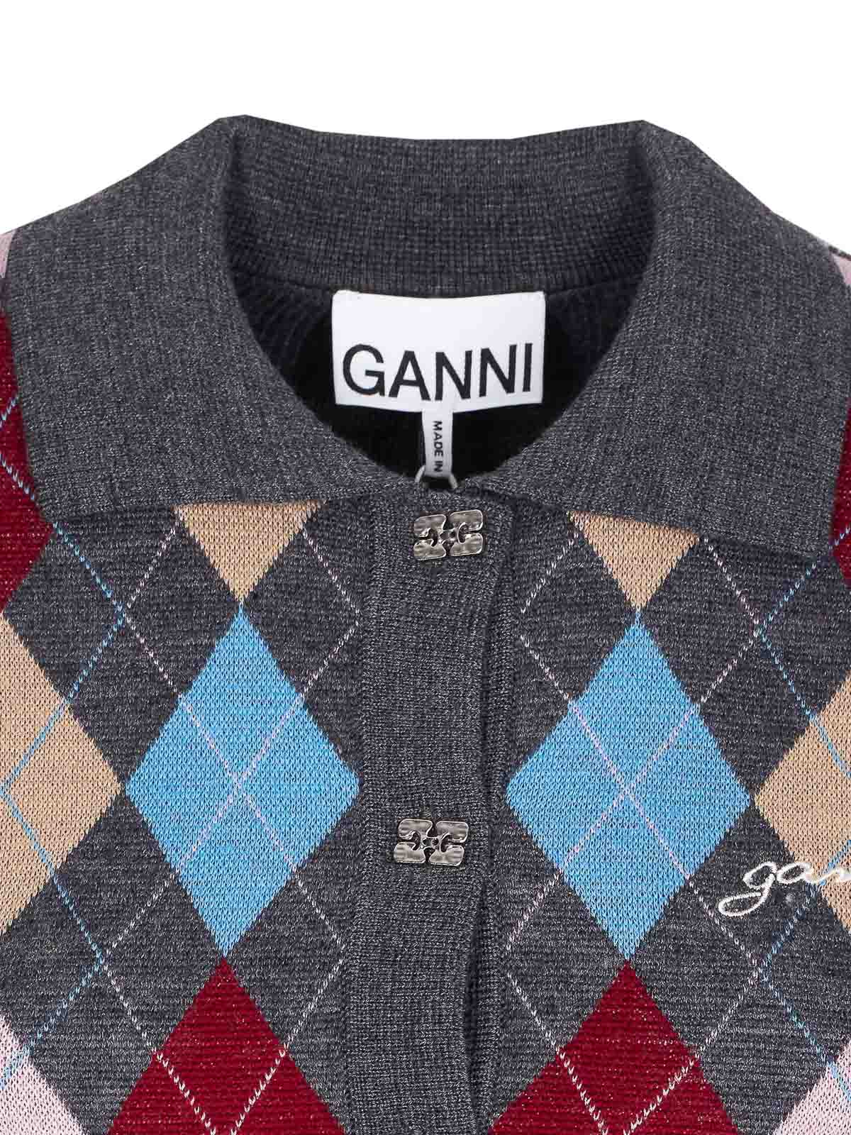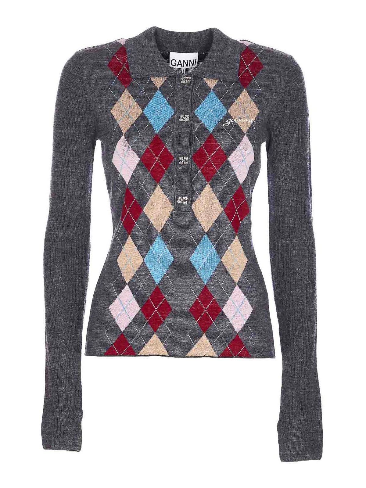 Ganniグレージャカードポロレギュラーカラーロゴボタン柄長袖デザイナーにロゴ刺繍入りカラー名:グレー