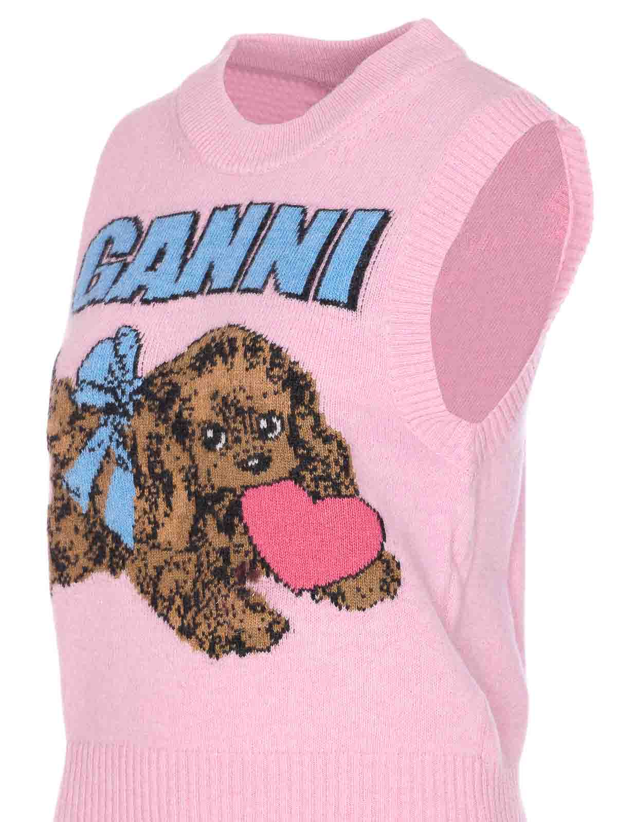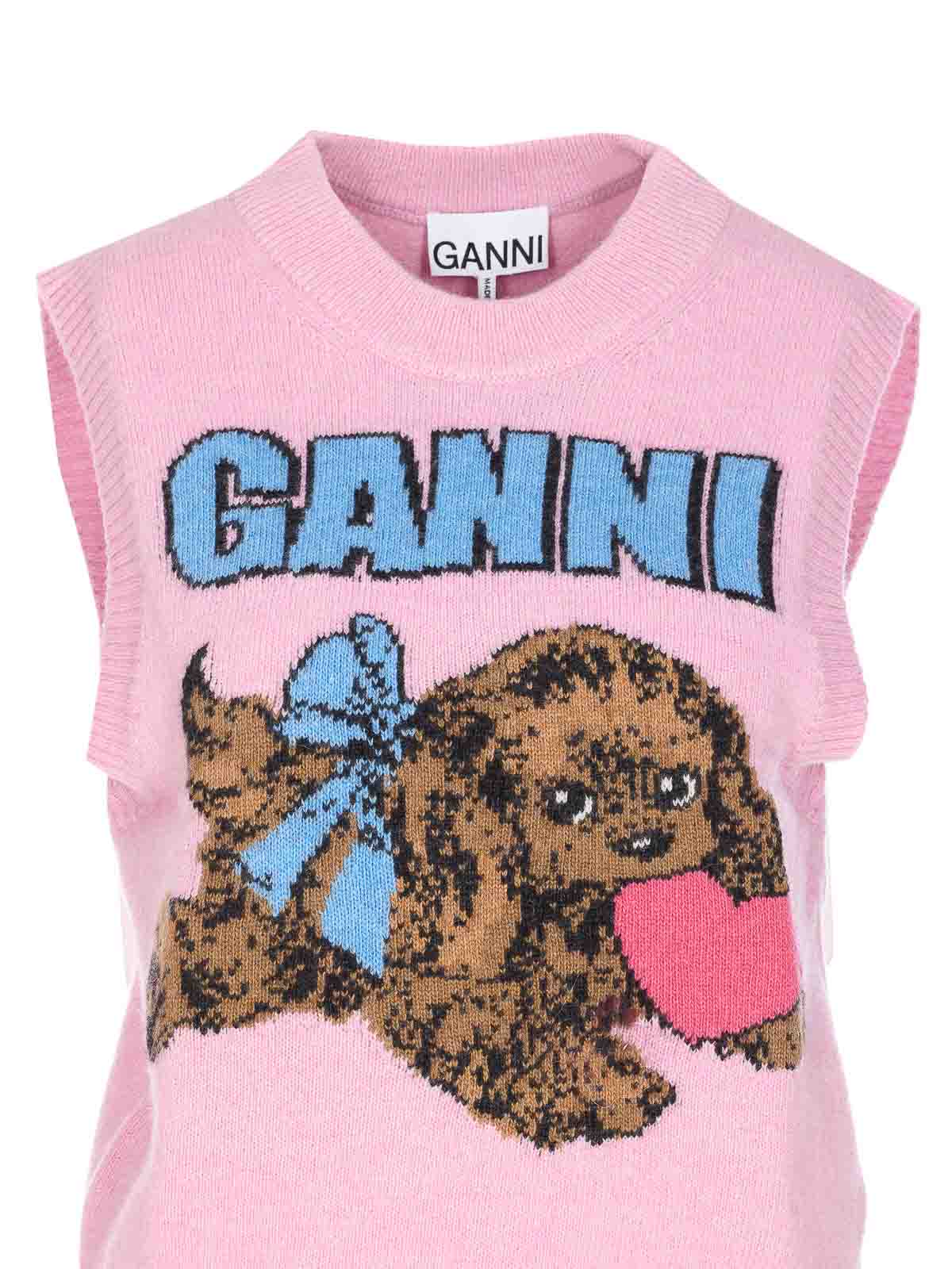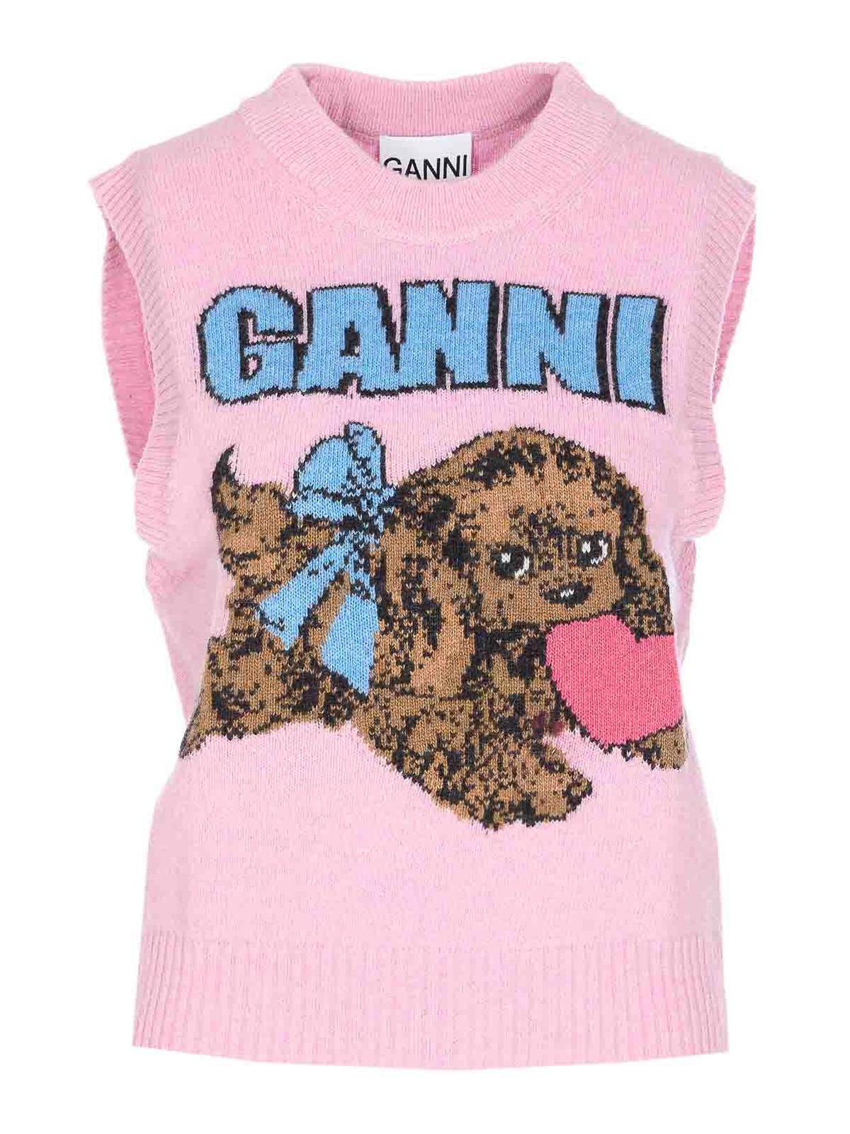 Ganniピンクグラフィックベストクルーネックノースリーブエンブロイダリーロゴ&パピーデザイナーカラー名:ピンク