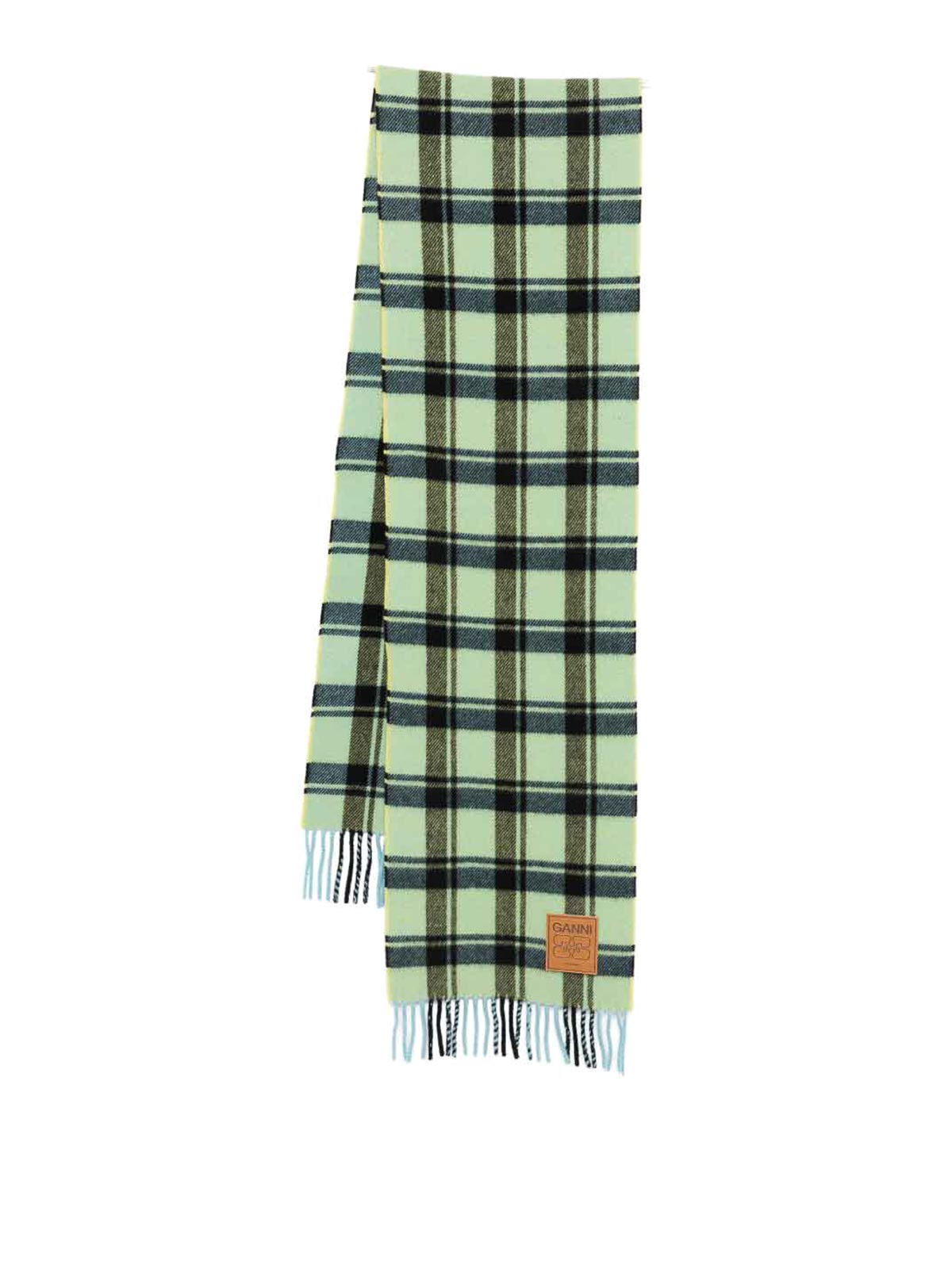 ミントグリーンのチェック柄フリンジ付き裾ロゴパッチ