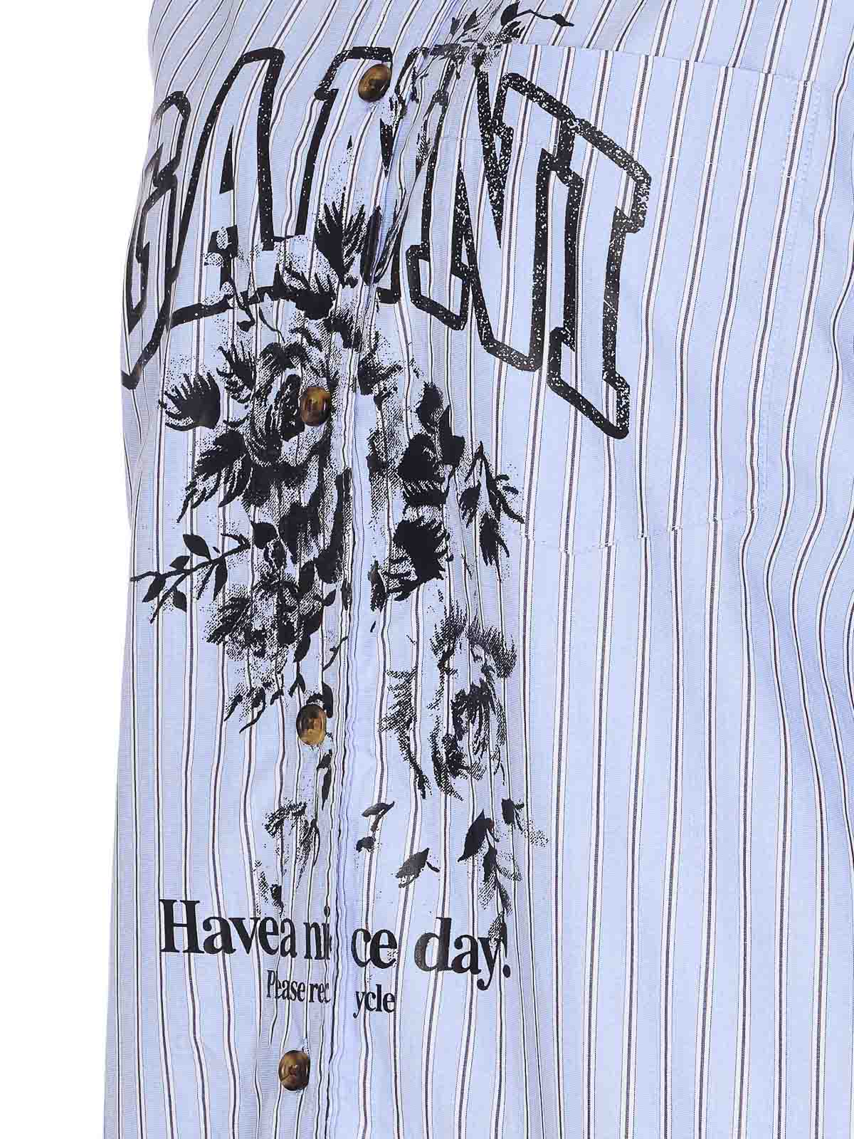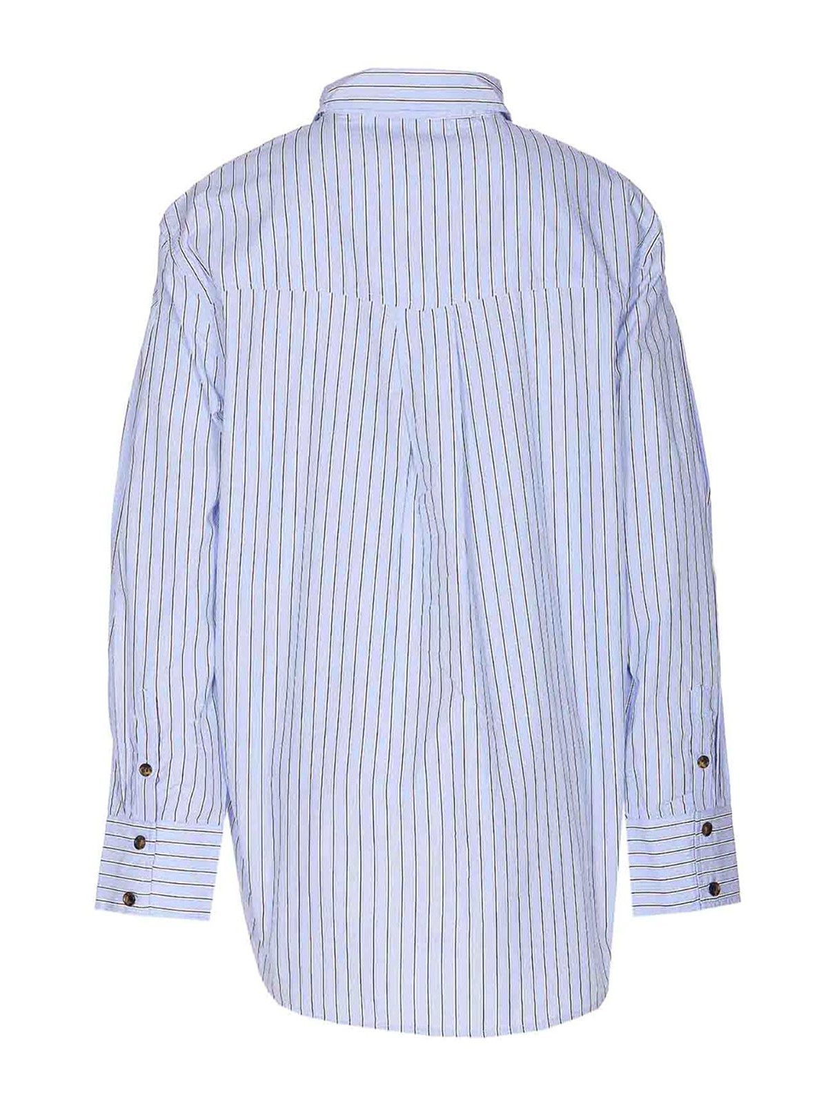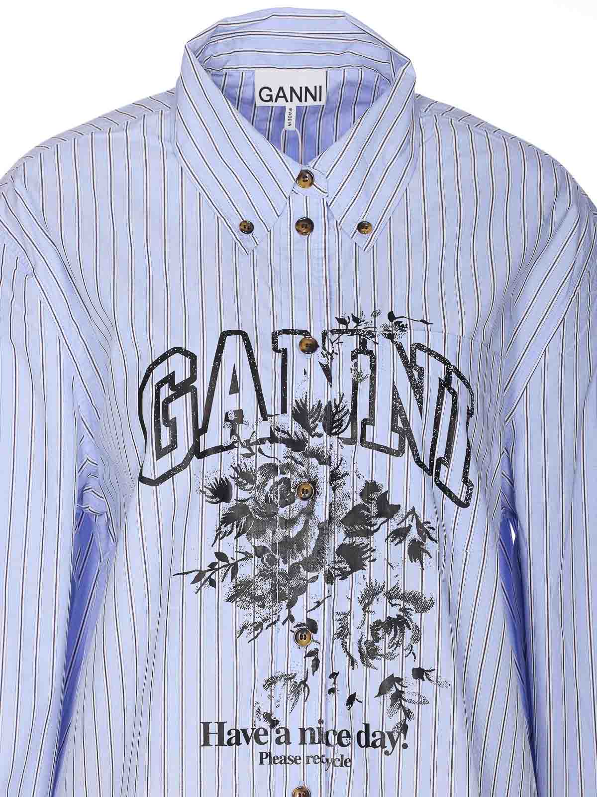 Ganniライトブルーストライプコットンシャツ、レギュラーカラー、ロングスリーブ、袖口にボタンディテール、フロントにロゴプリント
