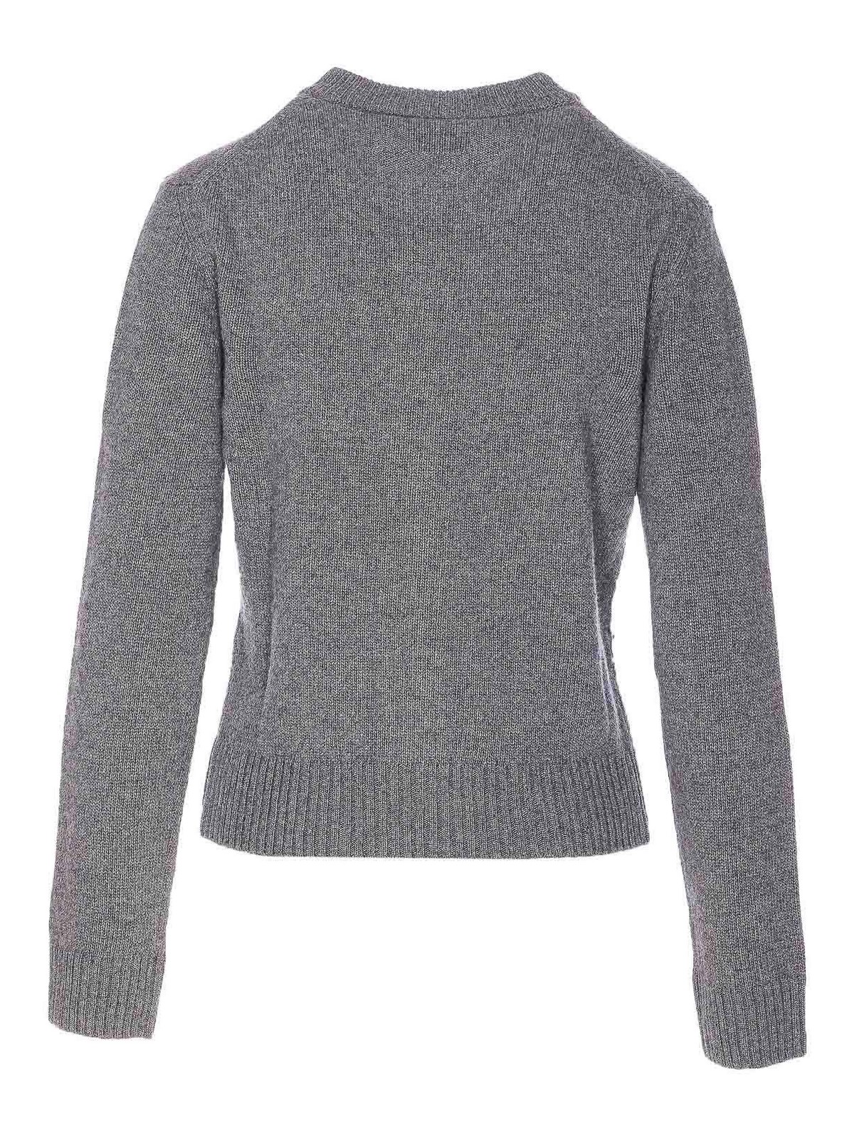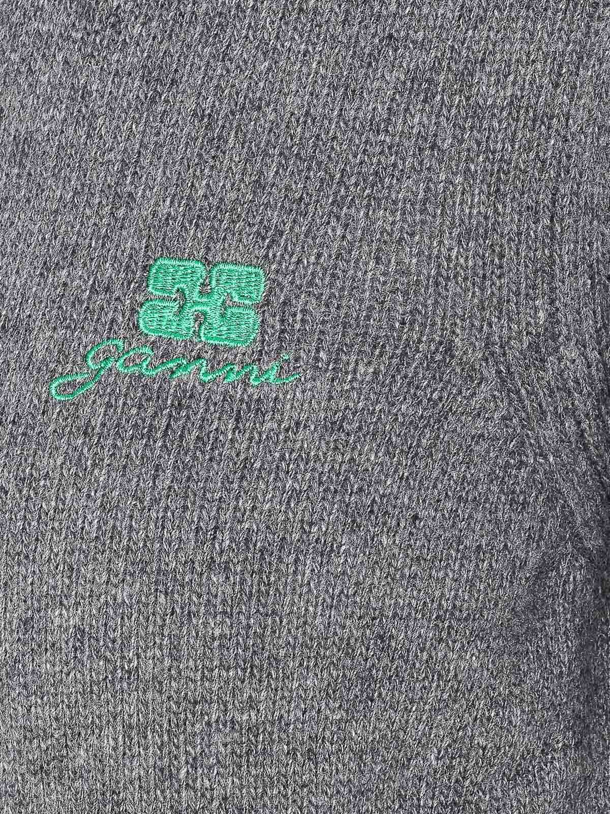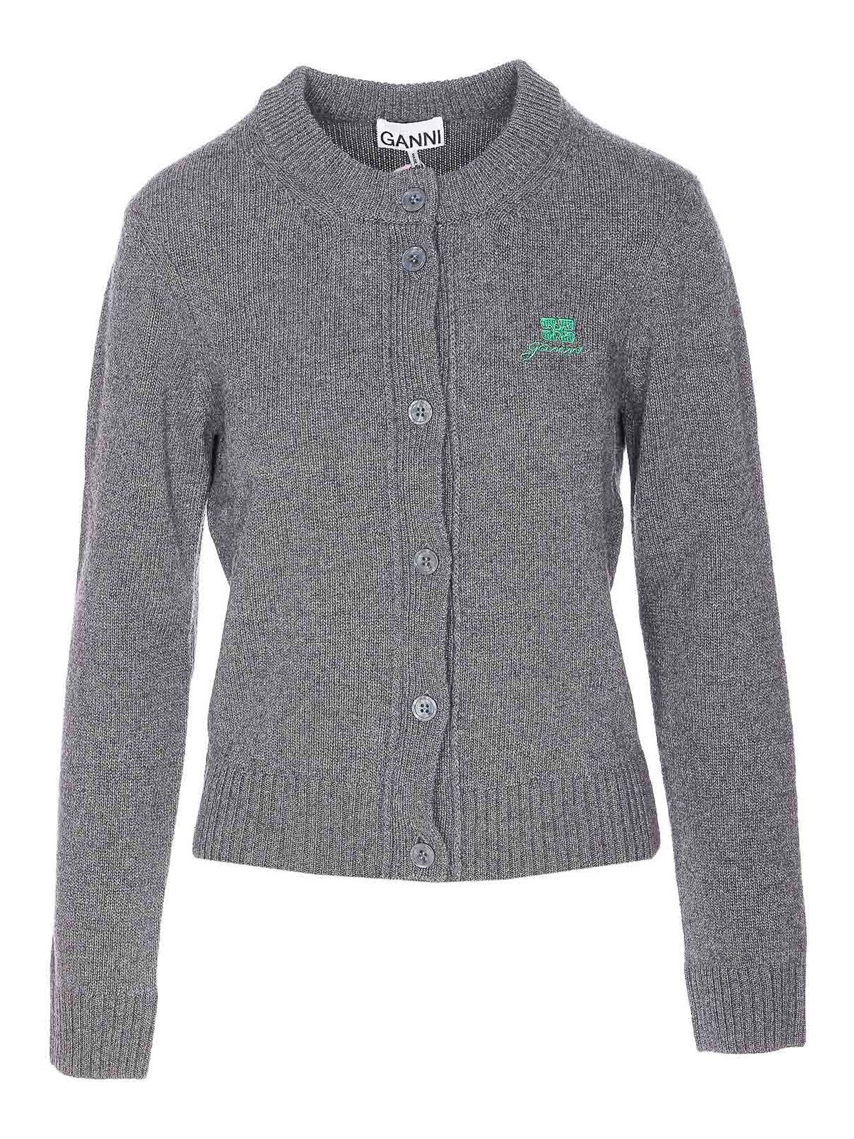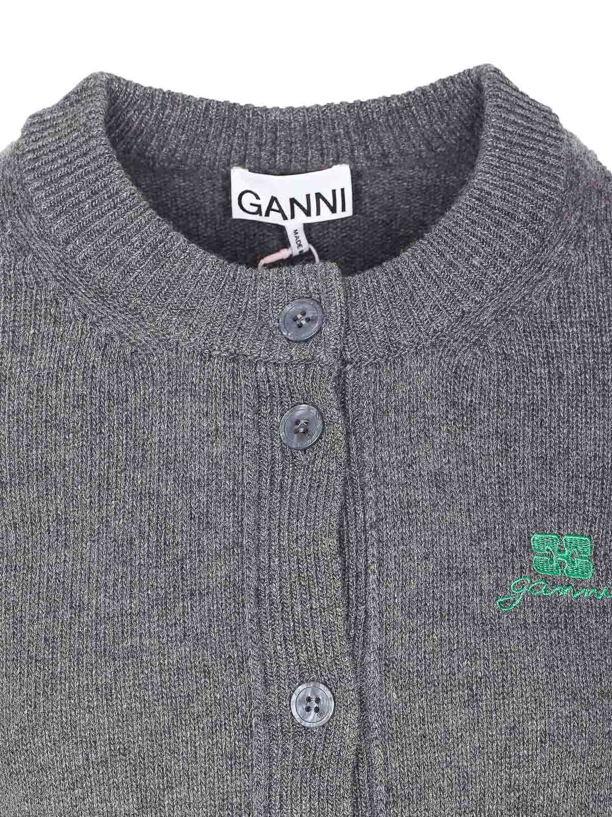Ganni グレーコアフューチャーカーディガン、フロントボタンクロージャー、クルーネック、ロングスリーブ、フロントにロゴ刺繍入り