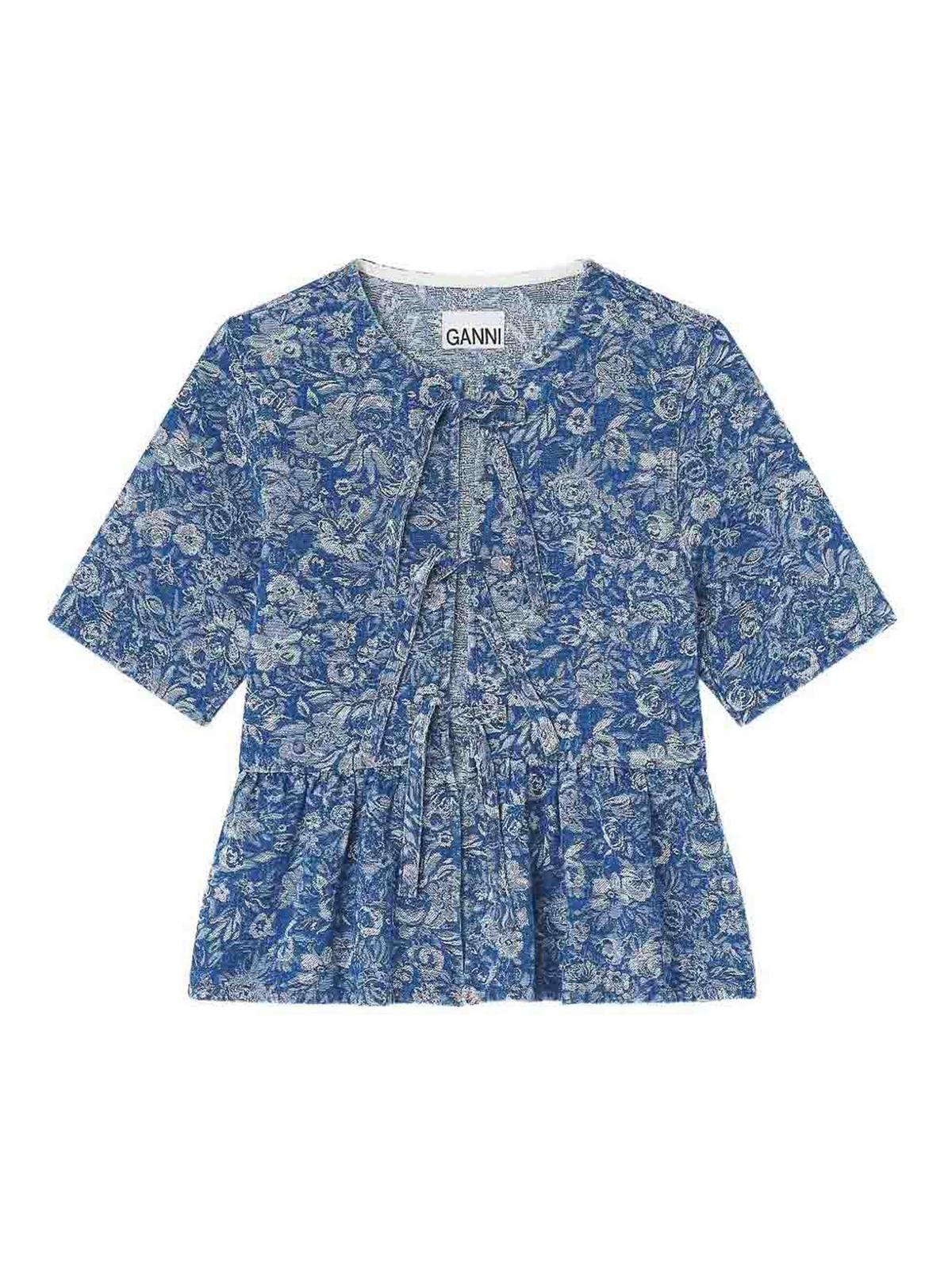 タペストリーデニムペプラムブラウスミッドブルーストーン