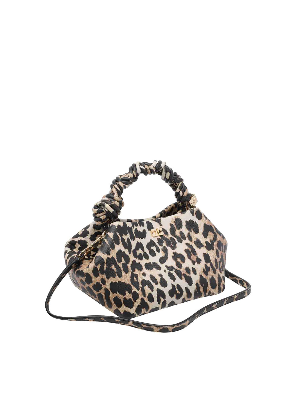 Ganni Brownの小さなヒョウ柄のハンドバッグ、マグネット式クロージャー、内側スロット1つ、ハンドル1つ、取り外し可能な調節可能なショルダーバッグ