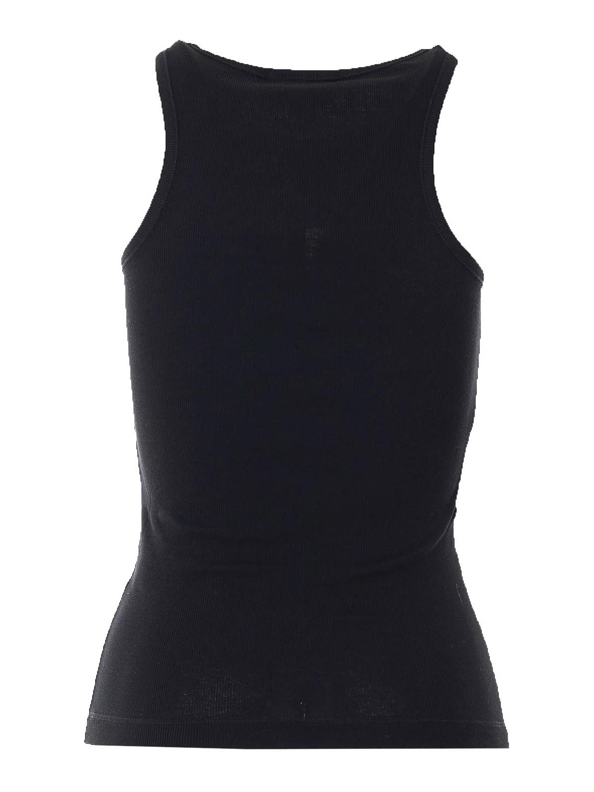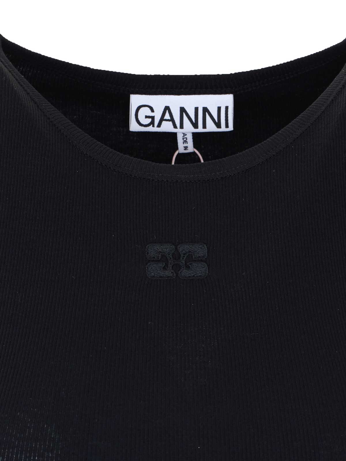 Ganniブラックリブタンクトップ、前面にロゴ刺繍、ノースリーブ