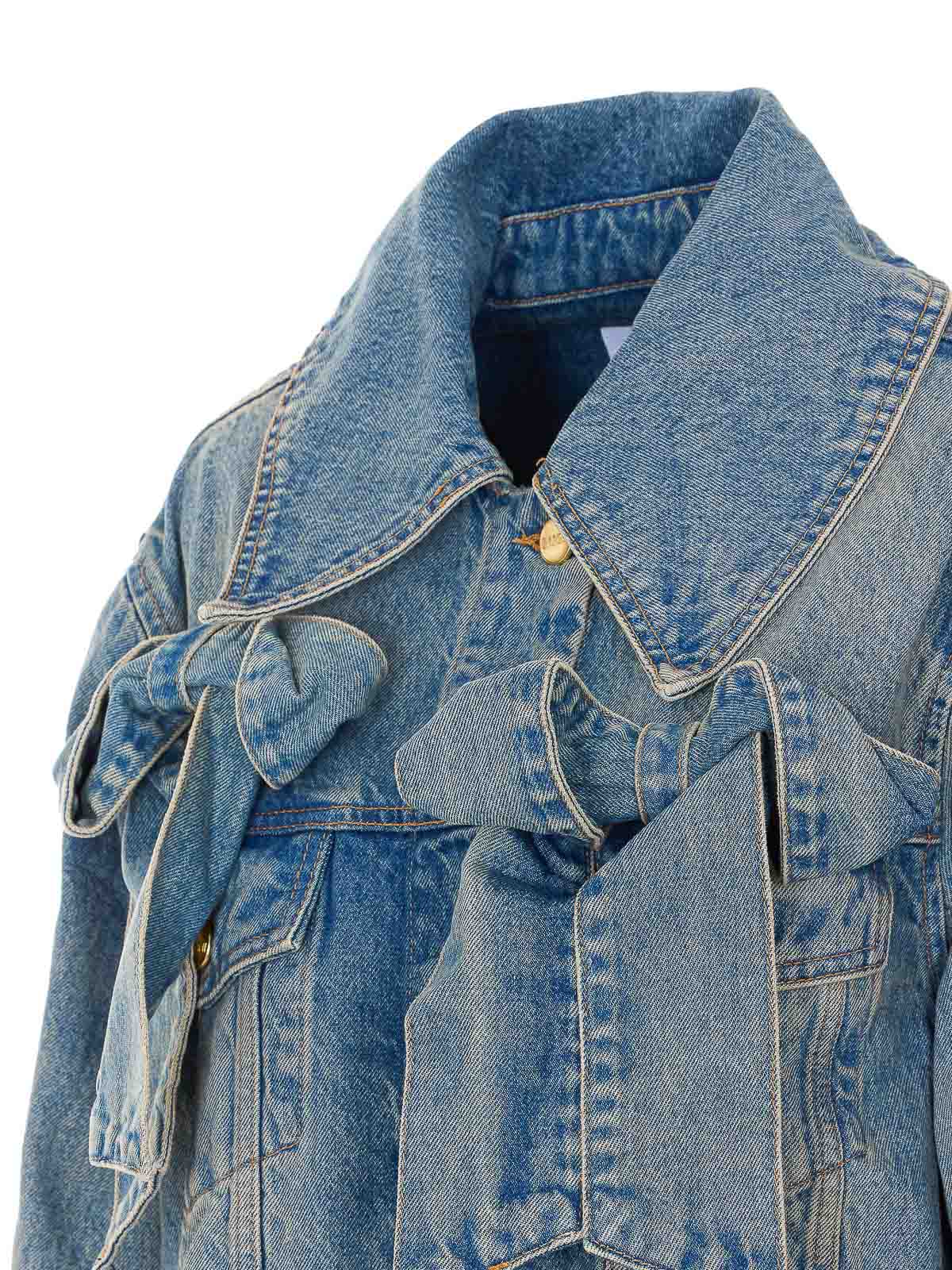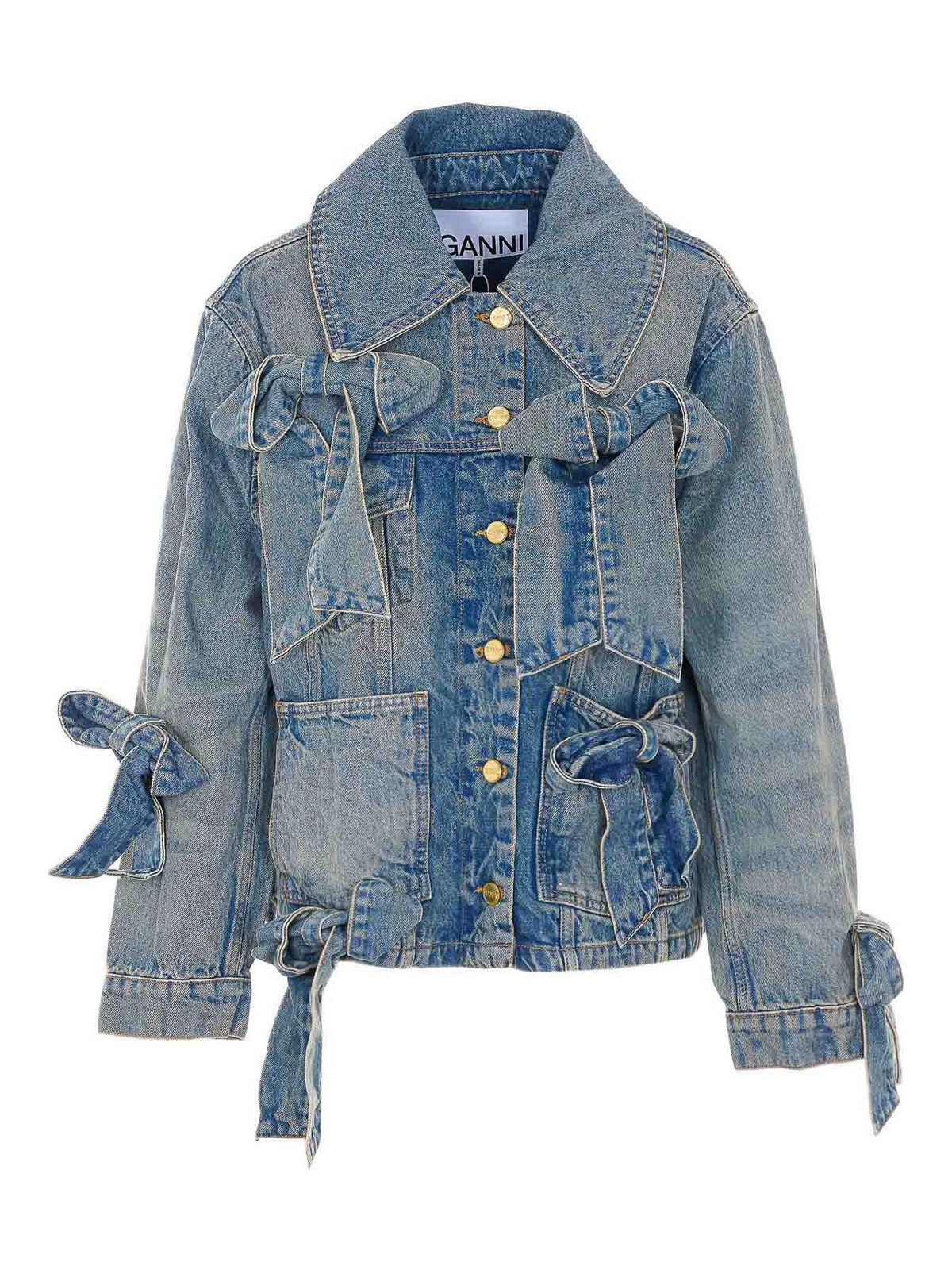 Ganniデニムジャケット、フロントボタン留め、レギュラーカラー、フロントにリボンディテール、ロングスリーブ