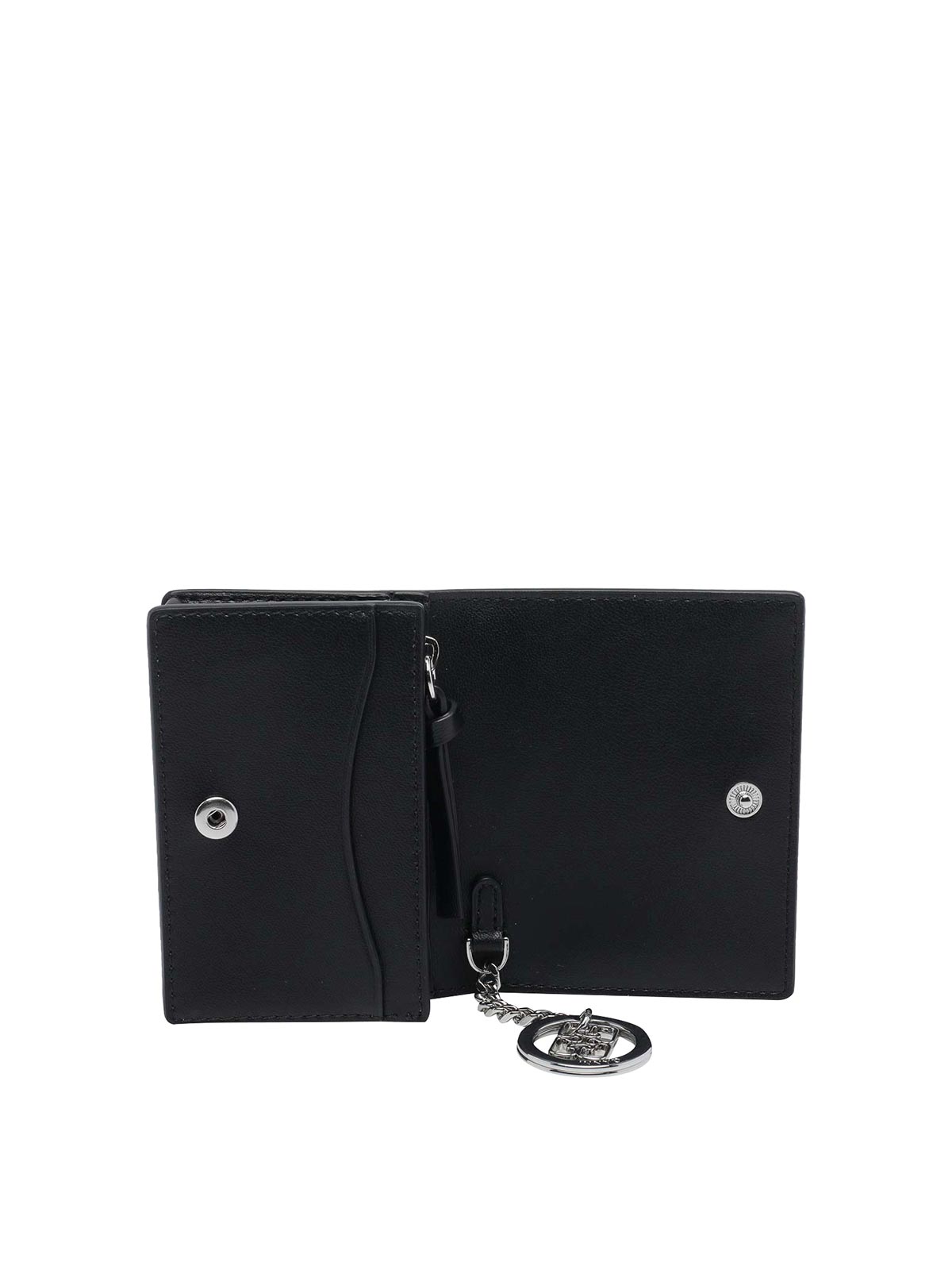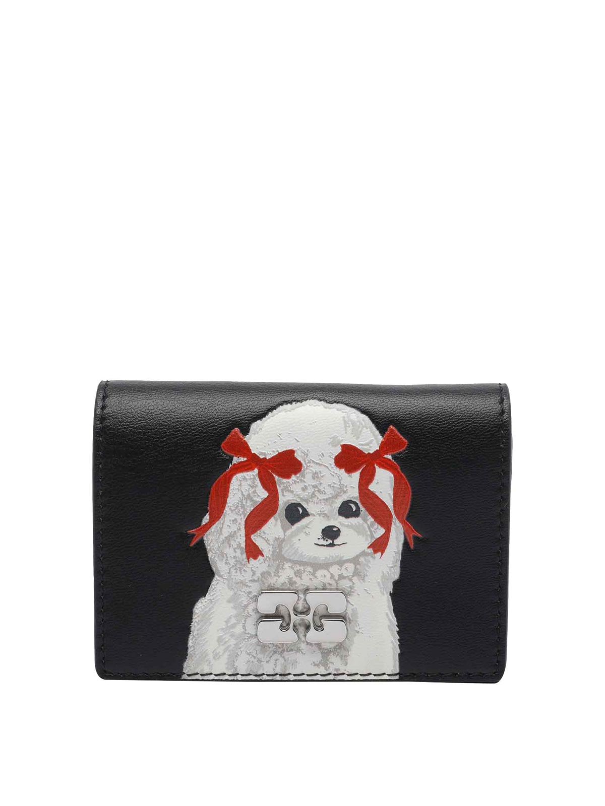 Ganniブラックカードホルダー、クリップクロージャー、内側スロット2つ、外部スロット1つ、ファスナー付き財布、前面にパピープリント
