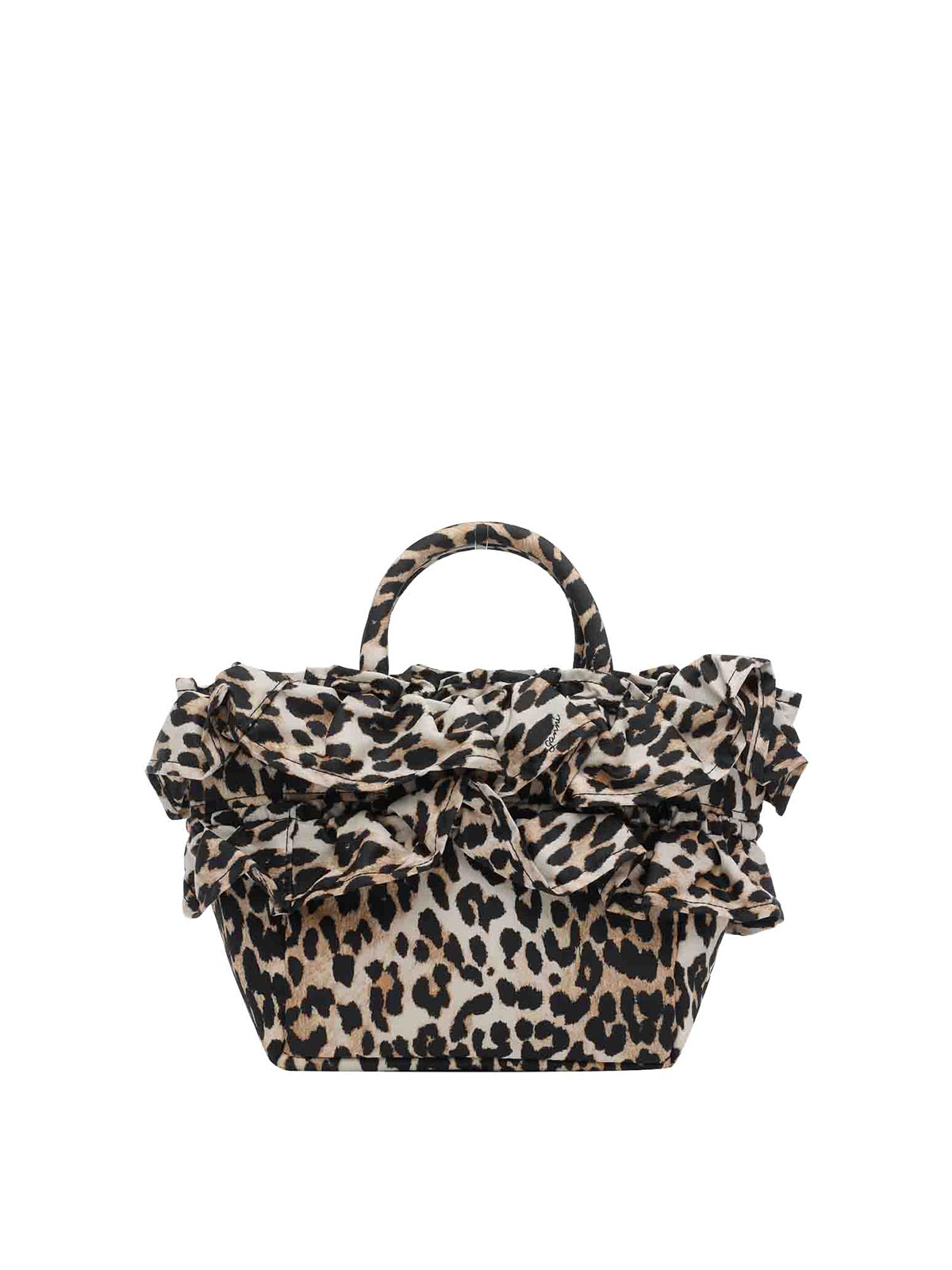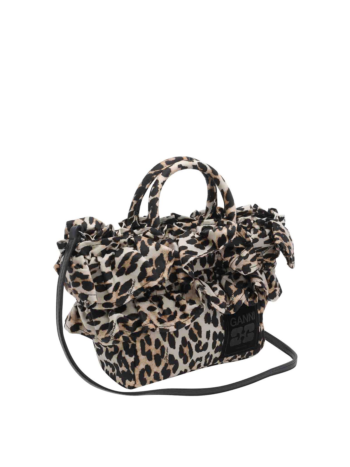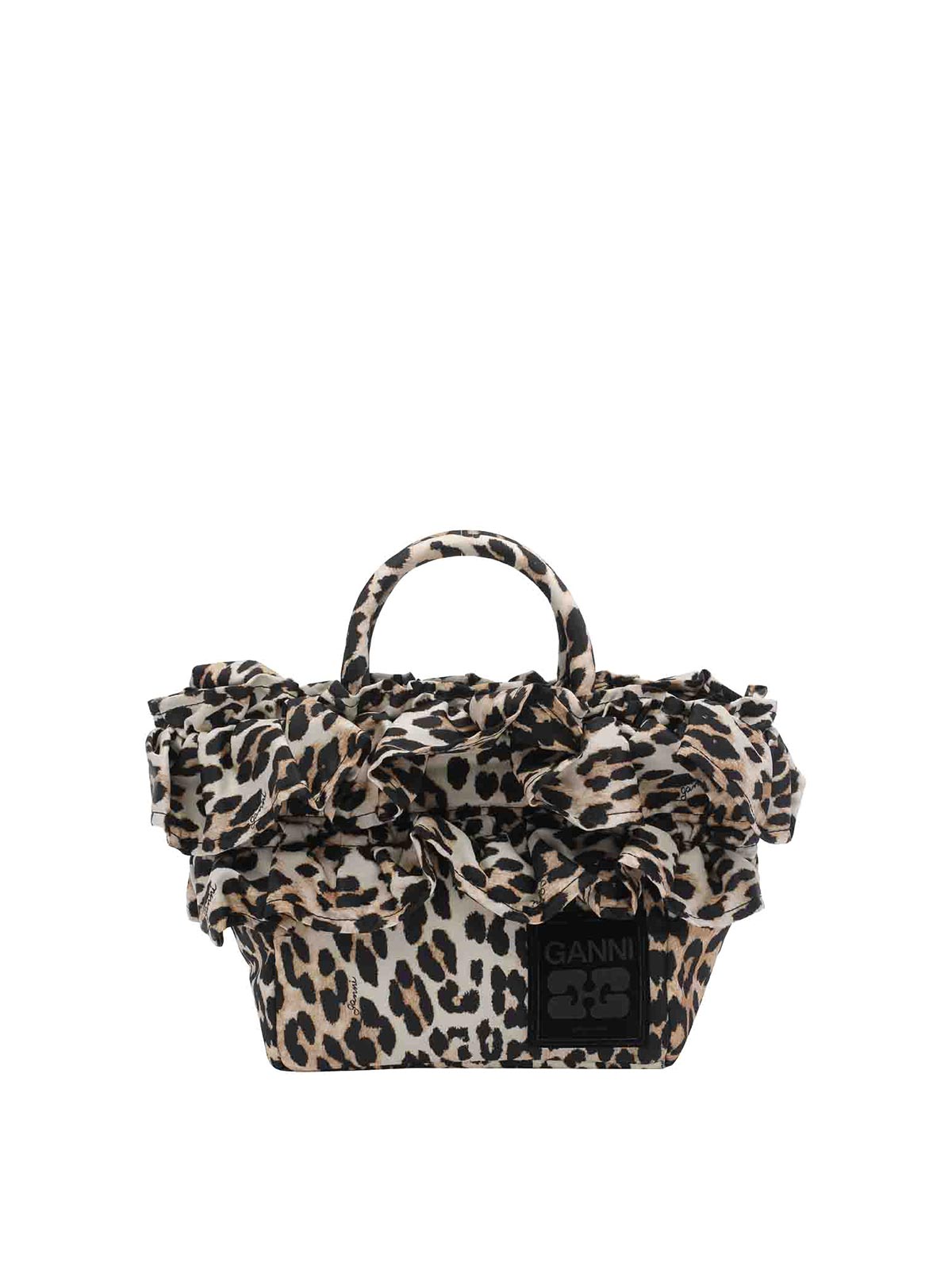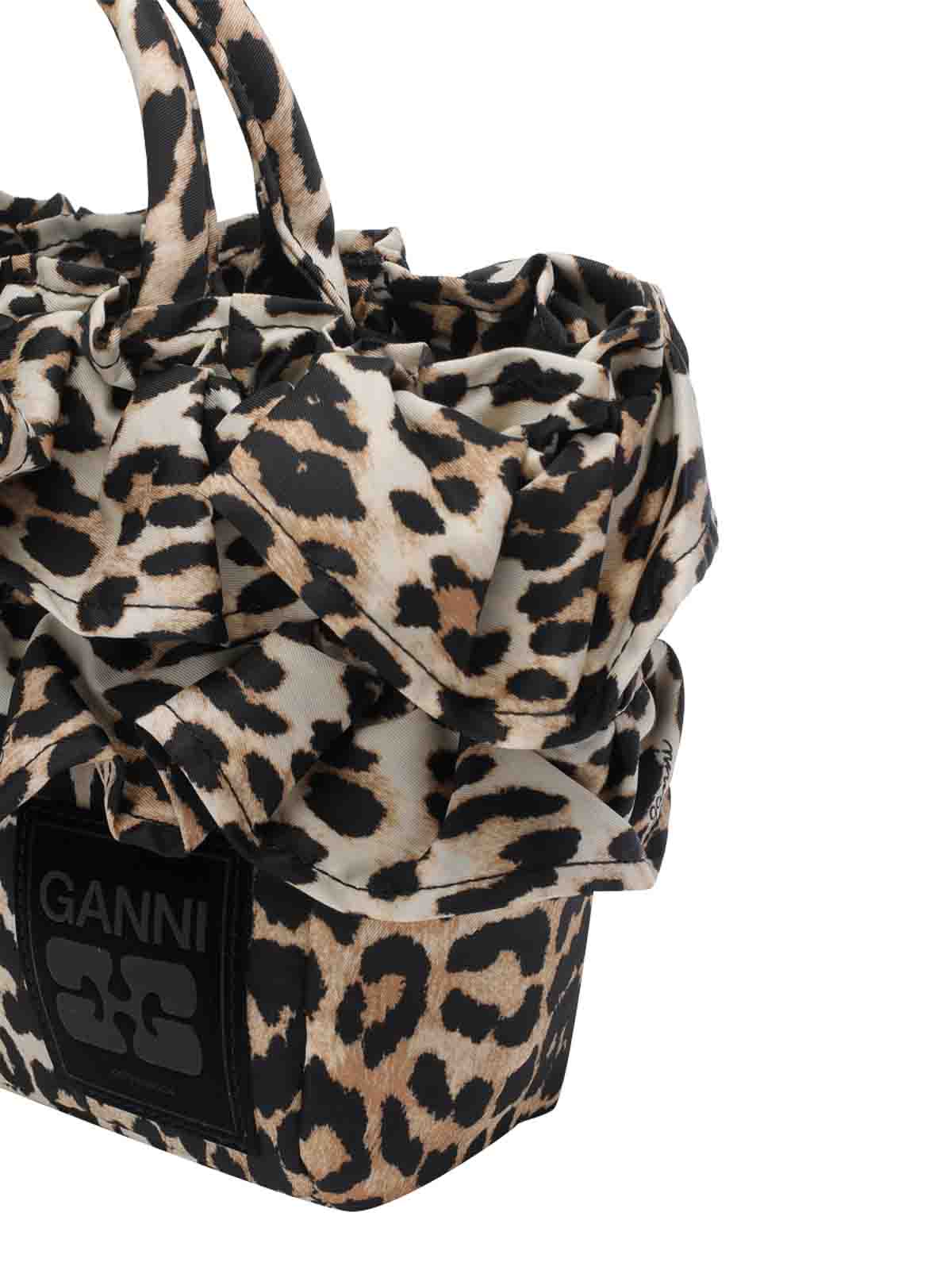 Ganniレオパードハンドバッグ、マグネットクロージャー、ファスナー付き内ポケット、オープンポケット1つ、ハンドル2つ、調節可能で取り外し可能なショルダーストラップ、前面にパッチロゴ、ルーシュディテール