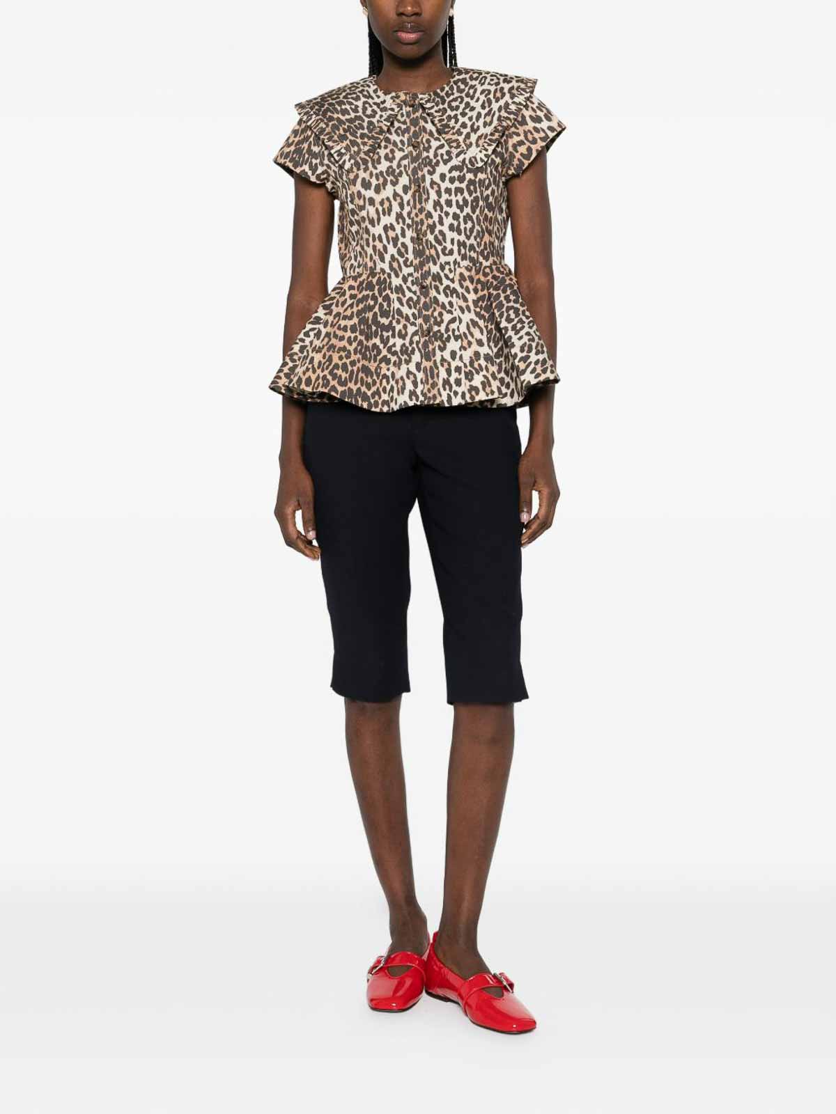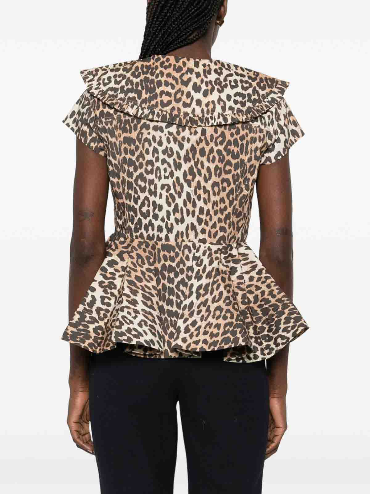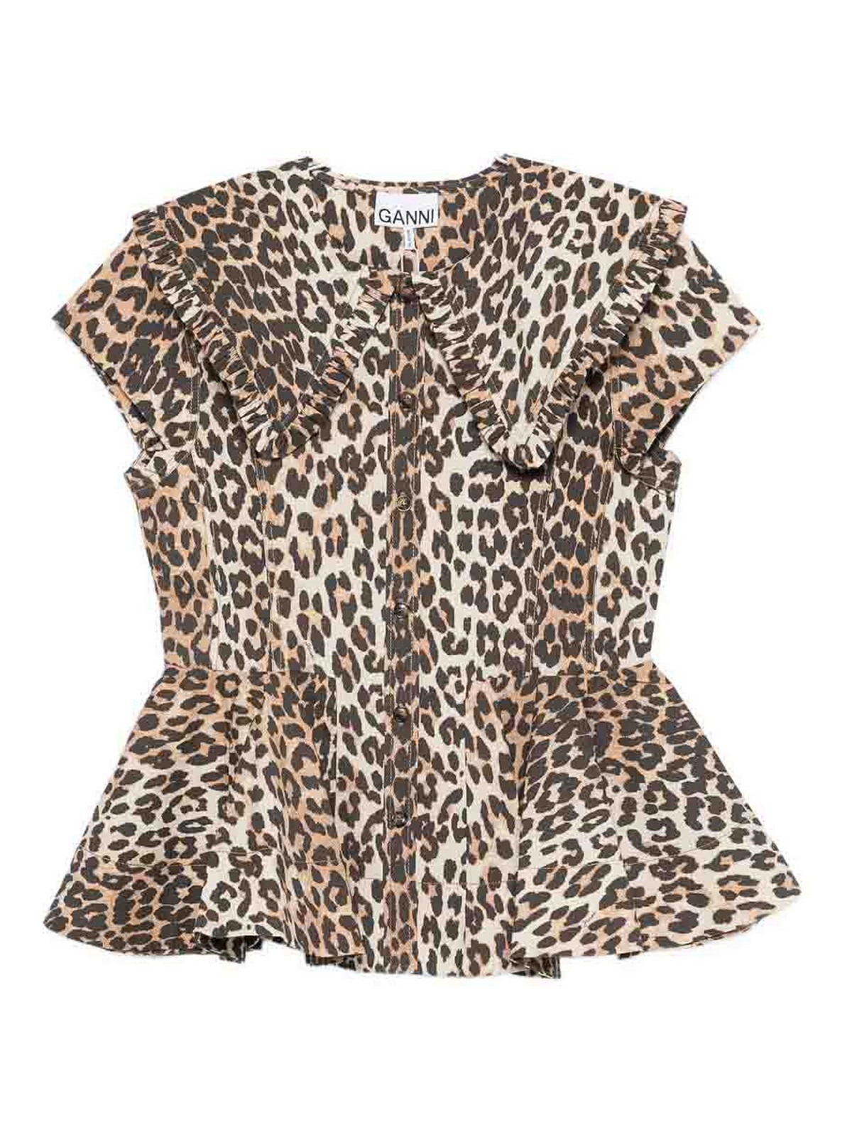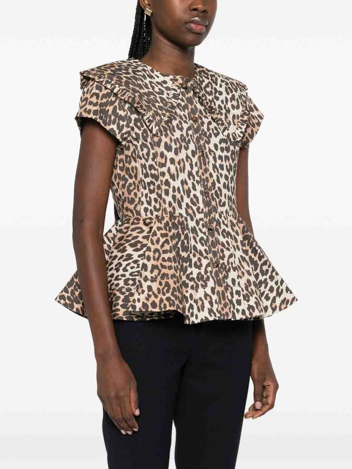 ブラウンレオパード柄フリルトリム半袖ペプラムヘムボタン留め