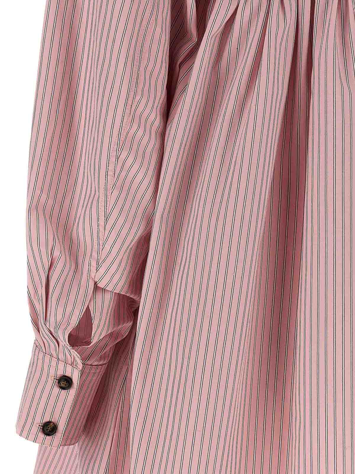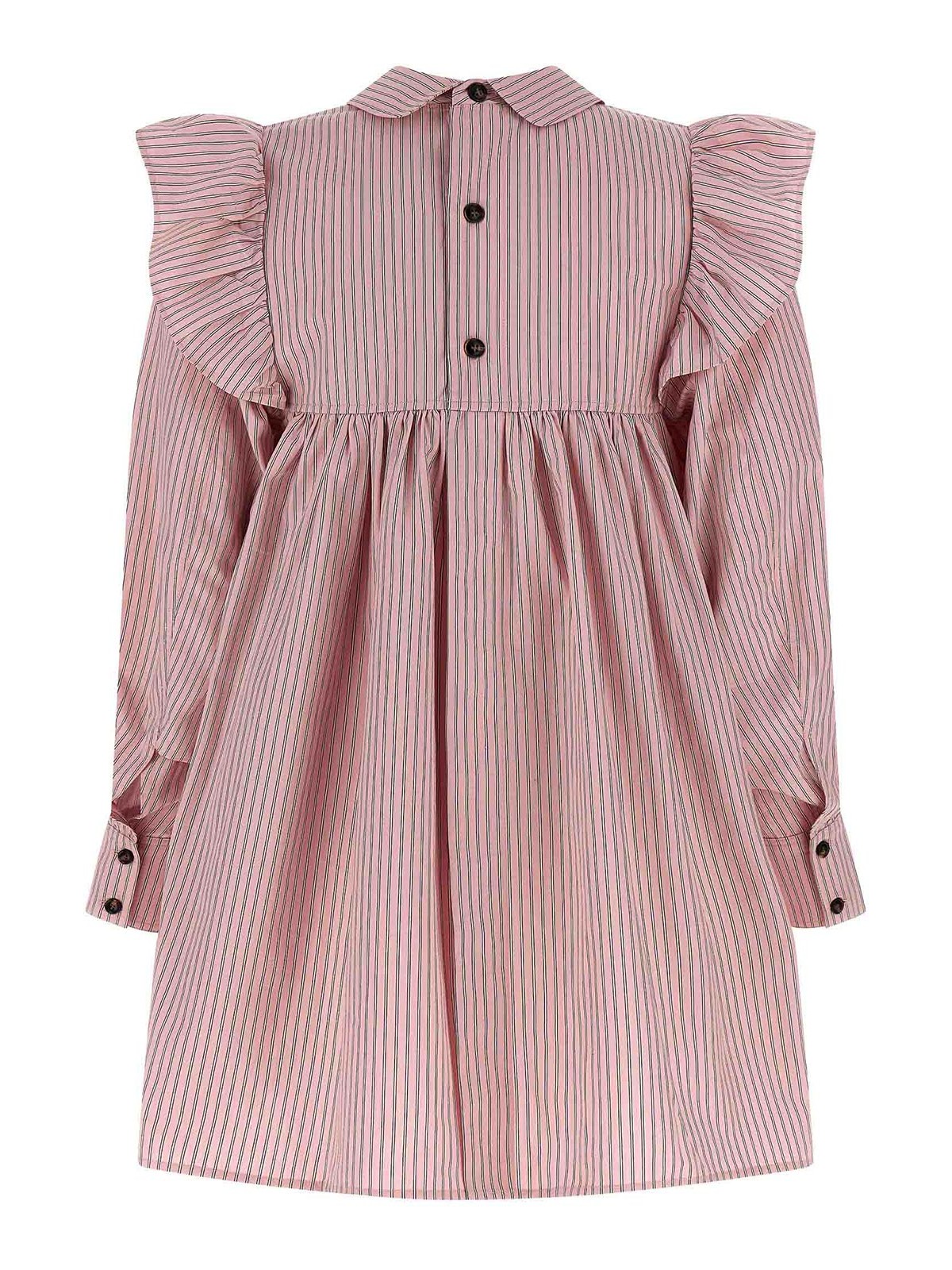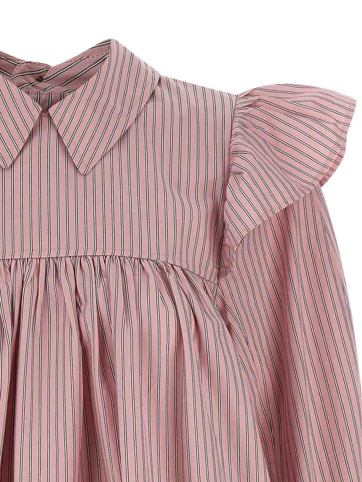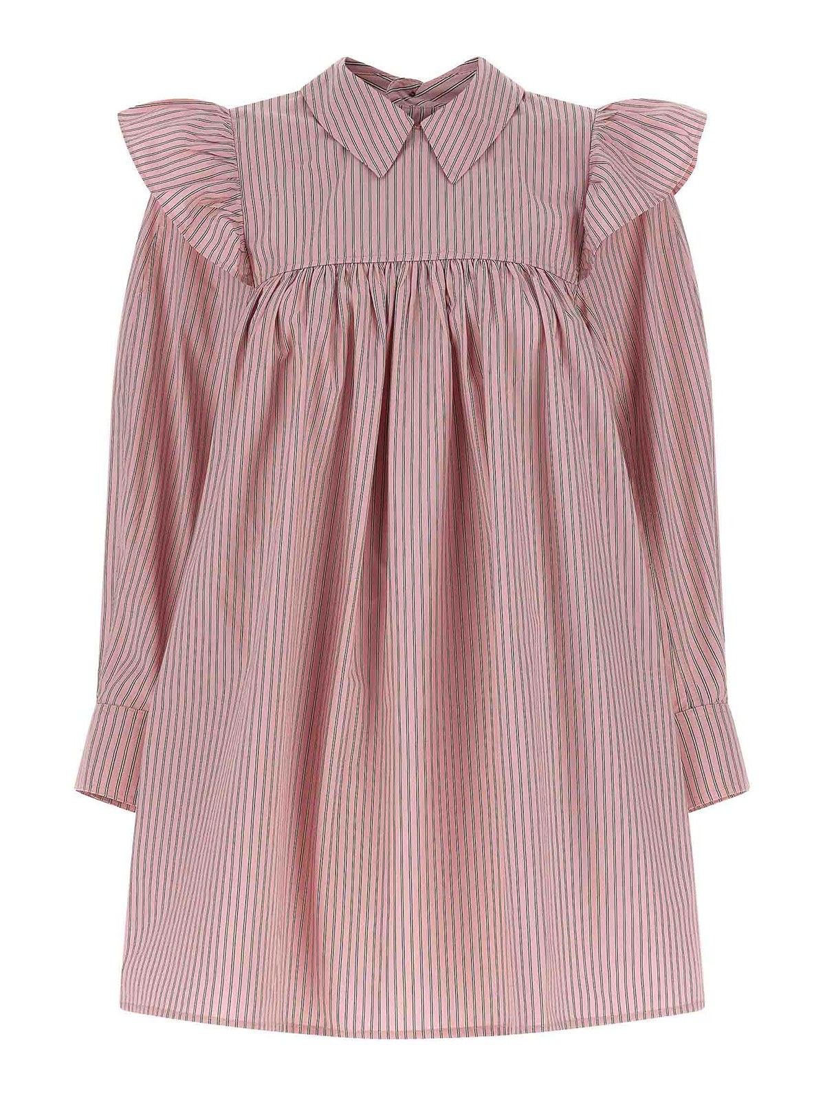 肩、襟、後ろにボタン留め、長い袖口が付いたオックスフォードコットンのストライプのミニドレス。