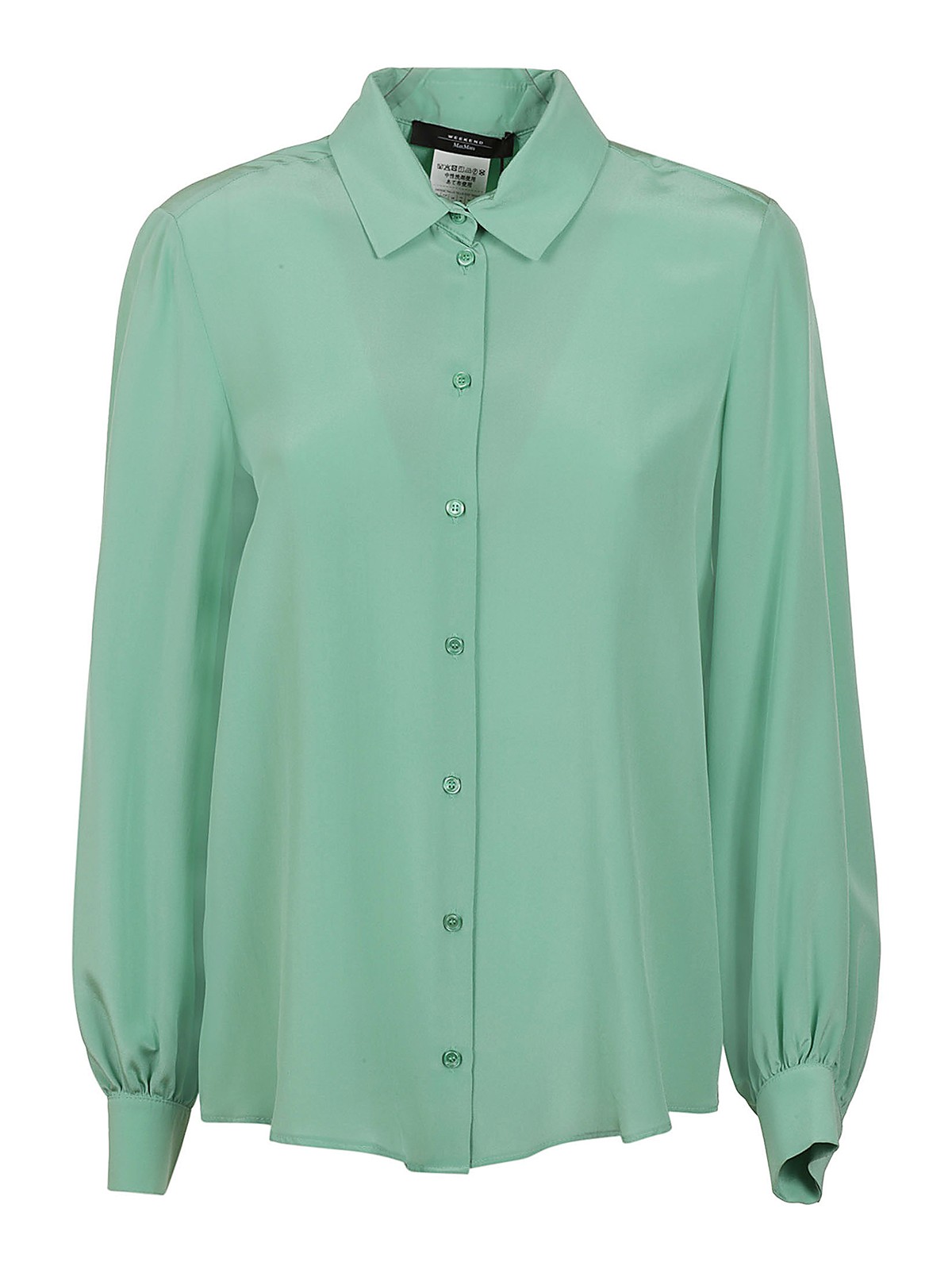 ミントカラーのクレープデシンシャツマザーオブパールボタンプラケットポインテッドカラー長袖袖袖口とボタンヨークバック付きレギュラーフィット