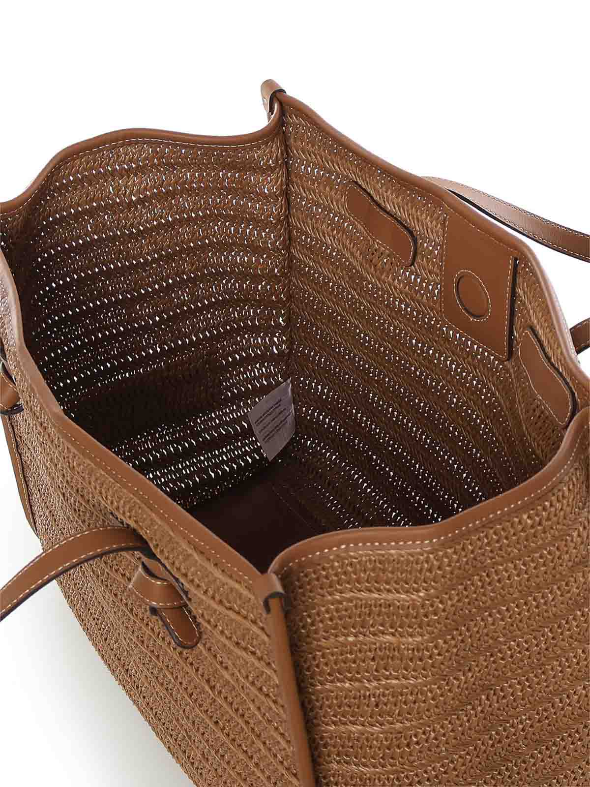 ウィッカー効果のあるストロー製、マグネットクロージャー、レザートップハンドル、寸法:38 x 31 x 16 cm、デザイナーカラー:キャラメル