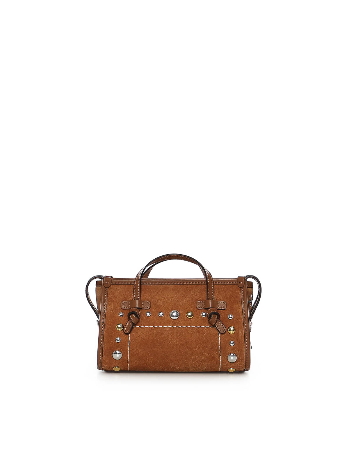 スエード製、ファスナー開閉、レザートップハンドル、手持ちでもクロスボディでも持ち運び可能、イタリア製、寸法:23 x 13.5 x 8.5 cm、デザイナーカラー:キャラメル