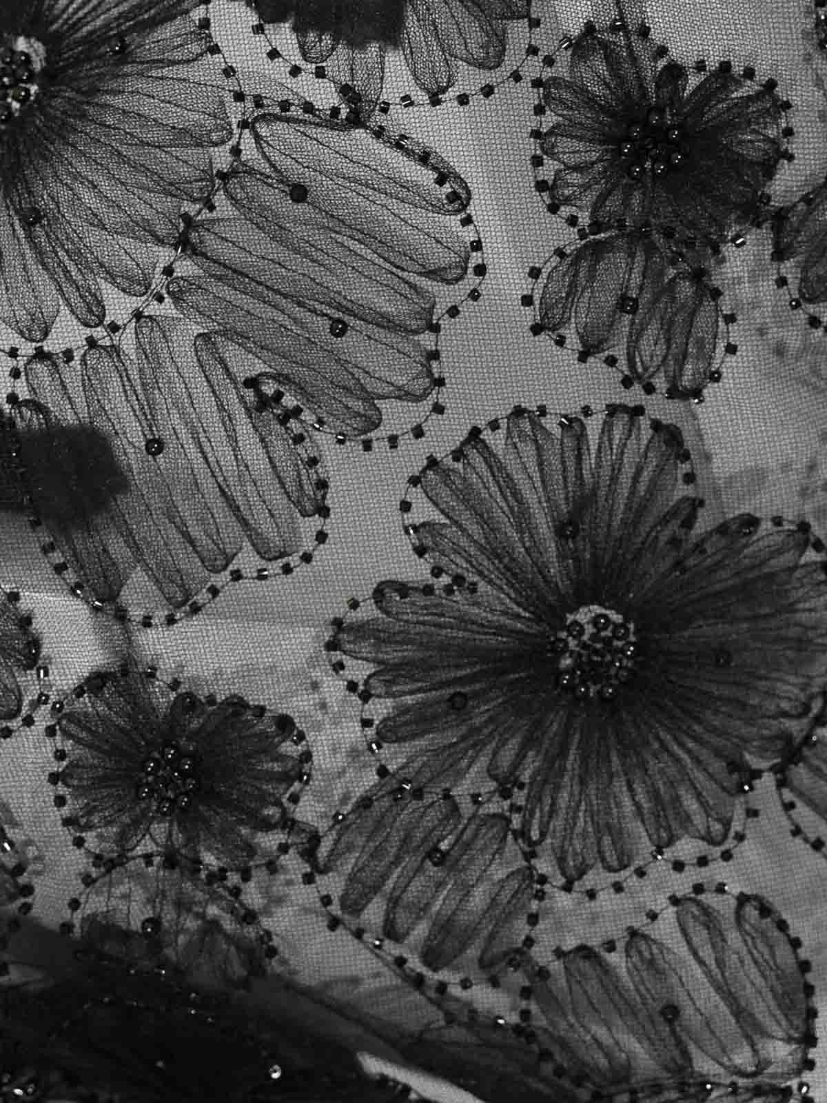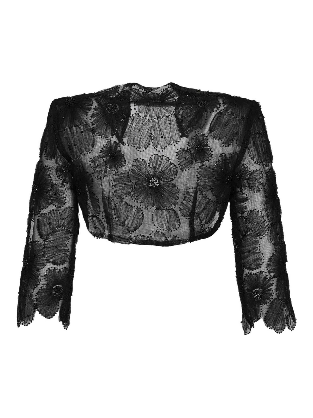 刺繍レースの女性用ジャケット、Gianni Molaro、ボレロモデル、生地:刺繍入りレース、パターン:花柄、袖:ロングフィット、襟:襟なしでオープン、クロージャー:クロージャーなしでオープンフロント、ポケット:なし、ディテール:透明な仕上がり、ビーズと微細加工を施したレリーフ状の花柄刺繍、ショートボレロカット、エレガントで洗練された効果、裏地:いいえ、フィット:スリム