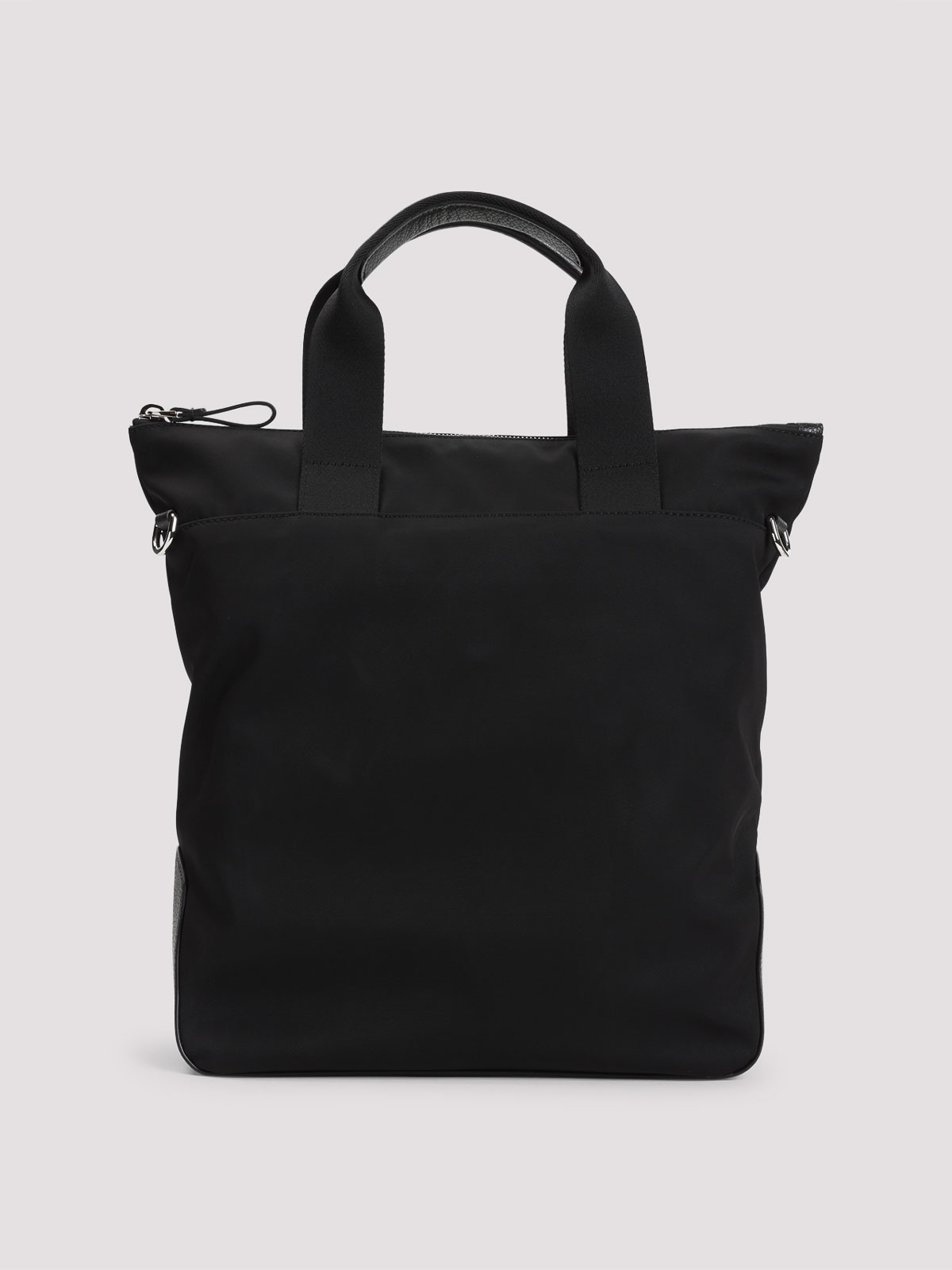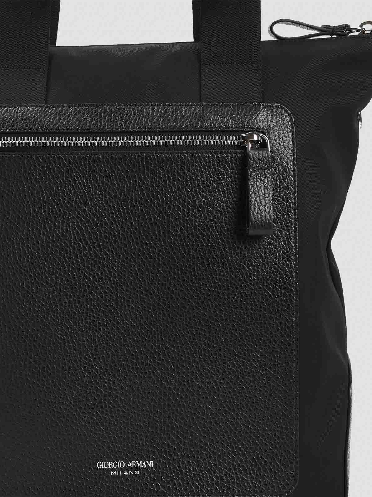 ジョルジオアルマーニブラックショッピングバッグ。ポリエステル生地製。トップハンドル、トップジップファスナー、フロントジッパー付きレザーポケット、フロントシルバートーンのレタリングロゴ、調節可能で取り外し可能なショルダーストラップ、メインコンパートメント1つ。