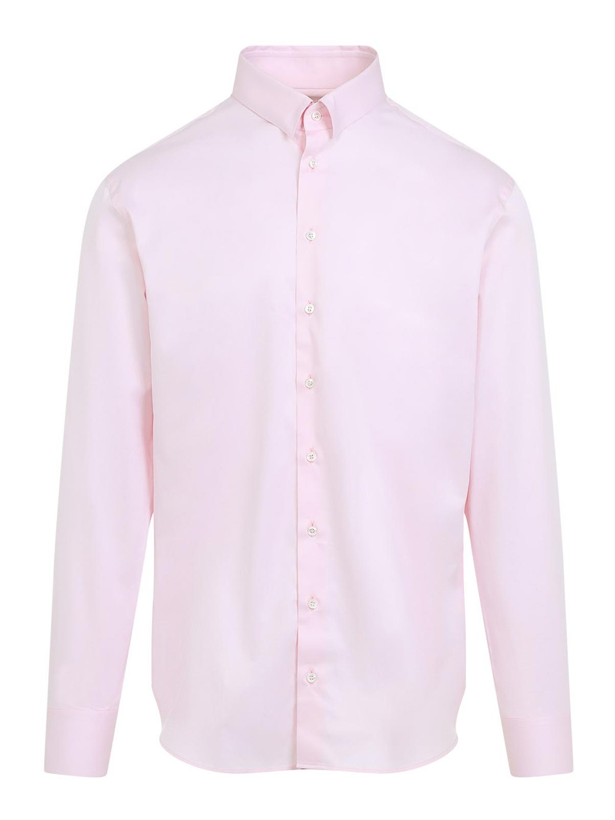 ジョルジオアルマーニライトライラックコットンシャツ。ピュアライトライラックコットンシャツ、ポインテッドカラー、フロントボタン留め、長袖、ボタン付きカフス、ラウンドヘム。