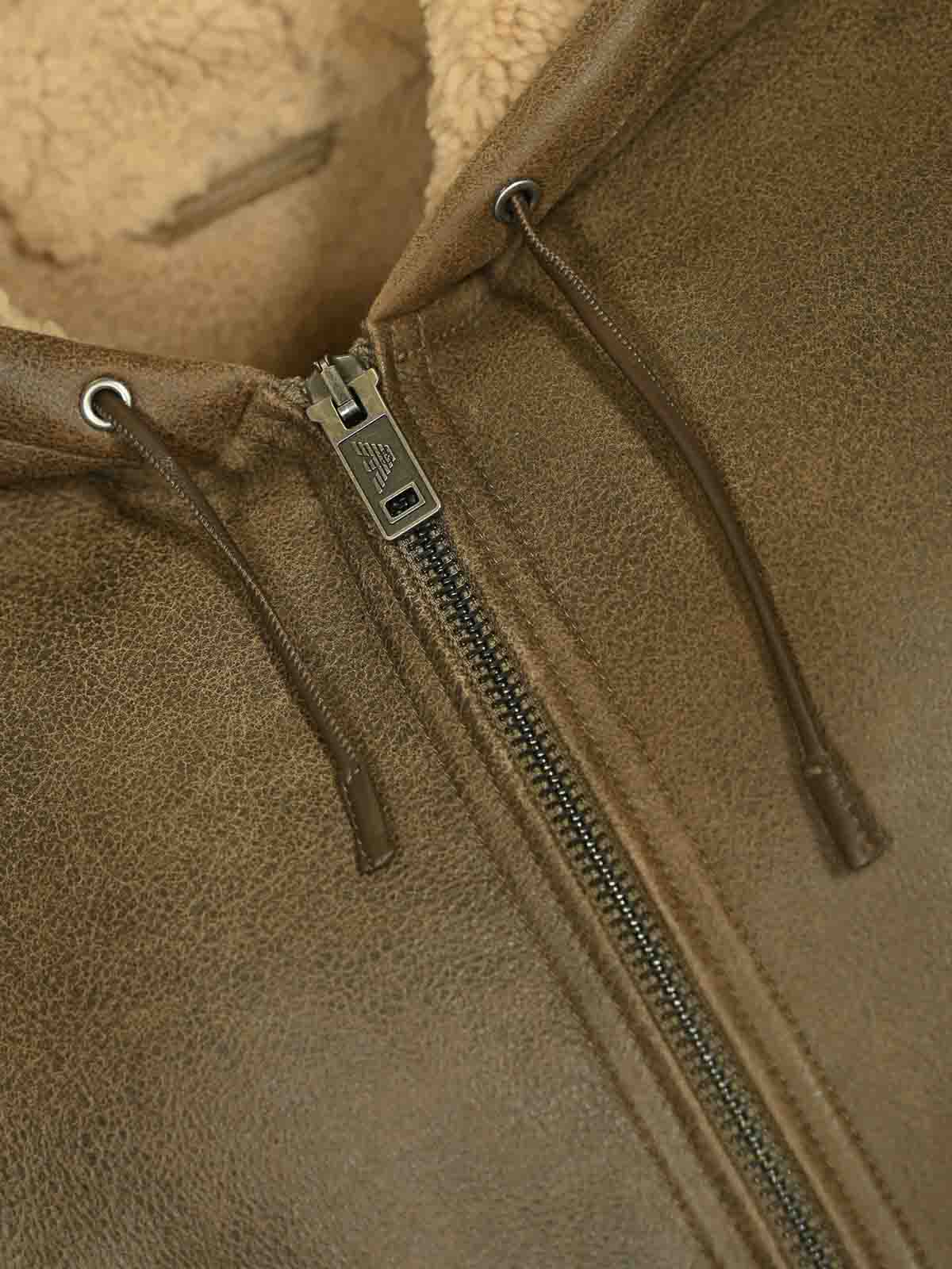 ラムブレンドアンティークジャングル仕上げリブ編み長袖、調節可能なドローストリングフード、ダブル、スライダー、ジッパー、サイドポケット、ロゴパッチ、オーバーサイズフィット
