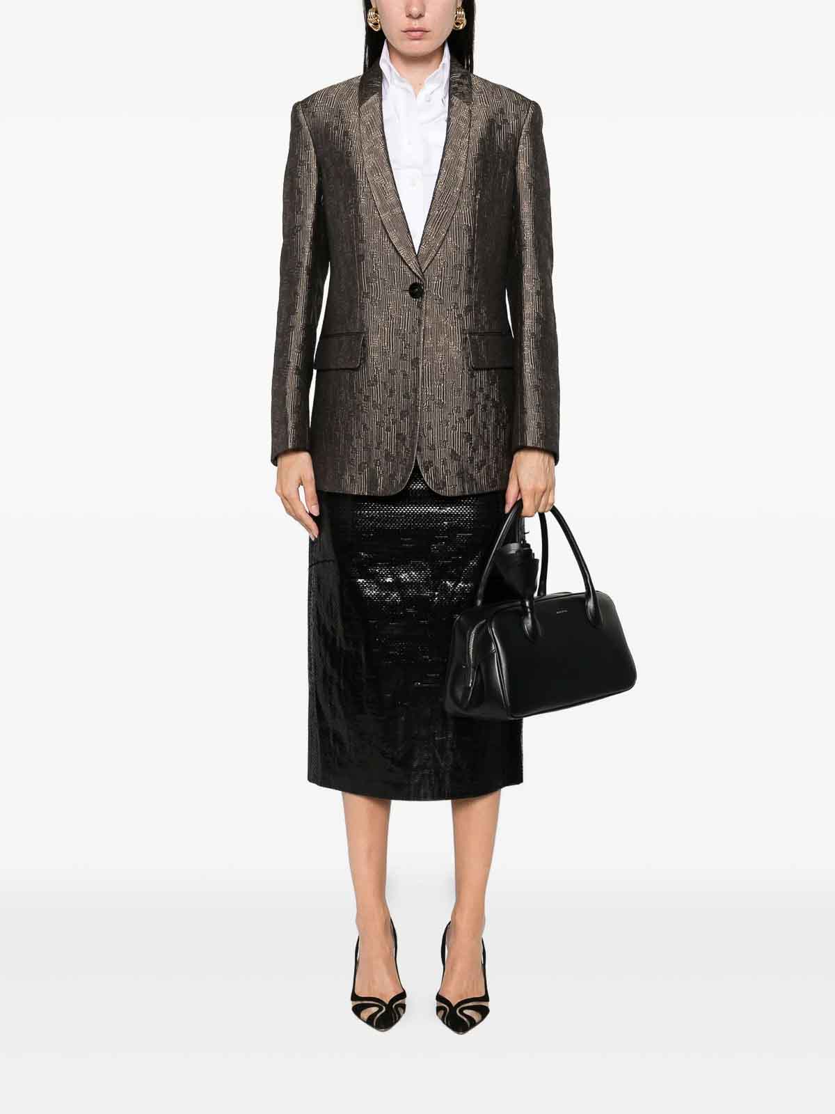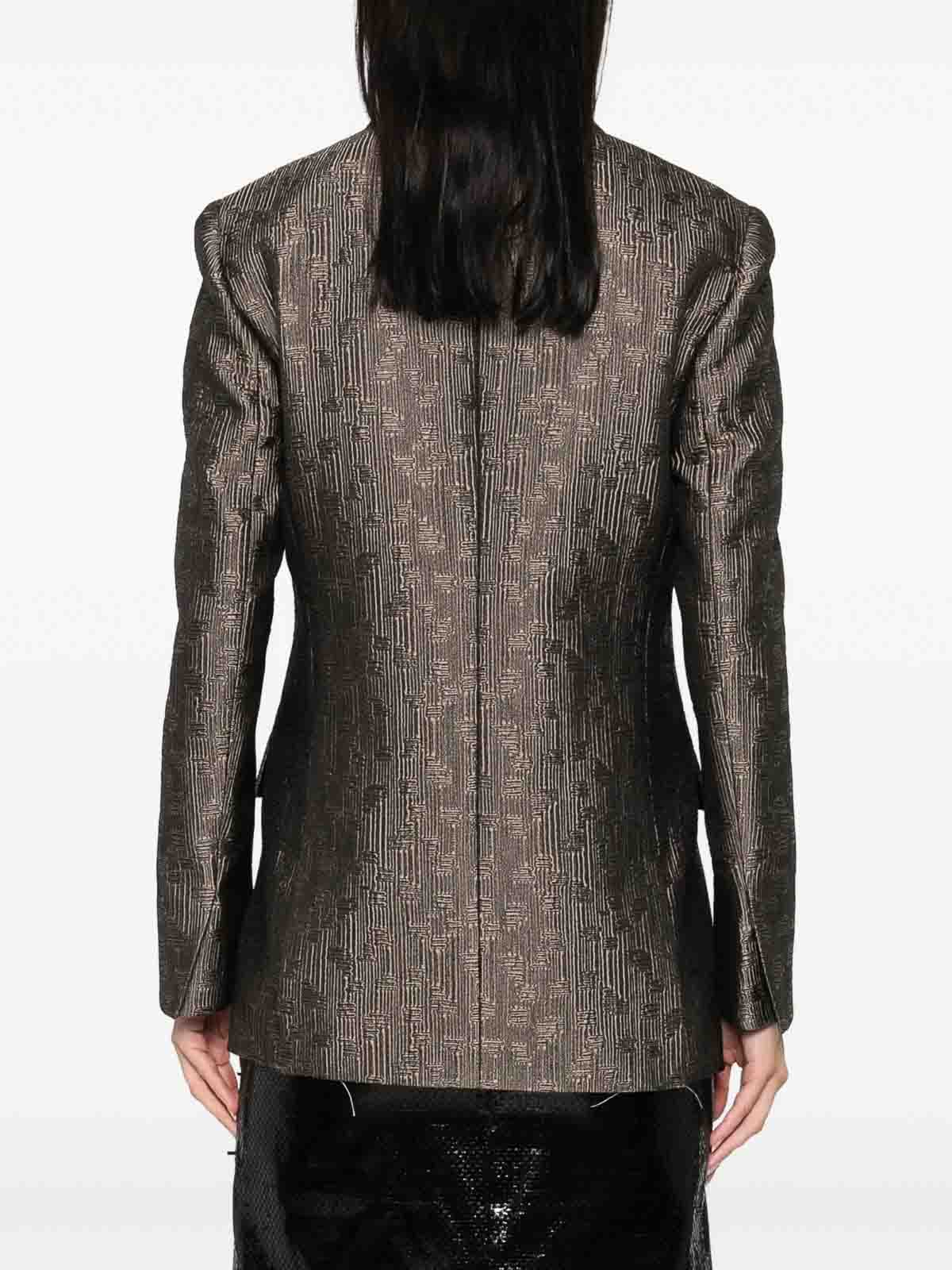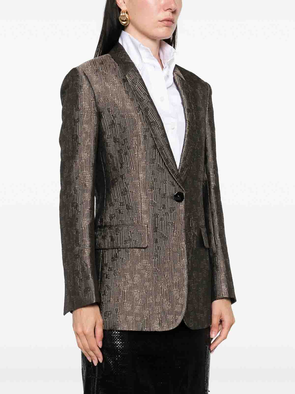 シルクとジャカード織りのシングルブレストジャケット。不規則な幾何学模様のモチーフをあしらい、裏側をフォーム素材のショールポケットにレバーで留め、流れるような洗練されたエレガンスで、両性具有のインスピレーションを求めるなら、今すぐ見つけてください。