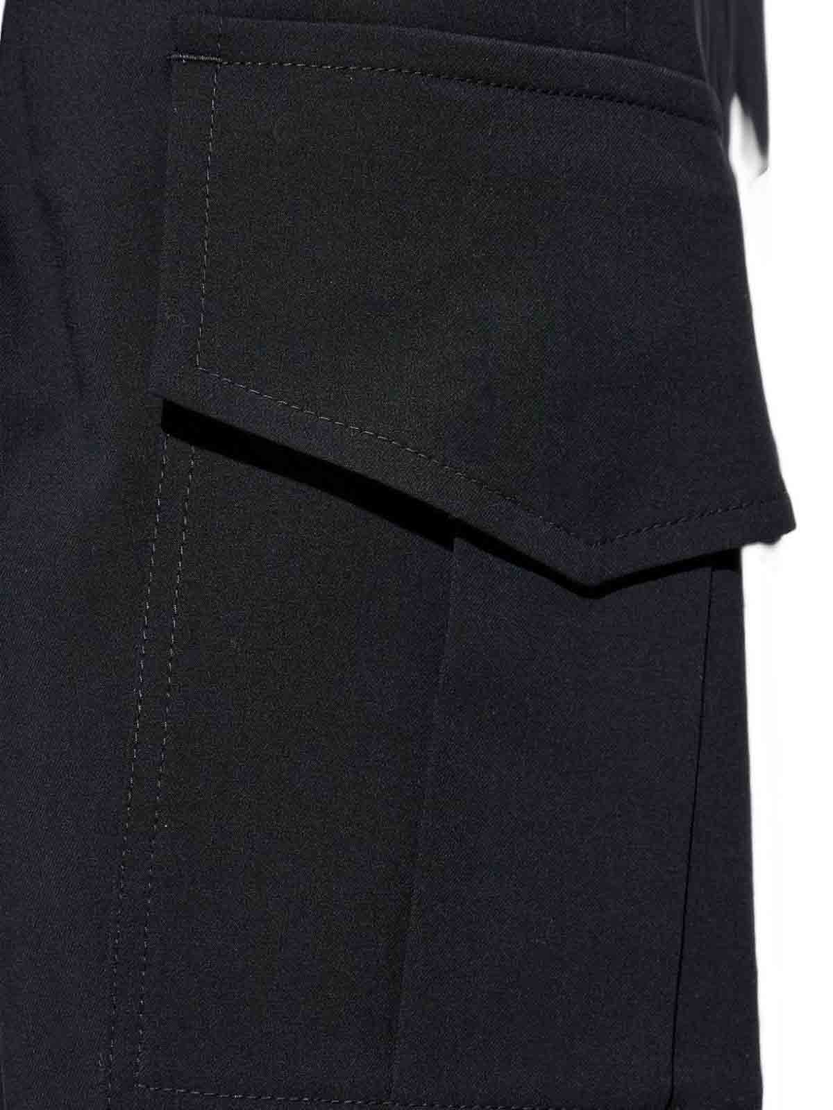 シングルプリーツパンツ、ベルトループ、ボタンとジッパー、サイドポケット2つ、フラップ付きパッチポケット2つ、バックウェルトポケット2つ、裾幅:20 cm