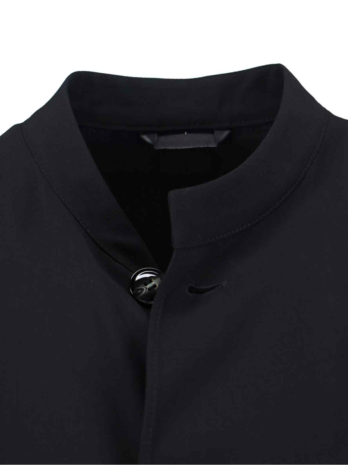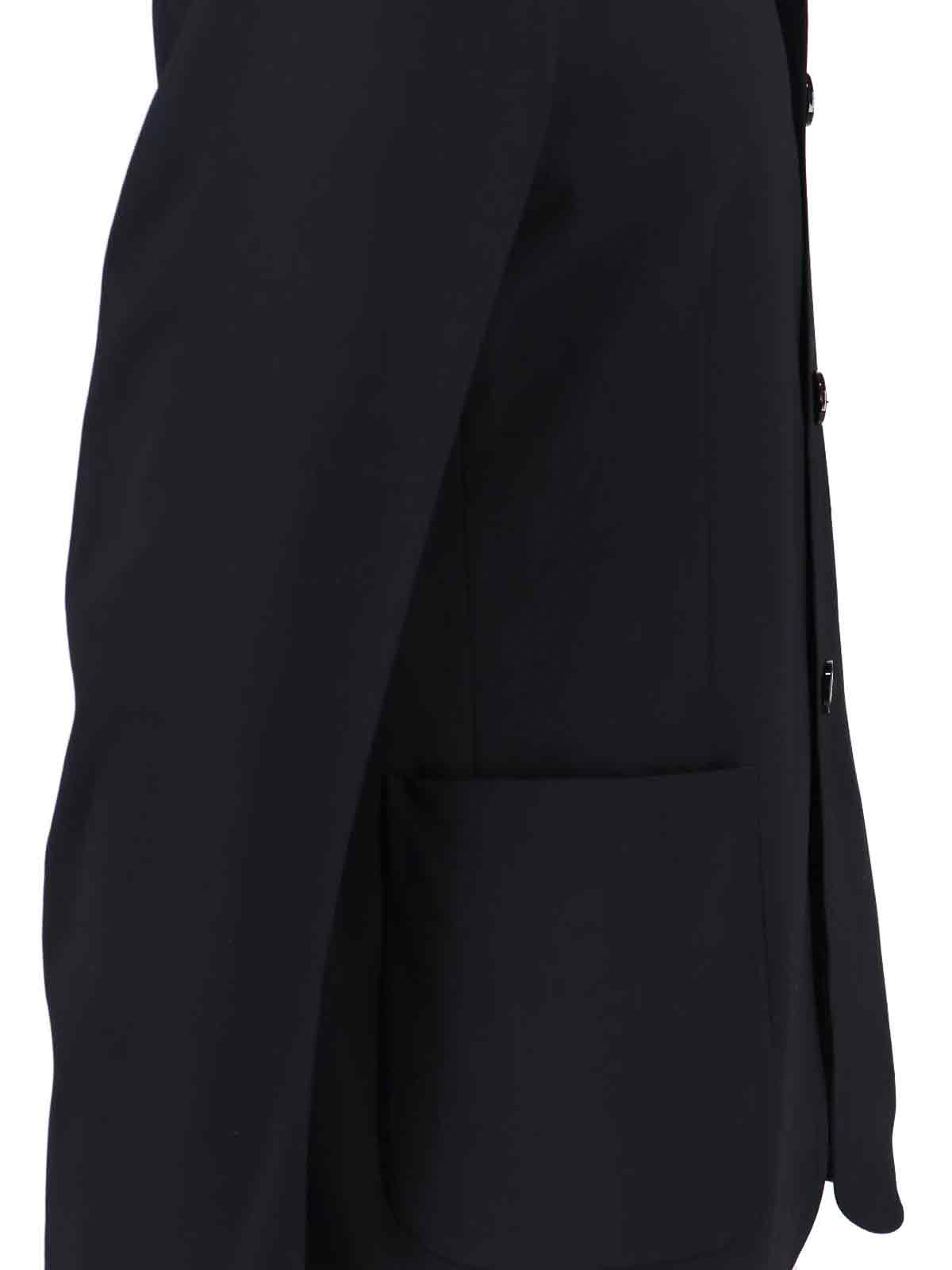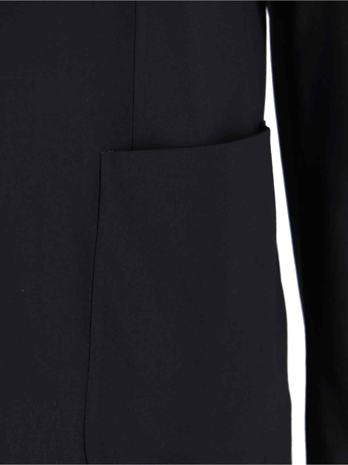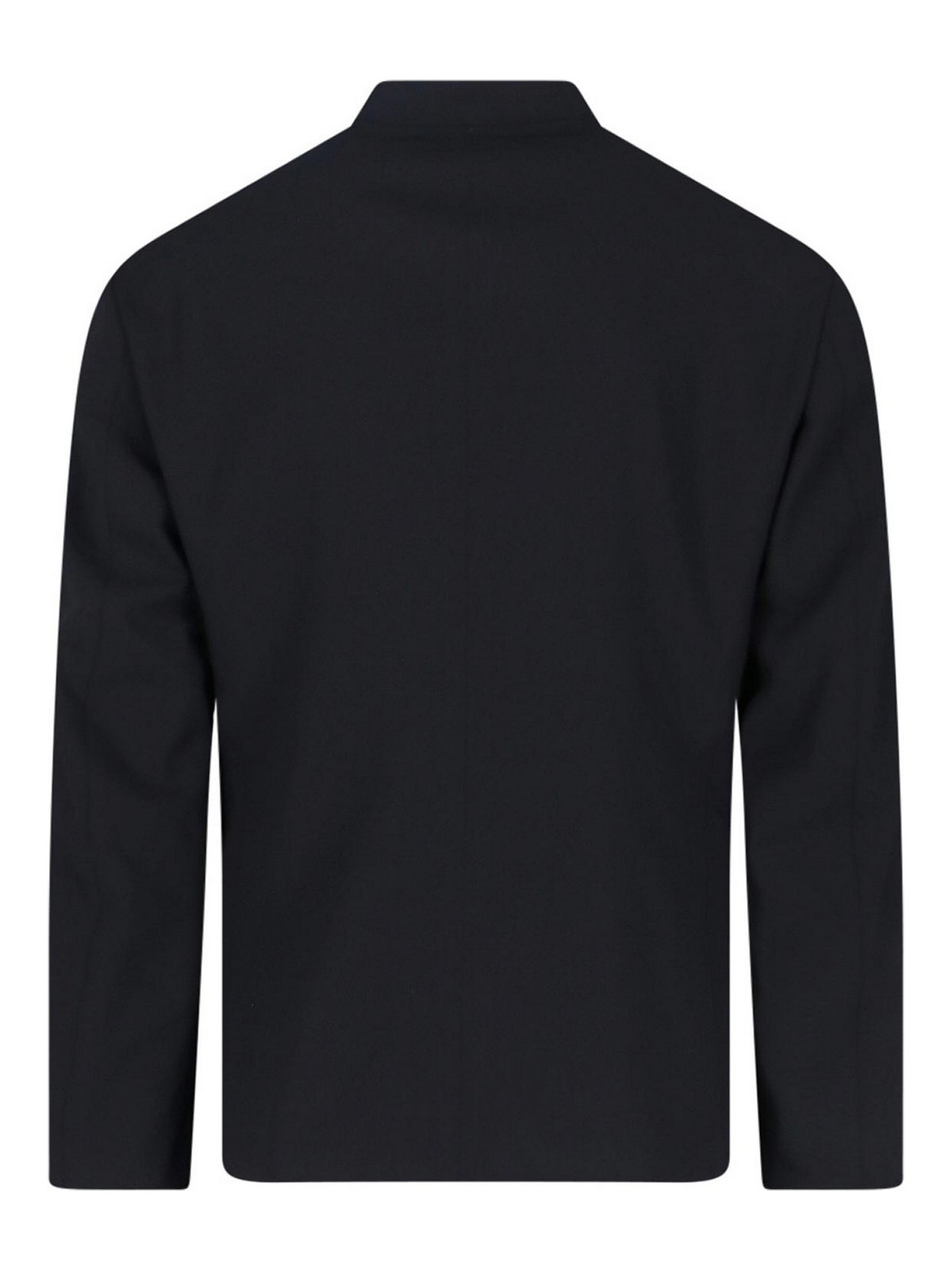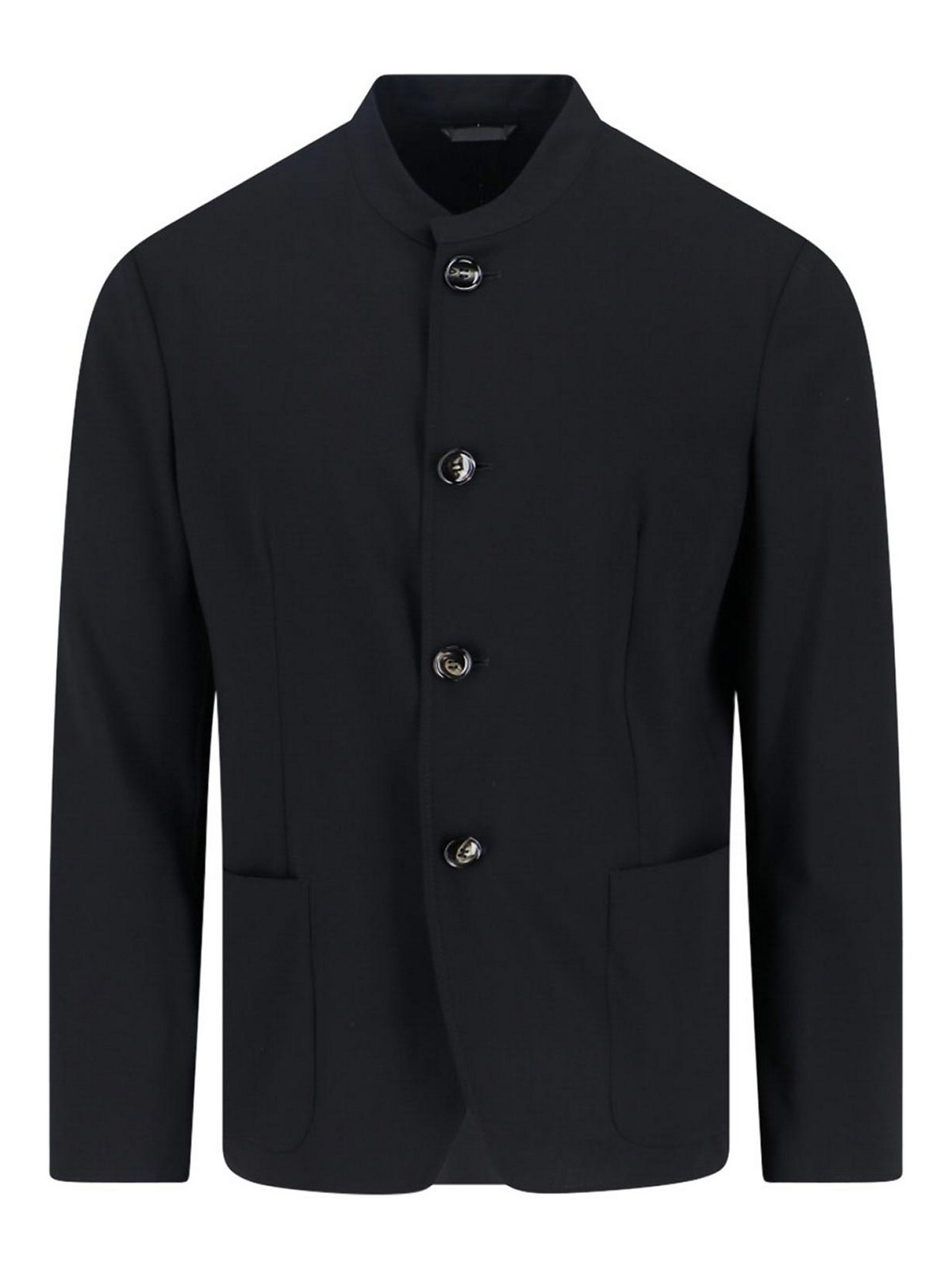 バージンウールのブレザー、ブラック、マンダリンカラー、フロントボタンクロージャー、ロングスリーブ、フロントポケット2つ、ストレートヘム。