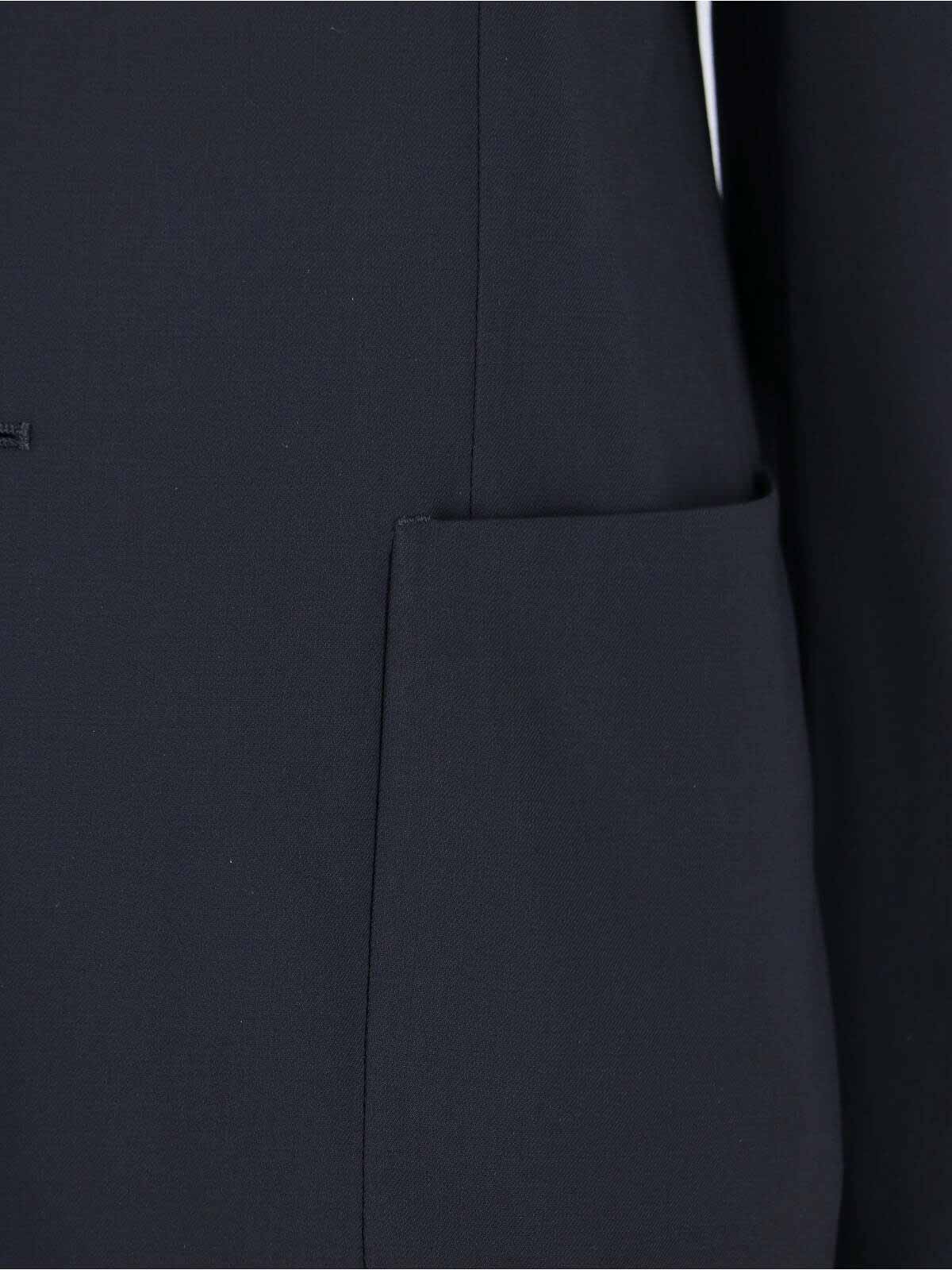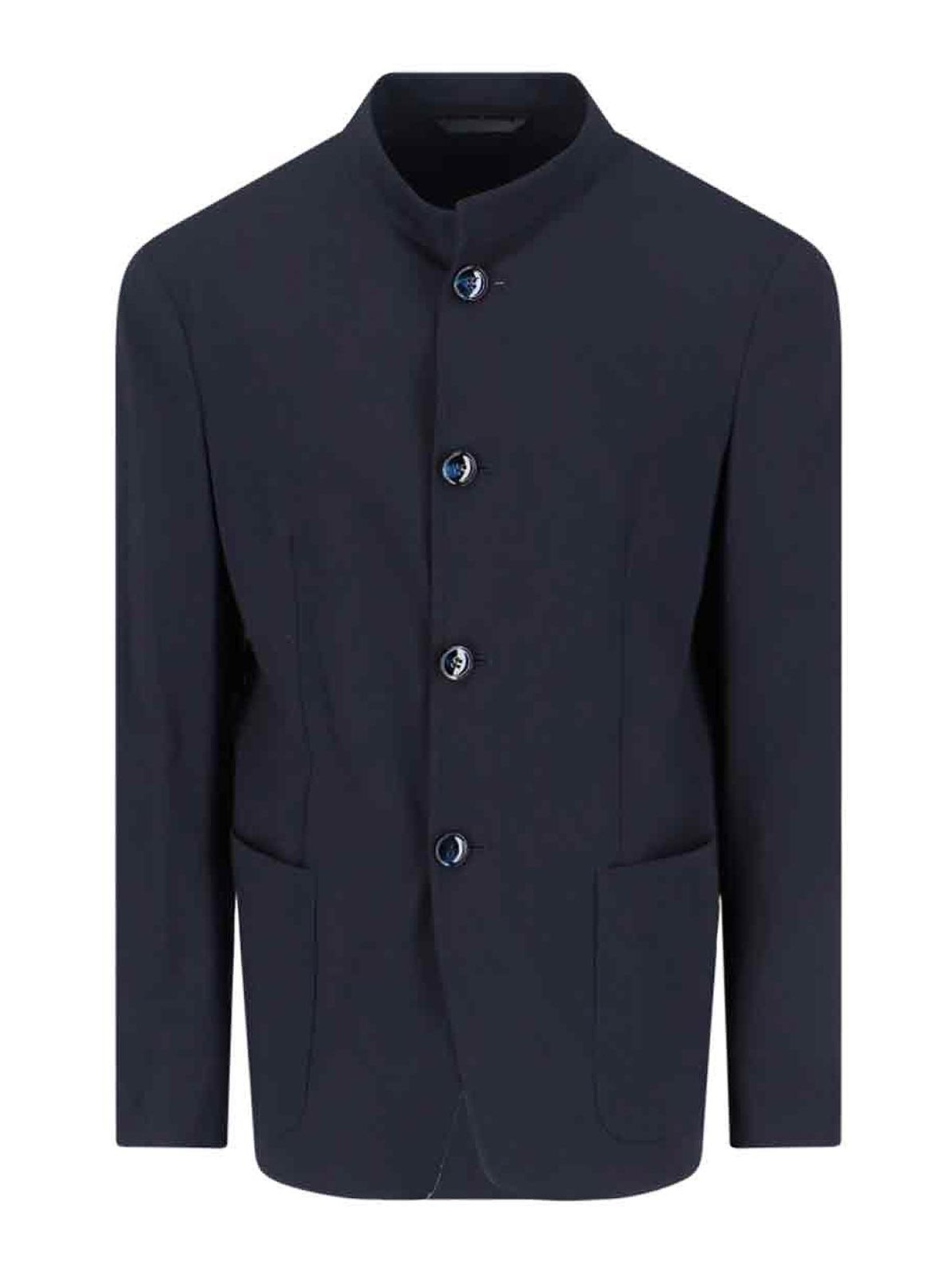 ジョルジオアルマーニバージンウールブレザー、ブルー、ダークシェード、マンダリンカラー、フロントボタンクロージャー、ロングスリーブ、フロントポケット2つ、ストレートヘム。