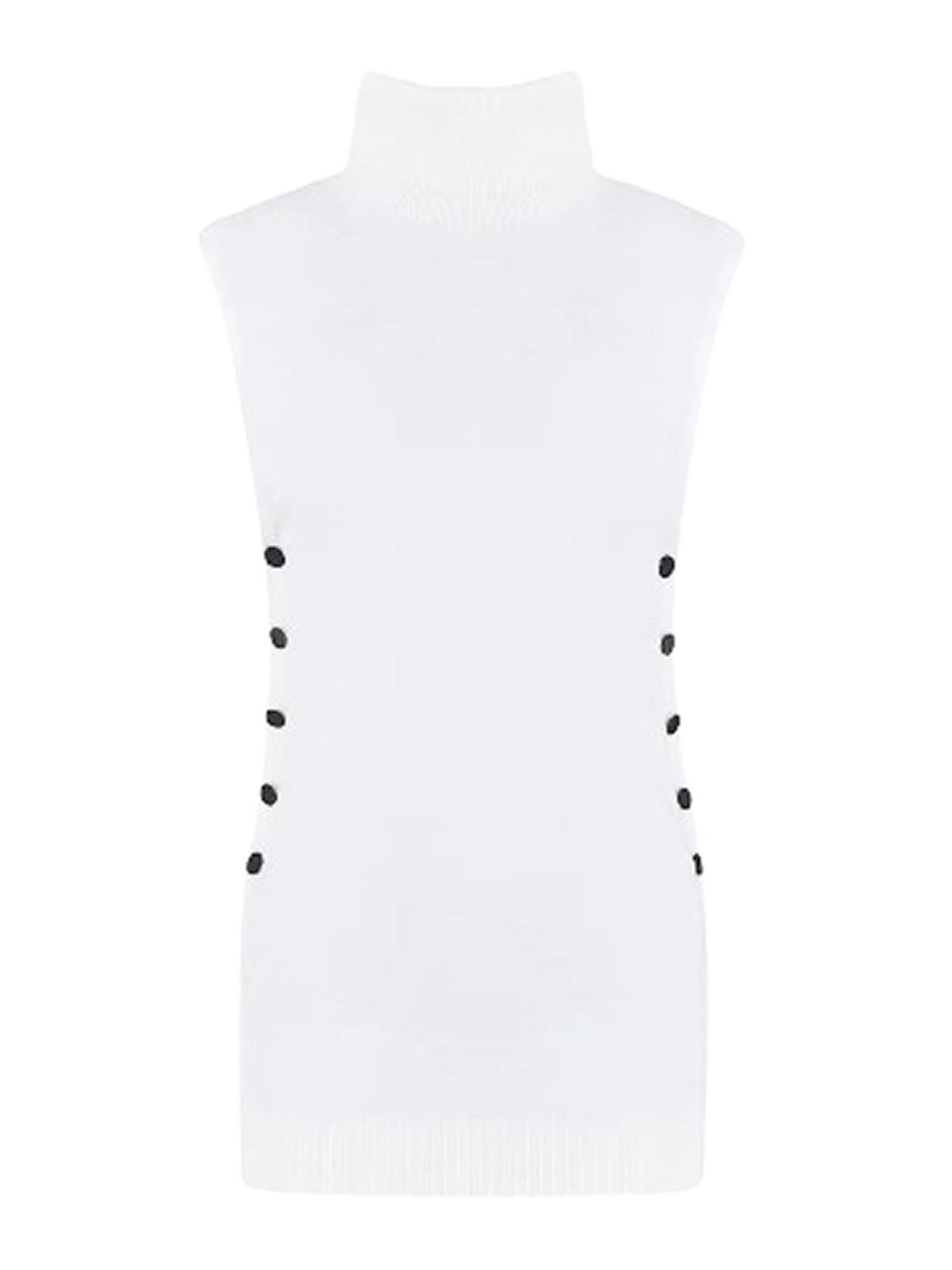 暖かくて柔らかいバージンウール製のモックネックトップ。コントラストカラーのボタンのディテールがあしらわれています。継ぎ目のないモデルには、パスパルトゥーと多彩なニュアンスがあります。シームレスモデルのモックネック、サイドスリットに沿ってボタンをあしらったノースリーブディテール、サイドスリット、アシンメトリーヘム