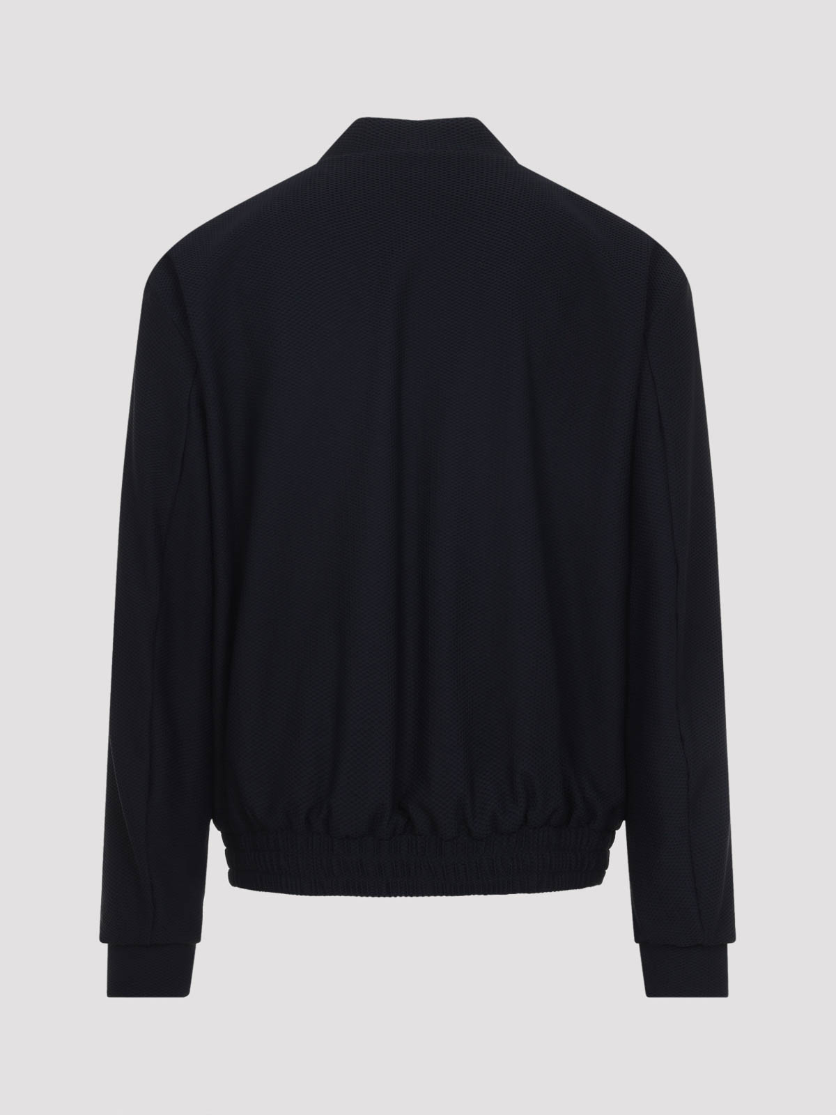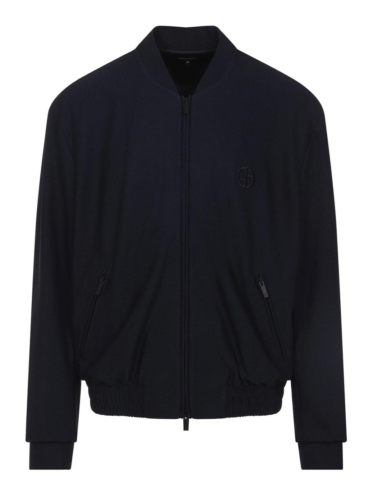 Giorgio armani ダークネイビーのブルゾンジャケット。ポリアミドとエラステインのブレンドで作られています。スタンドカラー、フロントファスナー、胸元ファスナー、胸元に同系色のロゴ刺繍、サイドジップポケット、ロングスリーブ、ストレートヘム。全体にメッシュデザイン。