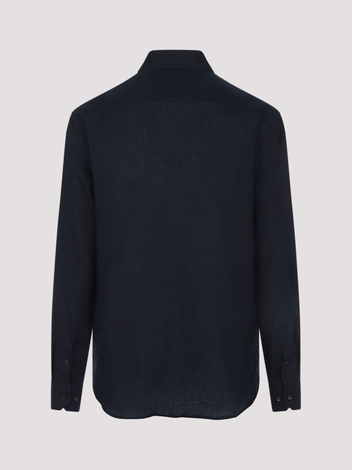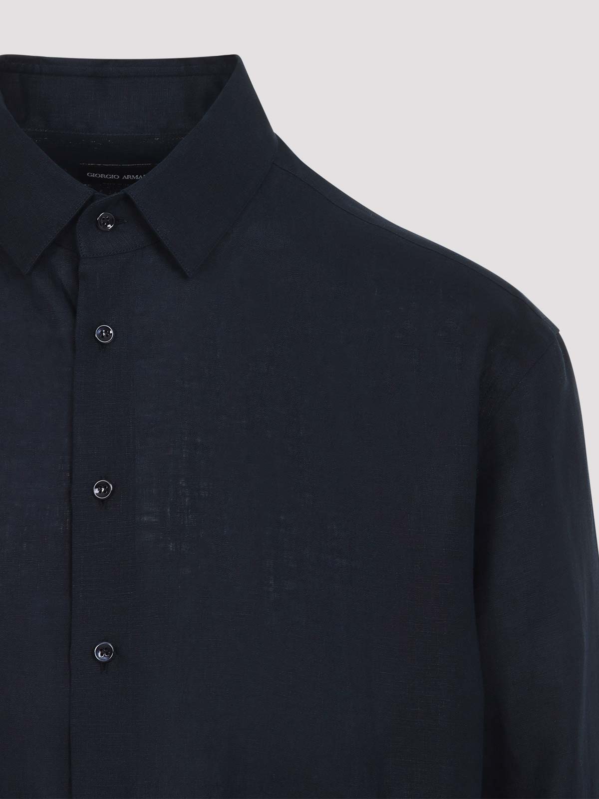 ジョルジオアルマーニナイトスカイブルーリネンシャツ。ピュアナイトスカイリビエラブルーリネンシャツ、ポインテッドカラー、フロントボタン留め、ロングスリーブ、ボタン付きカフス、ラウンドヘム。