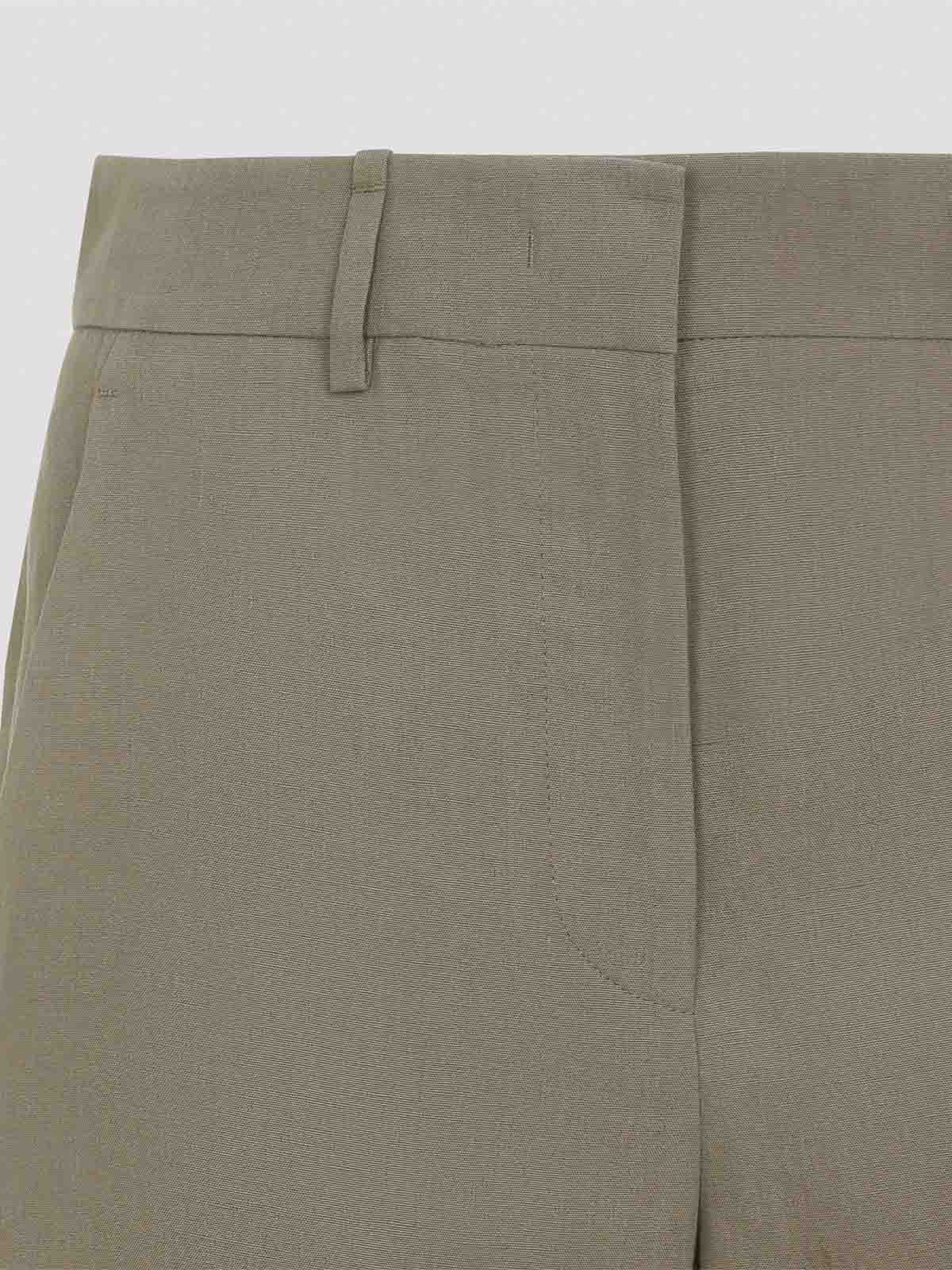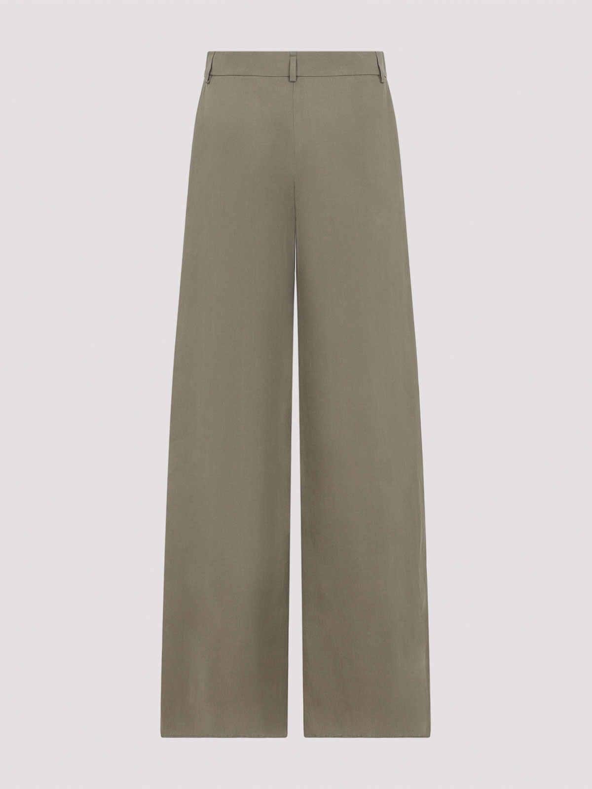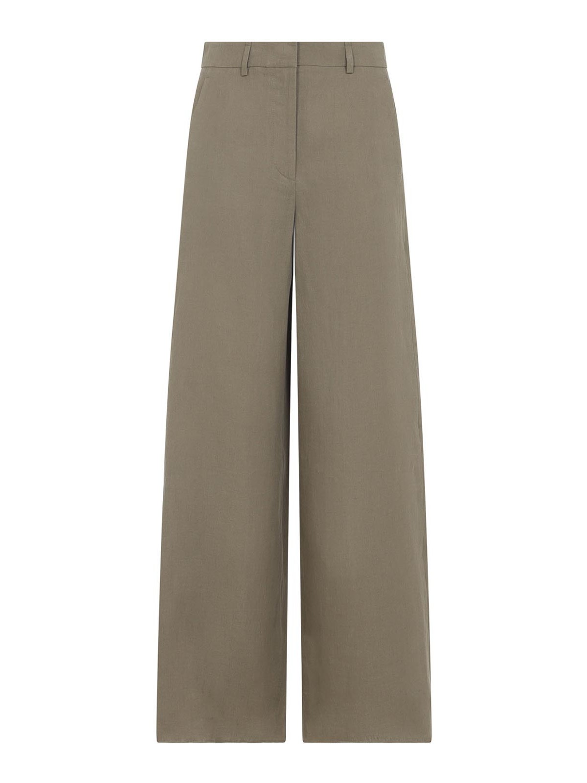 ジョルジオアルマーニスモーキークォーツグリーンリネンパンツ。ピュアスモーキークォーツグリーンリネンパンツ、フロント隠しファスナーとフック留め、ベルトループ、サイドポケット、ワイドレッグ、ストレートヘム。