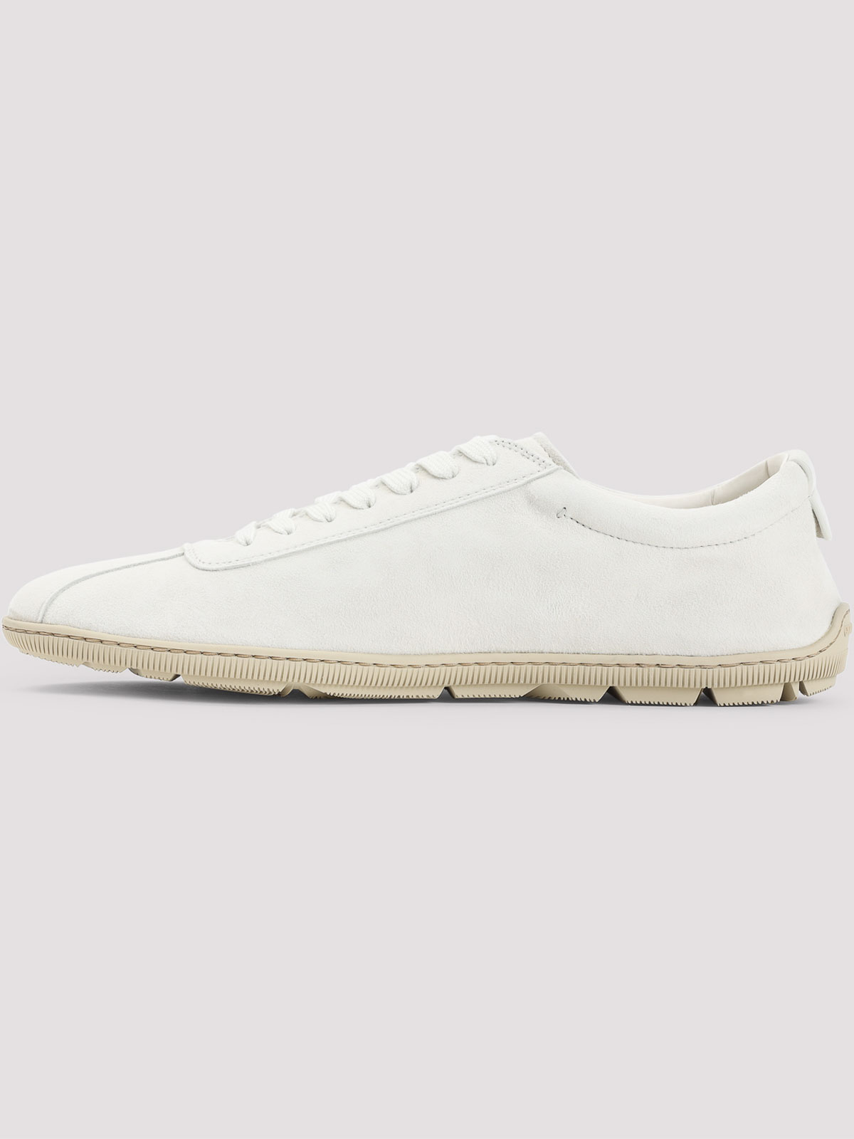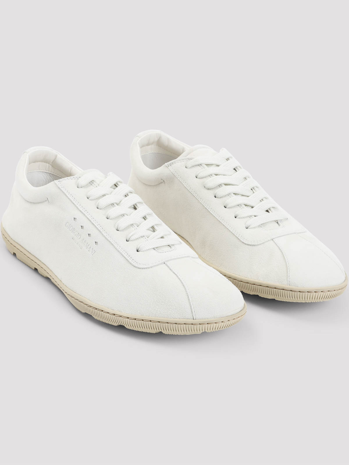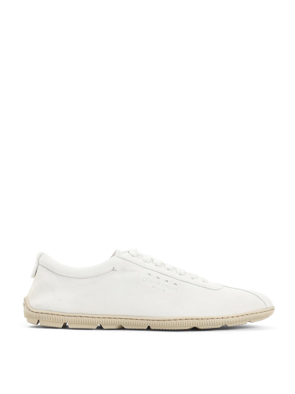 ジョルジオアルマーニミルクホワイトゴートレザースニーカー。ピュアミルクホワイトのゴートレザースニーカー、ラウンドトゥ、トップレースアップファスナー、サイドにロゴ刻印、ベージュのラバーソール。