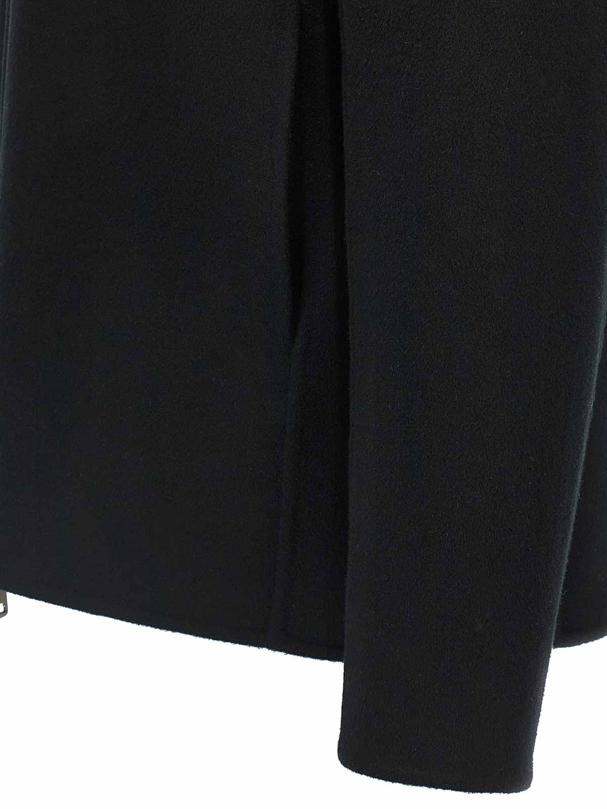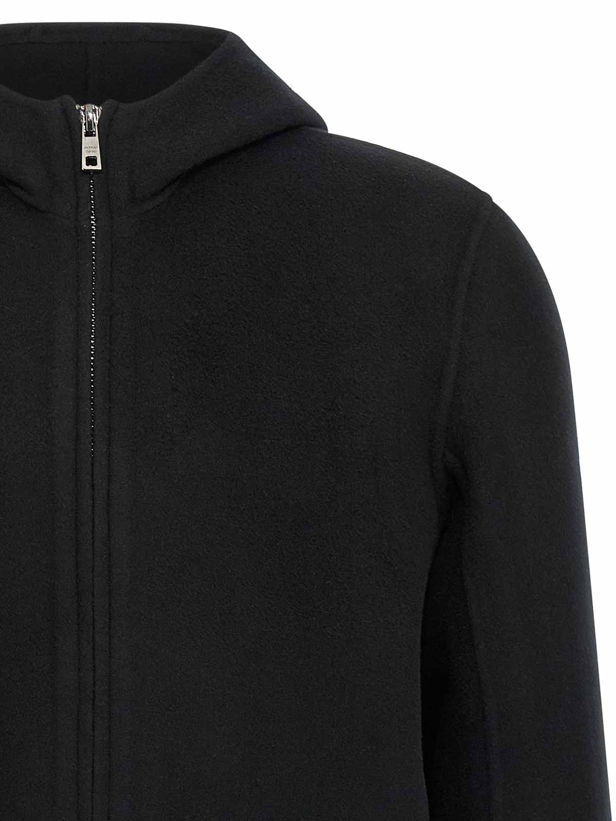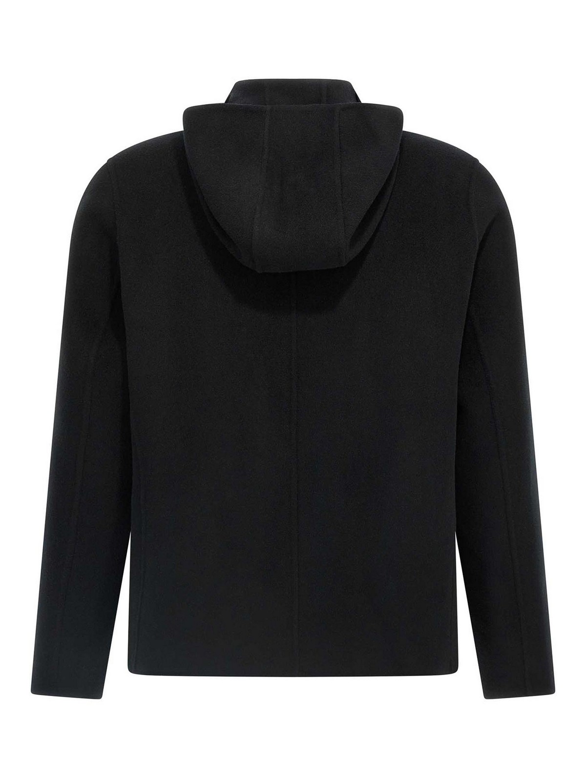 ウールとカシミア混紡のフード付きジャケット、裏地なし、フロントファスナー、ポケット、ロングスリーブ。
