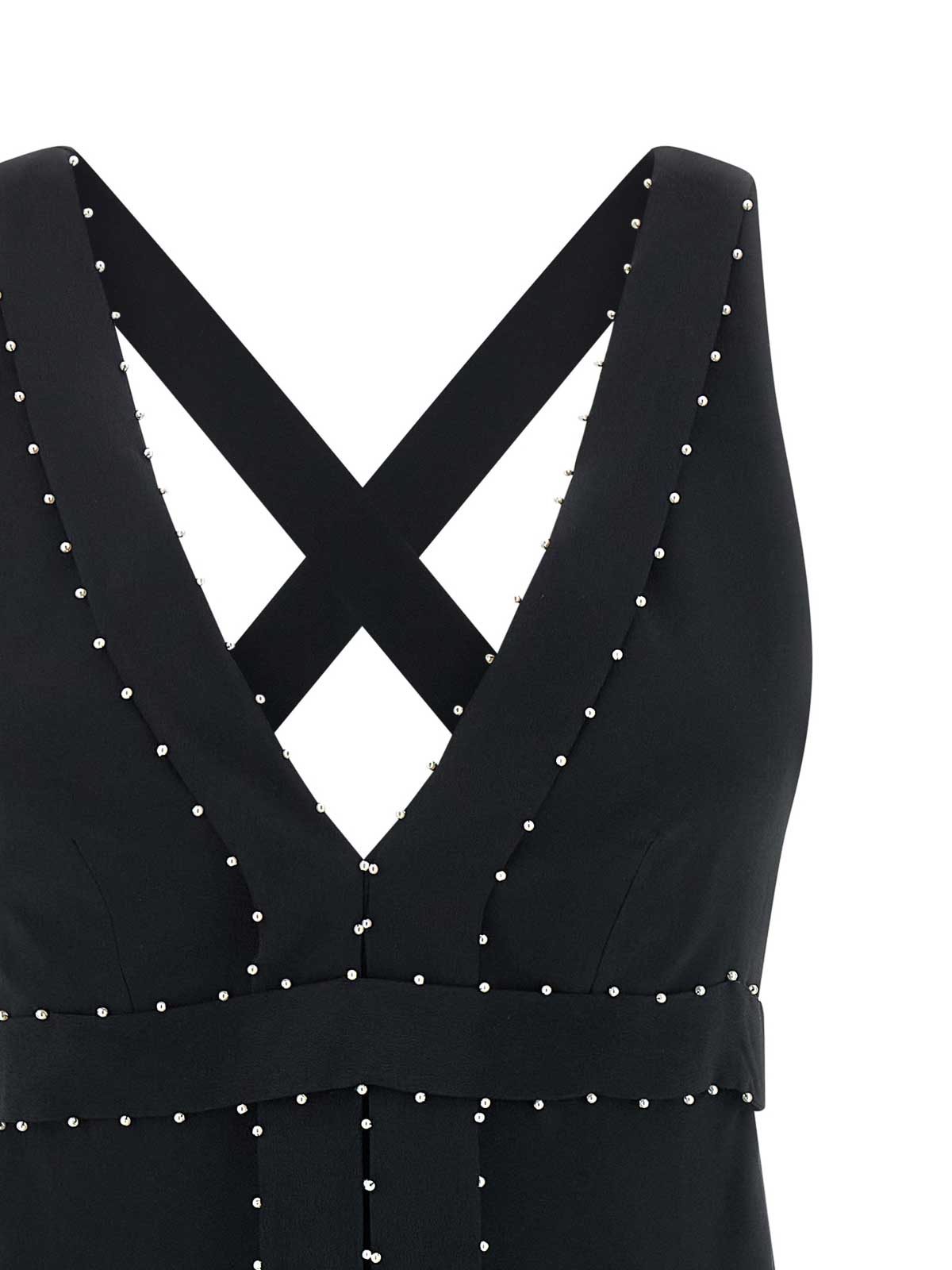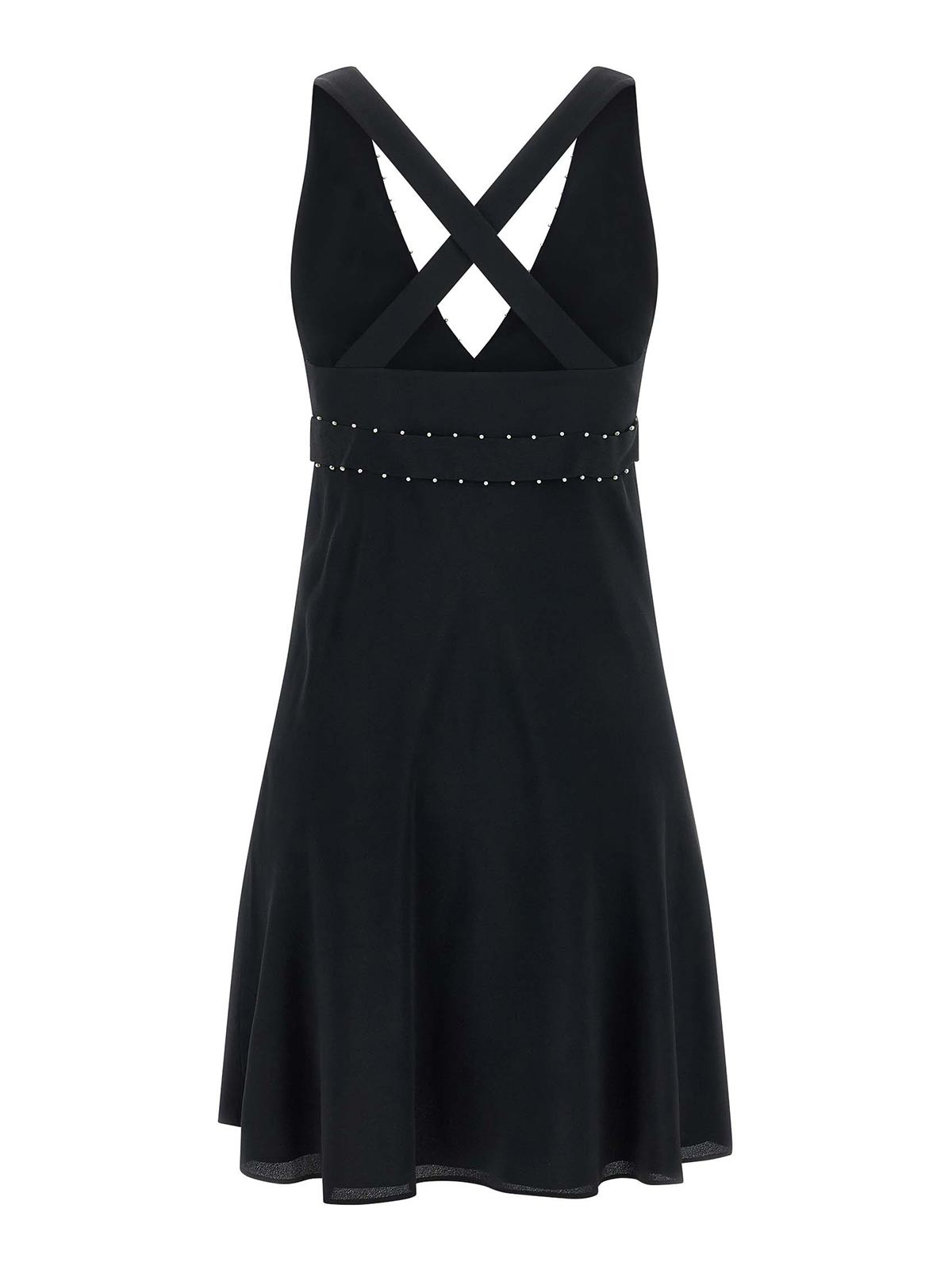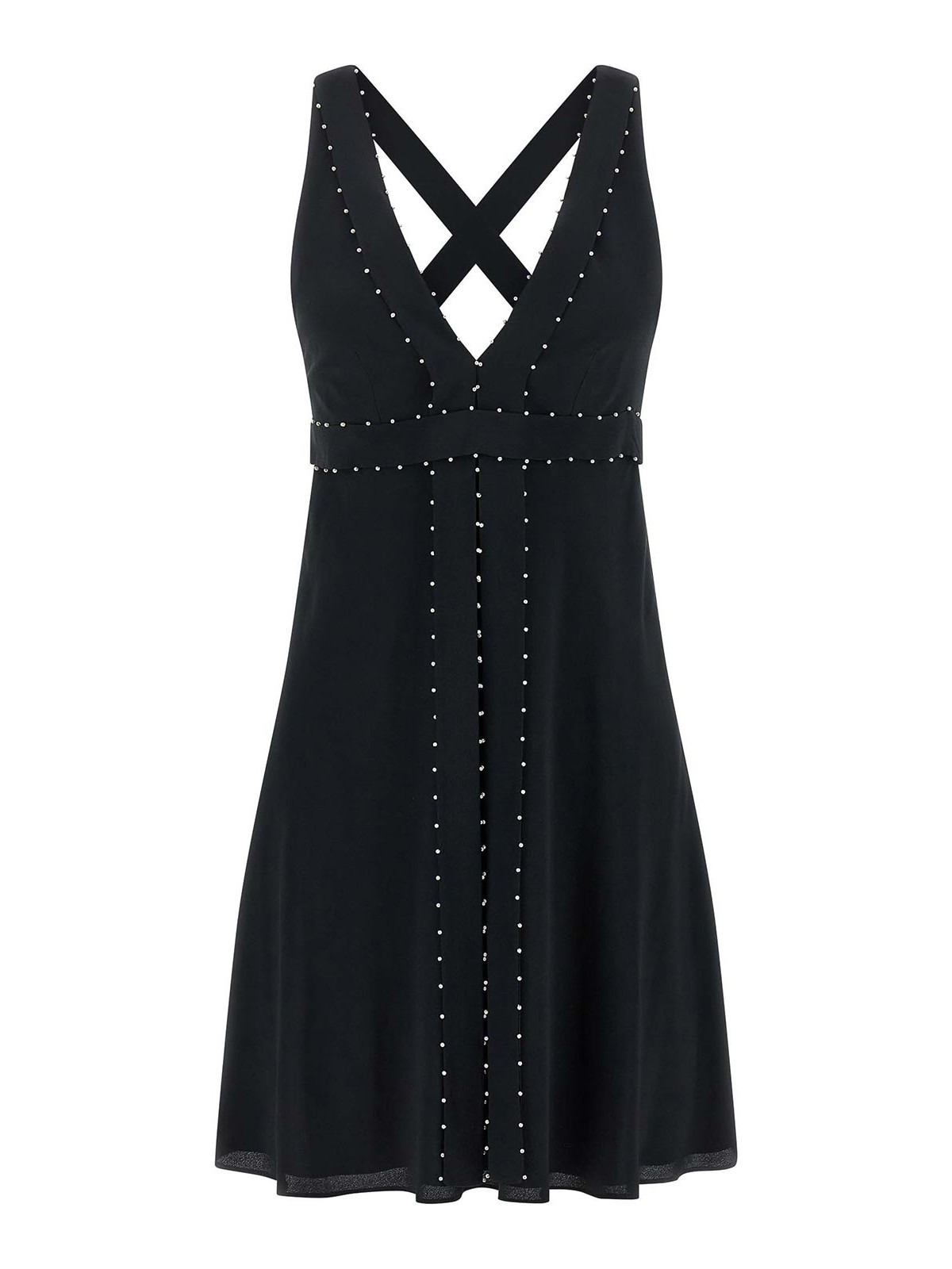 シルク混紡ミニドレス、ミニアップリケ、ワイドV、背面にネックワイドクロスショルダーストラップ、ノースリーブ、サイドジッパー、アンダースカート