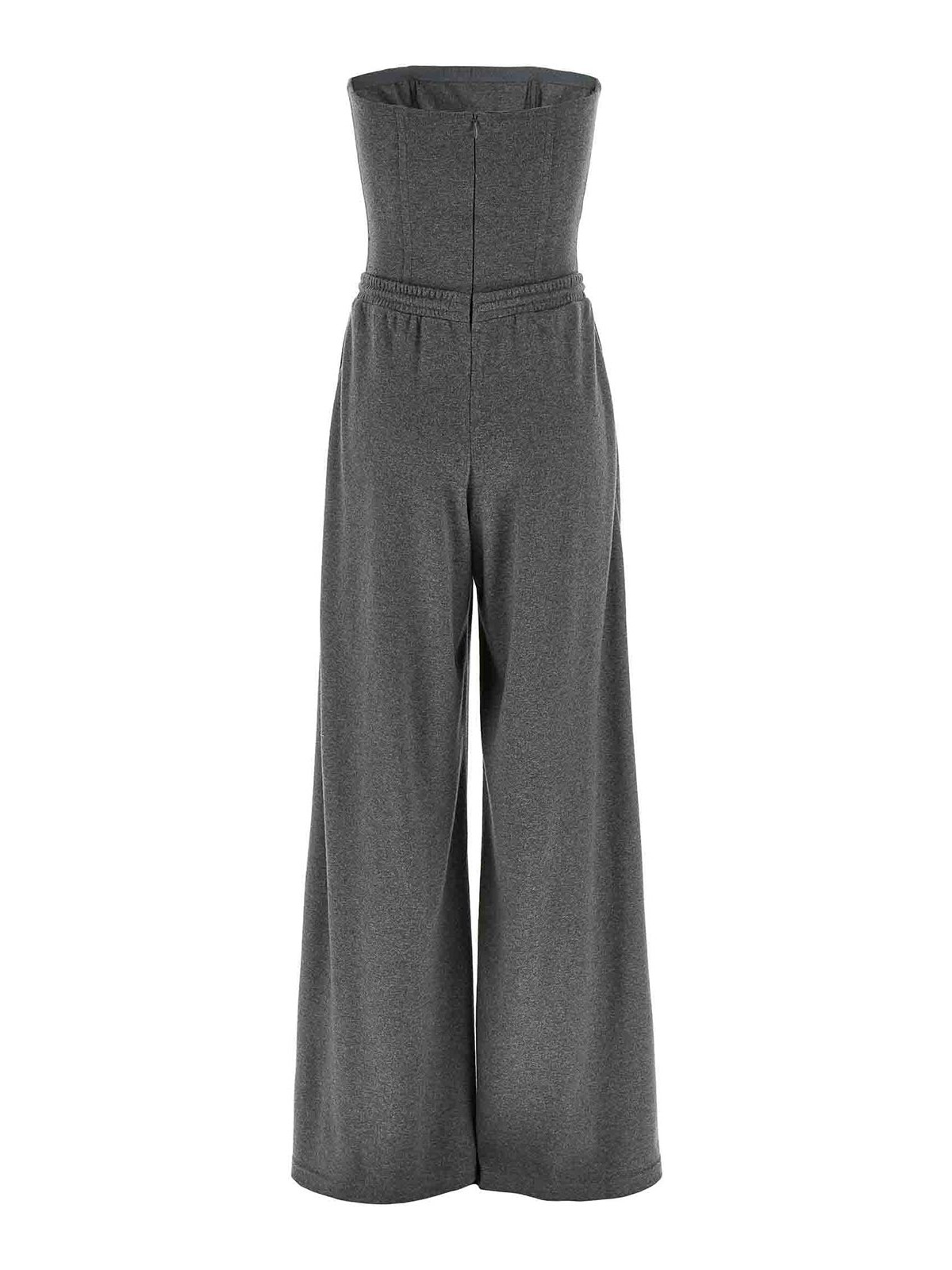 ウール調のシルク混紡生地を使用したワンピーススーツ。スラット付きのコルセットとワイドでストレートレッグのジョガーパンツ、ウエストにドローストリング、サイドポケット、ジッパーとフック付きのバッククロージャーで構成されています。