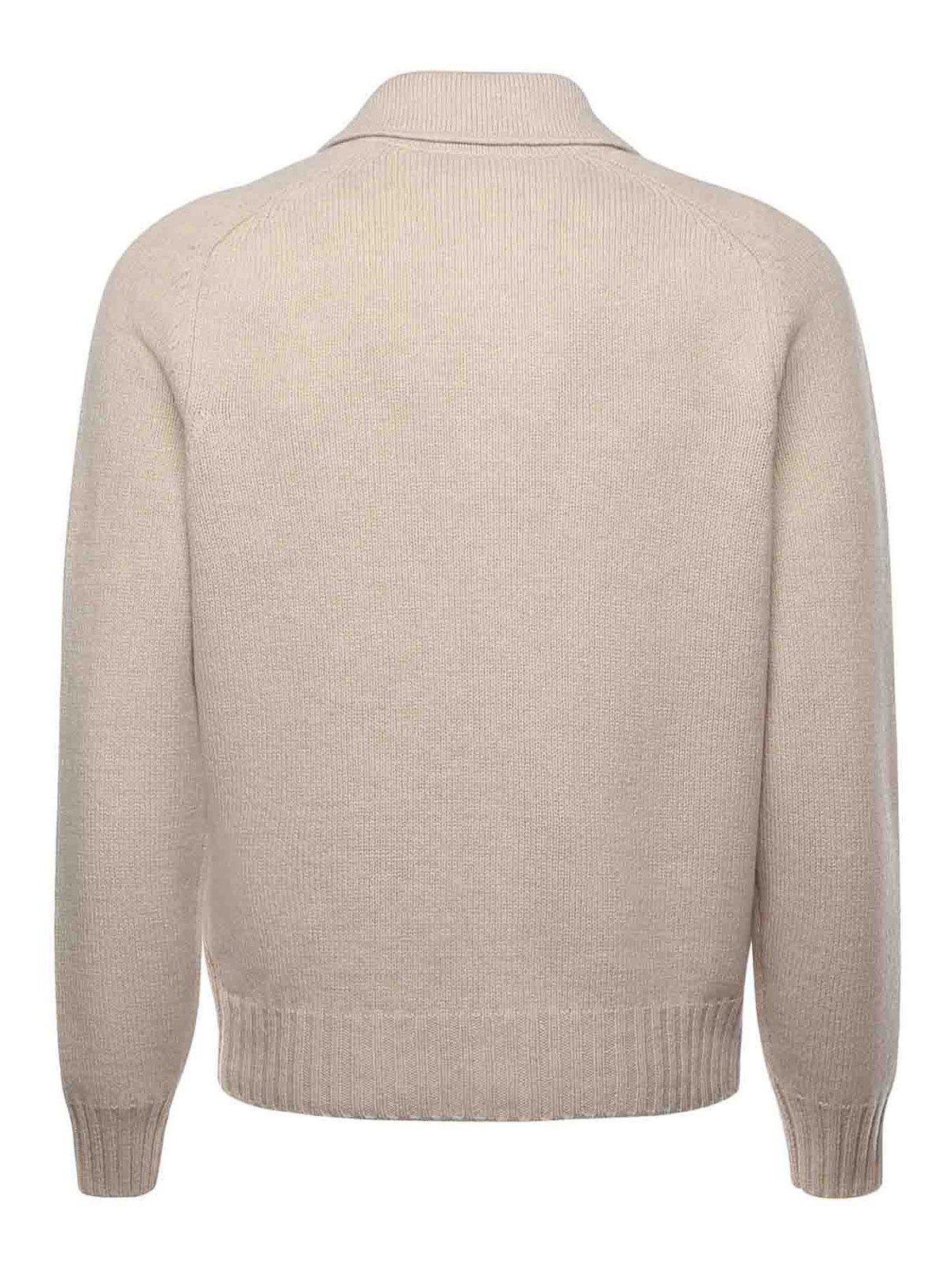 バージンウール製、フロントボタン留め、胸にパッチポケット、リブ編みの袖口と裾、レギュラーフィット、写真のサイズは46、イタリア製、色:サンド