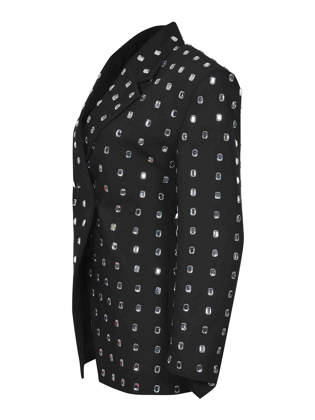 ブラックコットン混紡のジュゼッペ・ディ・モラビトブレザー。ノッチドラペル。隠しフック付きフロントクロージャー。幾何学的な形のクリスタルが全面に施されています。長袖。ショルダーパッド。裏地。コットン 62%、ポリエステル 33%、エラステイン 5% イタリア製