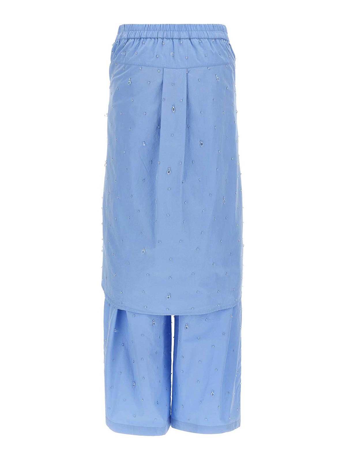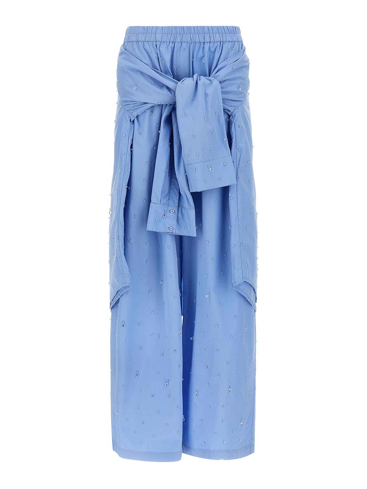 全体にクリスタルのアップリケをあしらったコットンポプリンパンツ、ワイドでストレートなレッグ、伸縮性のあるウエストバンド、Trompe l'Oeilフラップ、ポケット、ウエストで結んだり滑らせたりできるバックシャツインサート。
