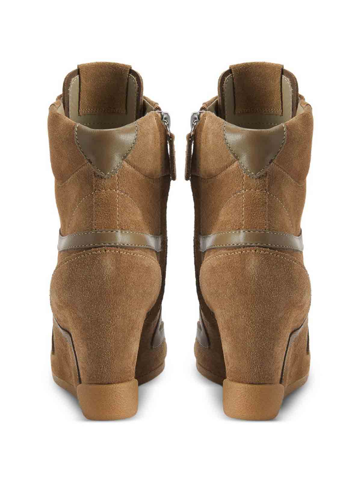 ブラウンスエードアッパーレザーシグネチャーディテールラバーソールレースアップ留めバックループウェッジヒール