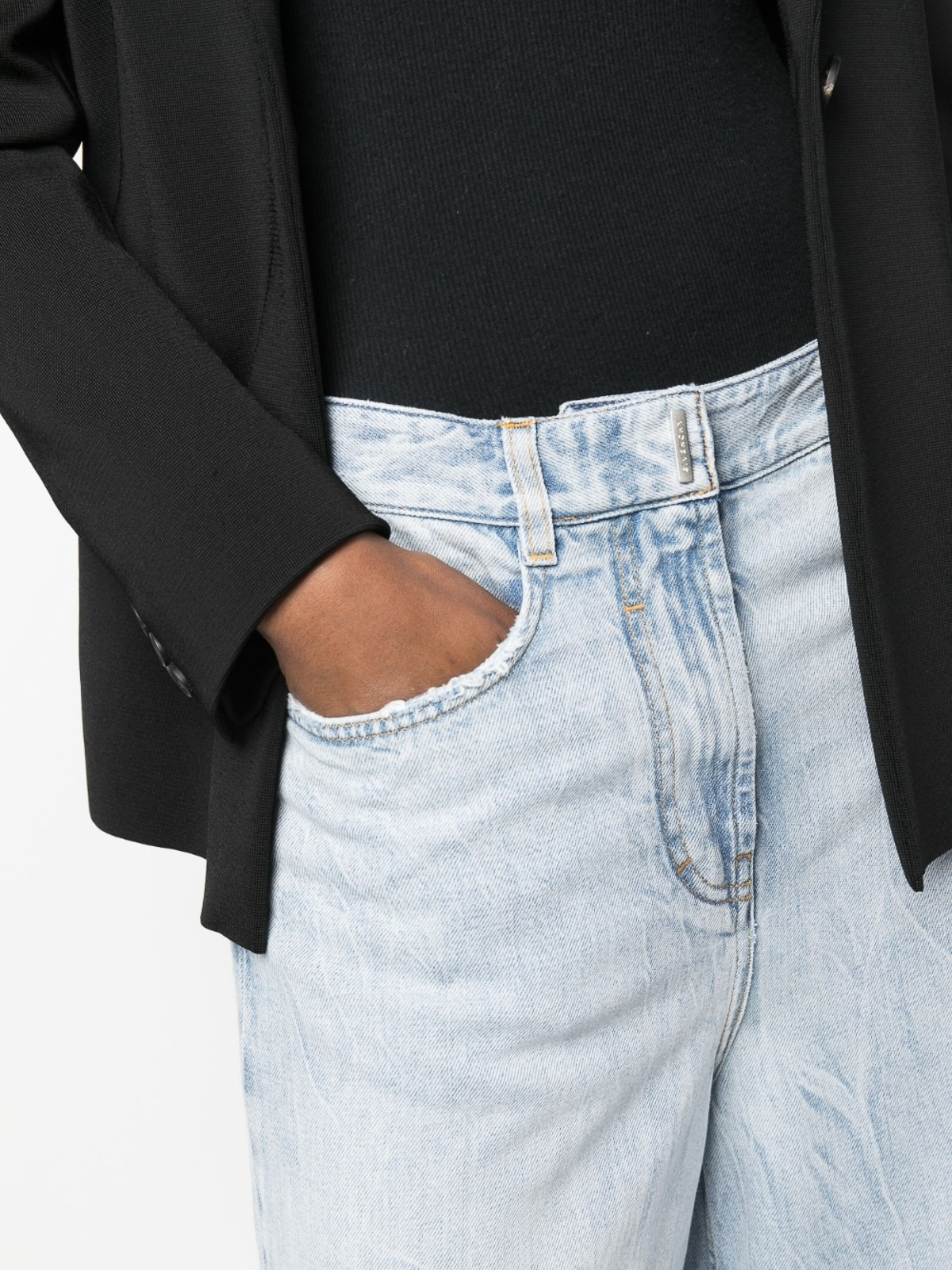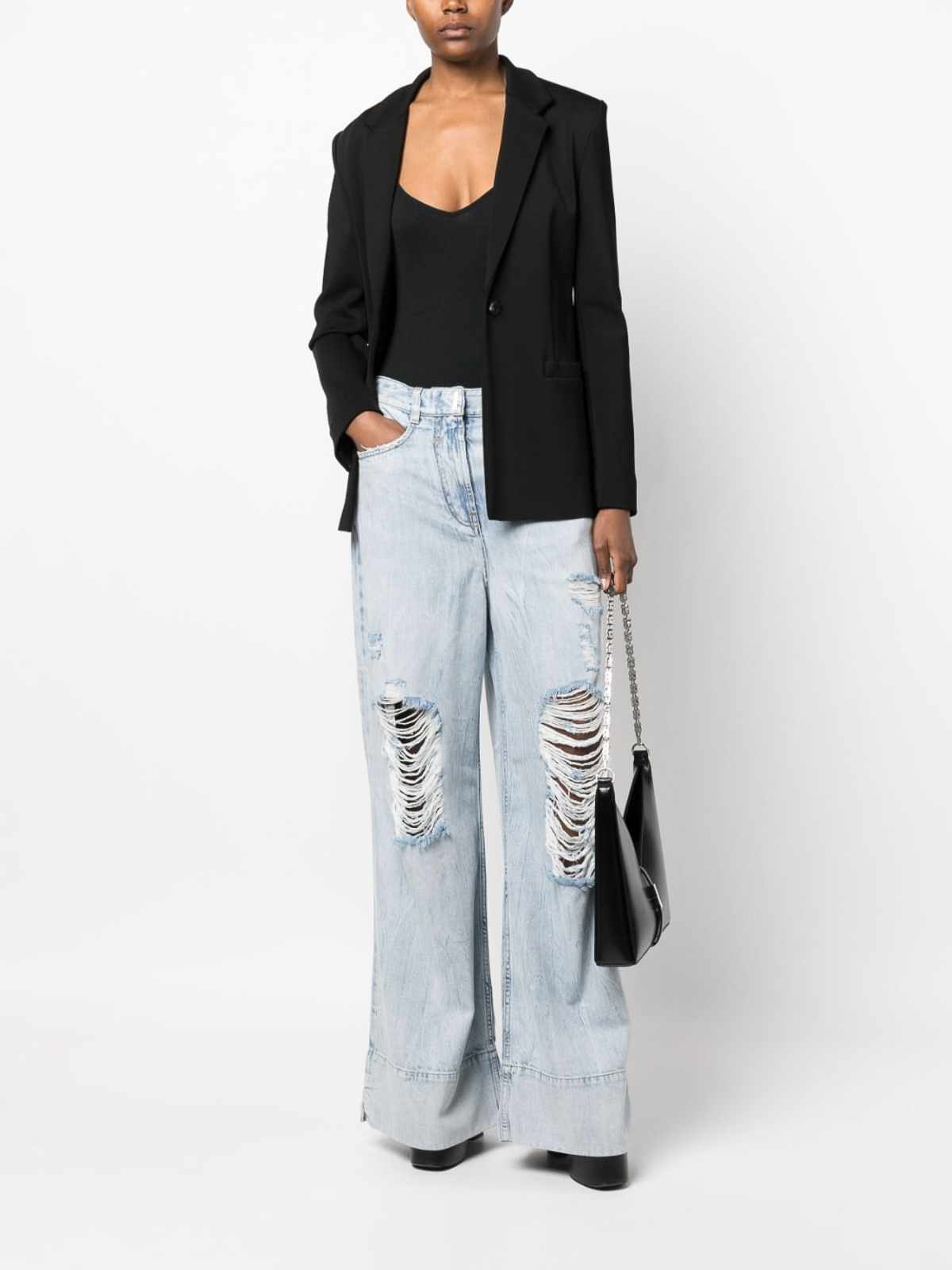 Givenchy (VIP) のダメージ加工ディテールのワイドレッグジーンズは、ライトブルーのコットン混紡デニムダメージ加工のワイドレッグベルトループ、フロントボタン、ジッパー留め、サイドインセットポケット2つ、リアパッチポケット2つ