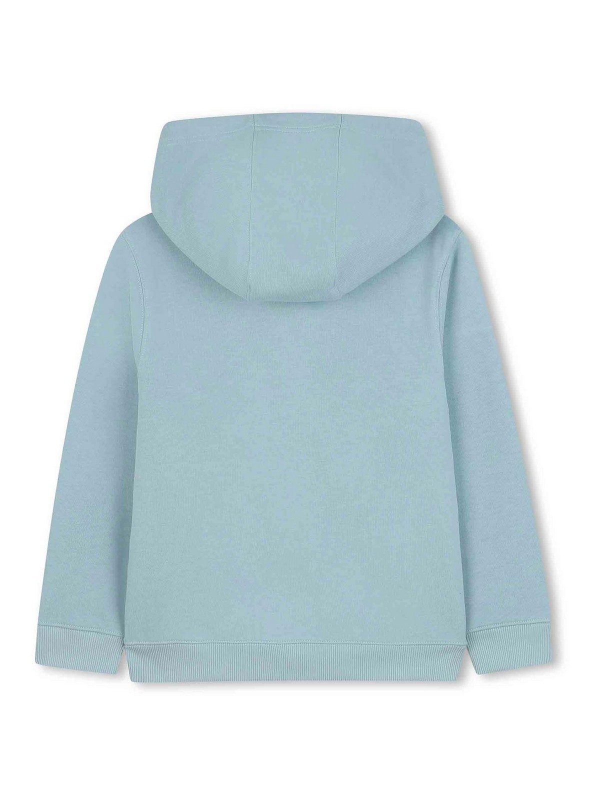 前面にライトブルーのロゴが入ったスウェットシャツ、ジッパー付き、カンガルーポケットにロゴプリント、オーガニックフードデザイン