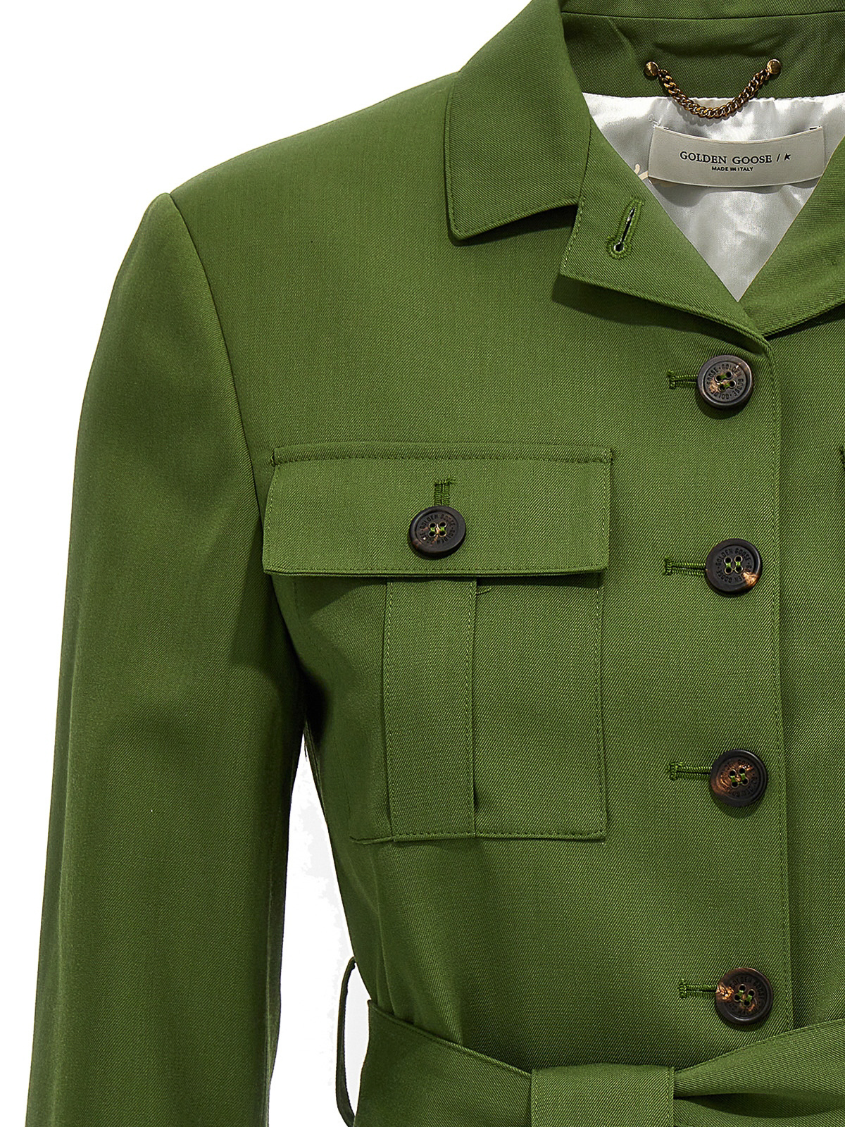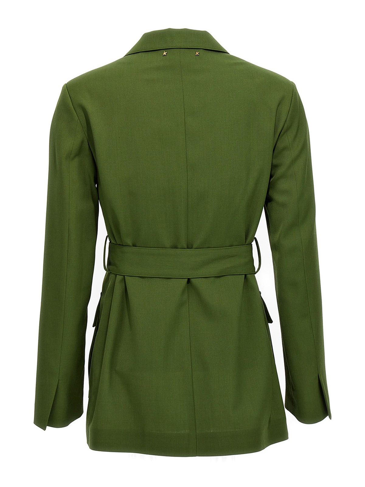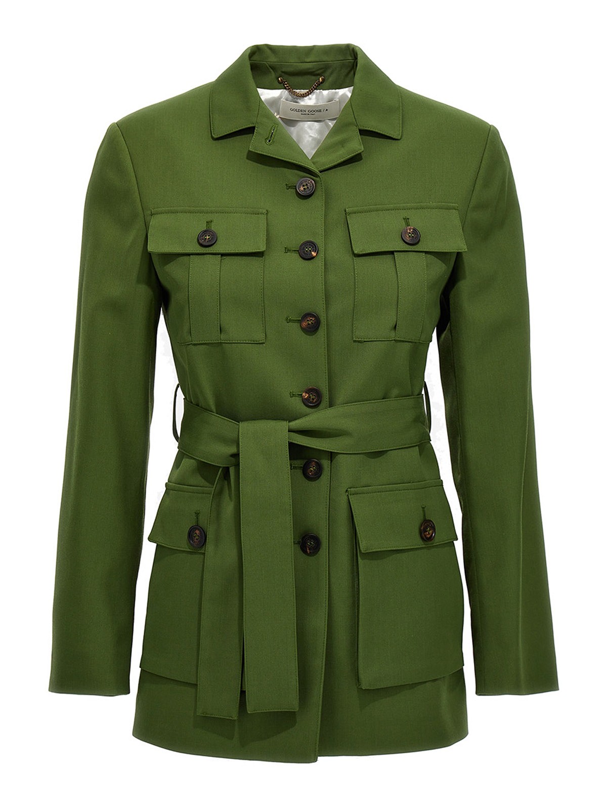 ボタン留めポケット、長袖、肩にややパッド入り、ウエストにベルトが付いた、薄手のウール混紡生地のジャケット