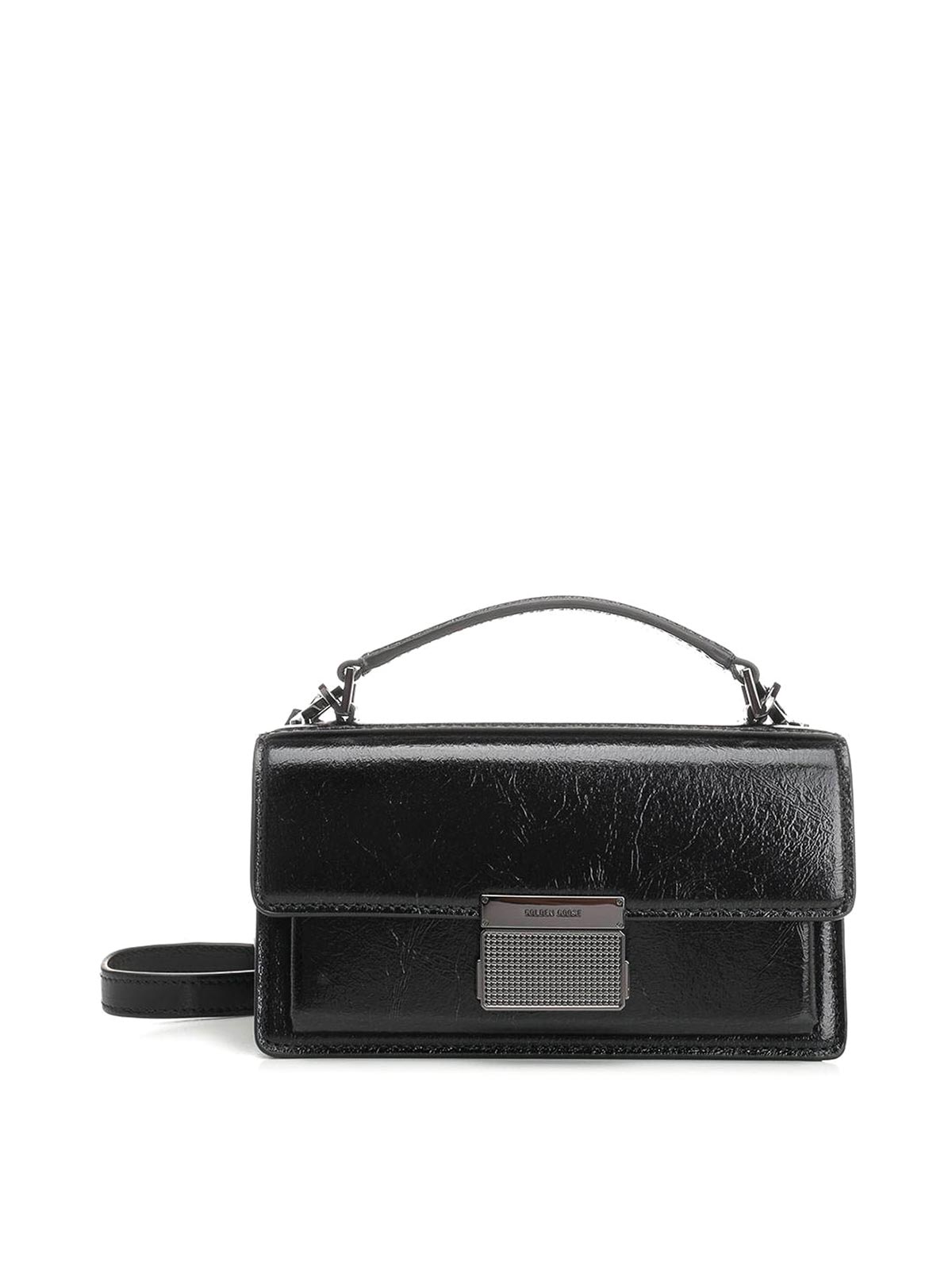 ゴールデングースデラックスブランドのベネチアバッグはブラックラミネート加工で、バックルとさまざまなデザインが特徴で、ダブルポケットと調節および取り外し可能なショルダーストラップが付いています