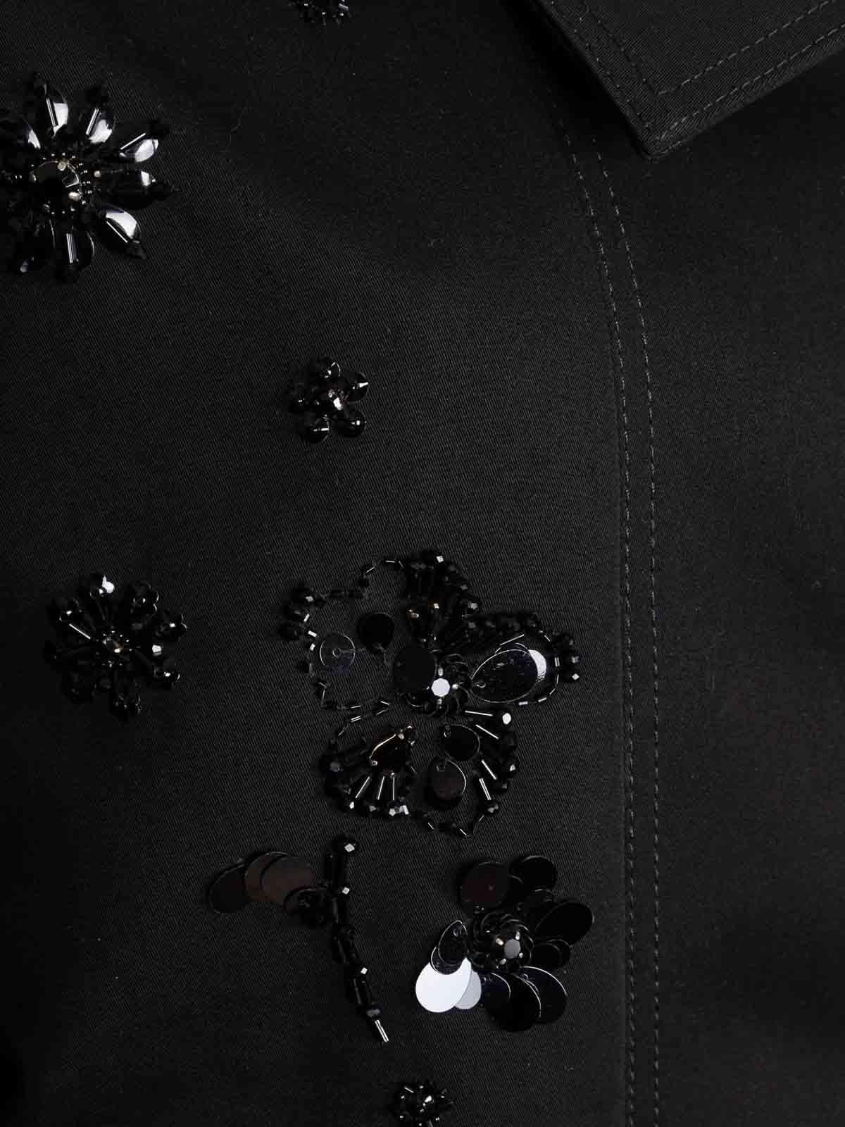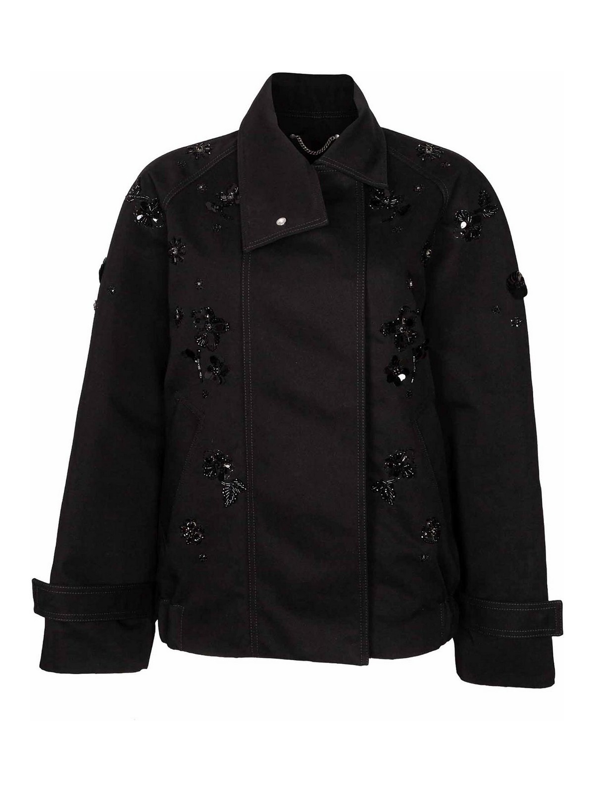 ハイネックデニムジャケット、ファスナー付きスナップボタンと花柄スパンコールボタン、ロングクロップドゴムボトム、フィット