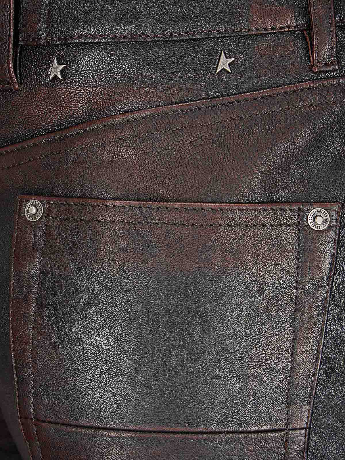 5ポケットのナッパパンツ、フロントボタンとジッパー、ストレートスリムフィット、背面にダブルスター。