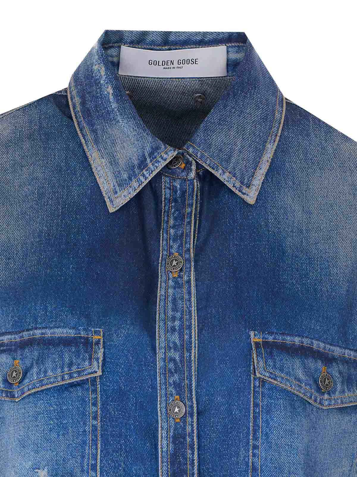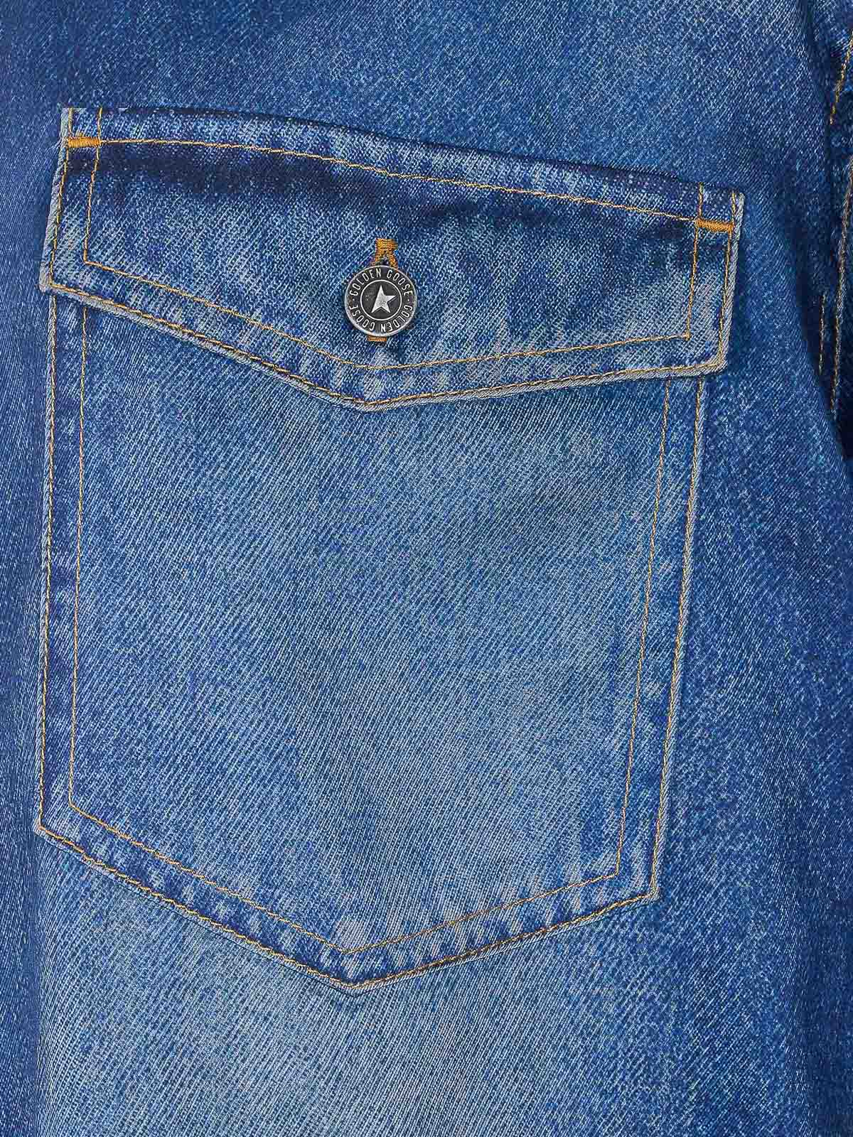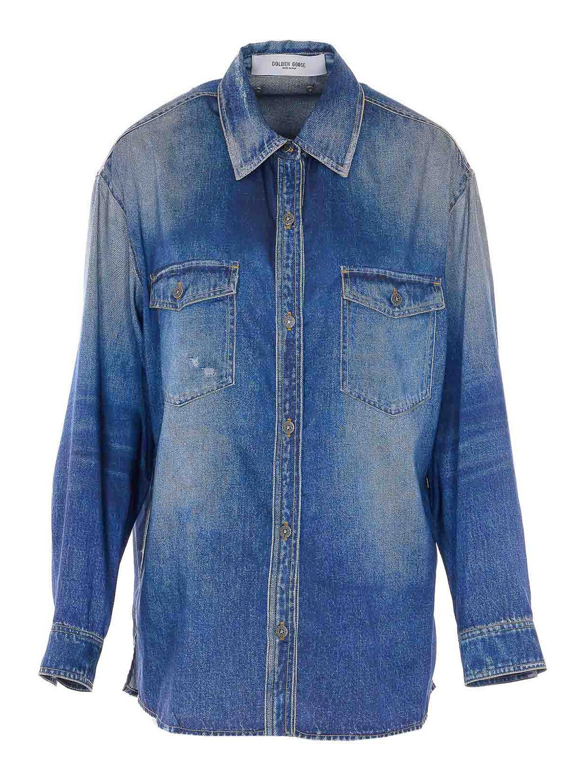 ゴールデングースブルーシャツ、フロントボタン留め、ロングスリーブ、デニムエフェクト、フロントポケット