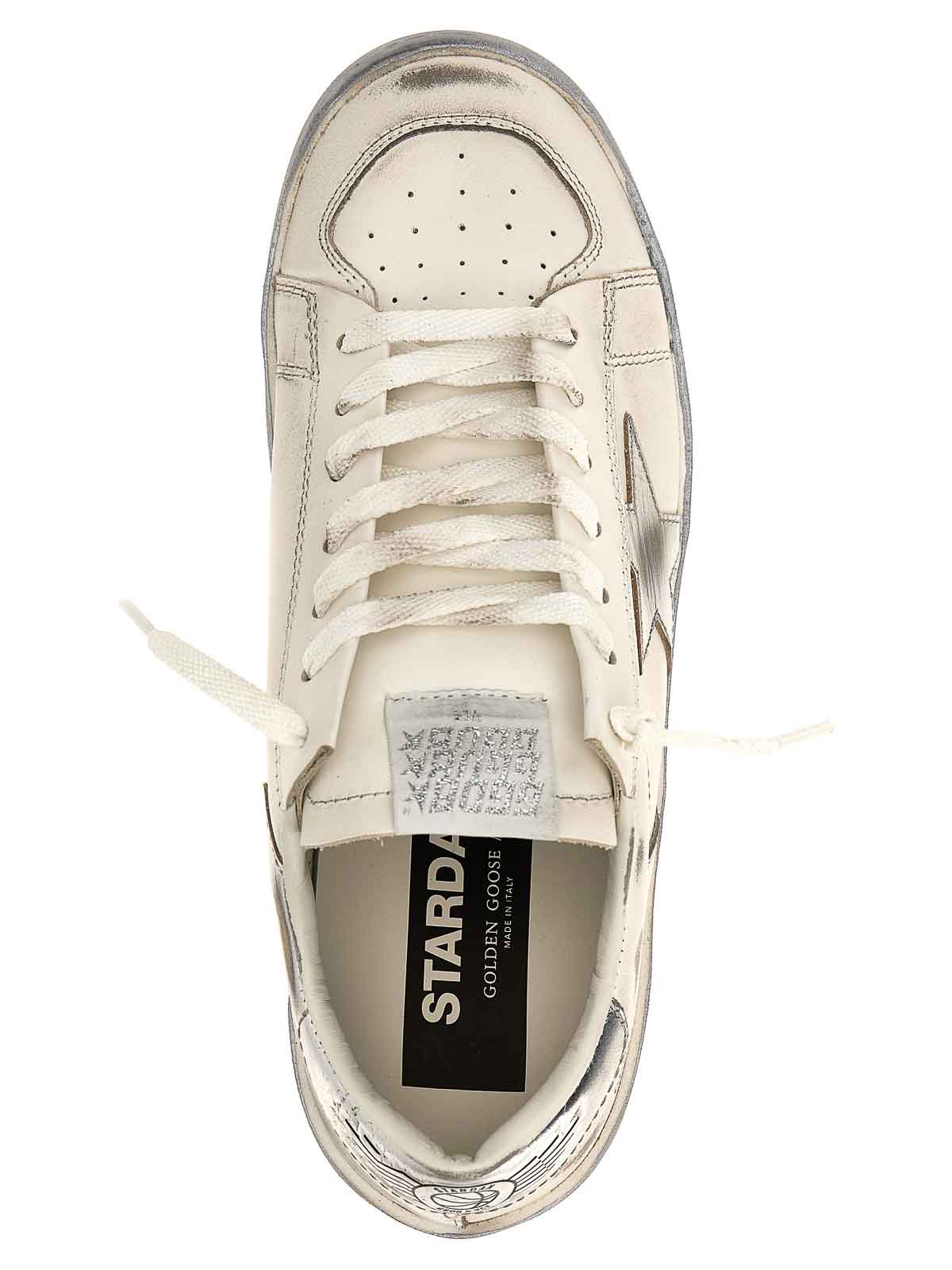 サイドスターとコントラストヒール、レースアップクロージャー、ラバーソール、ユーズドエフェクトのディテールが施されたスターダンレザースニーカー。