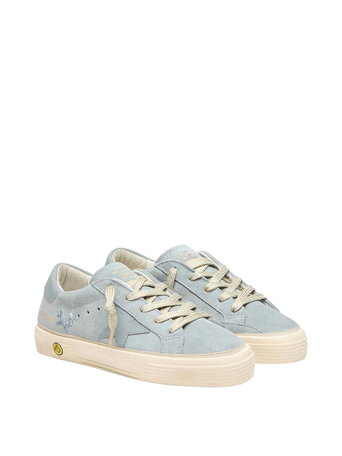 ブルーのスエードレザー製メイスタースニーカー、フラワーモチーフ、スターアプリケーション、レース付きラウンドトウ