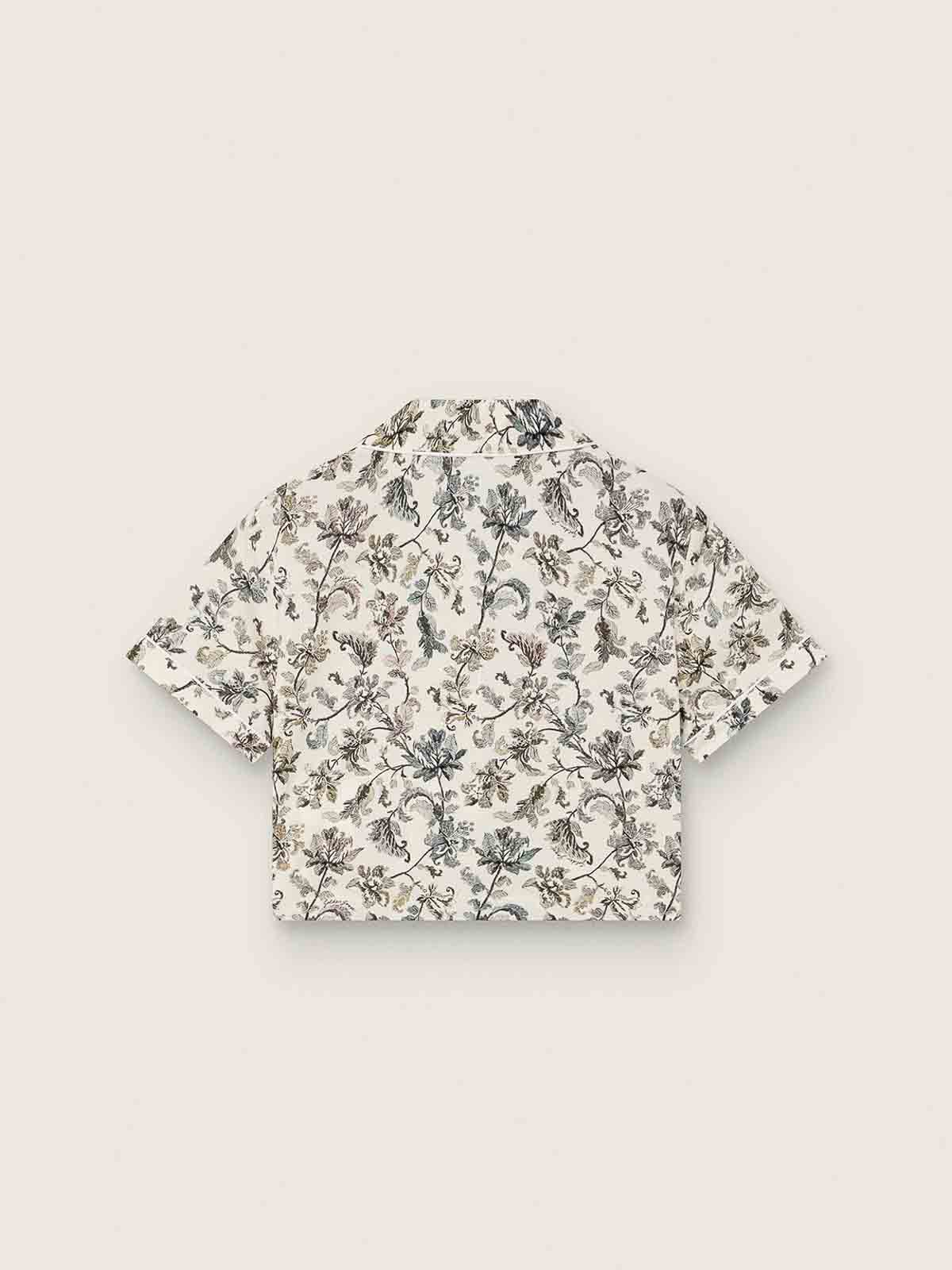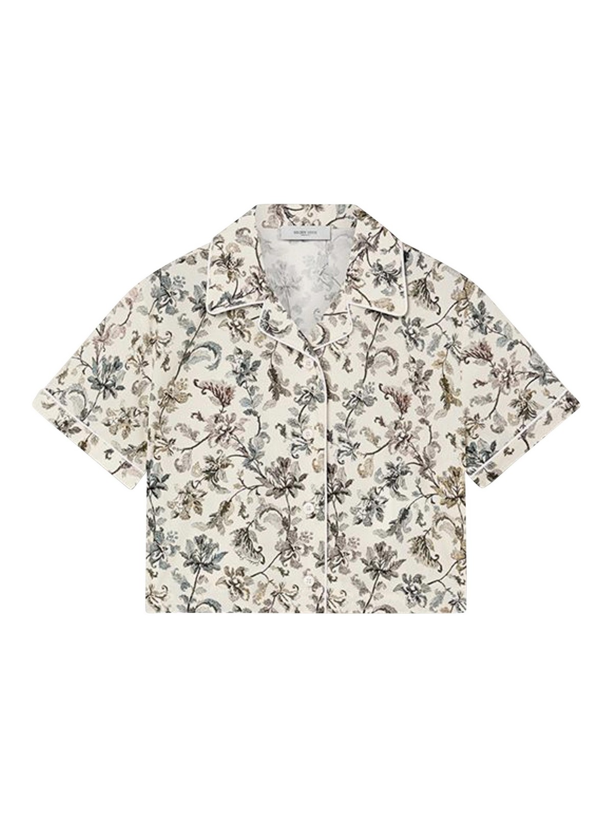 花柄のシャツは、クラシックな襟と半袖のマットホワイトの花柄プリントが特徴です