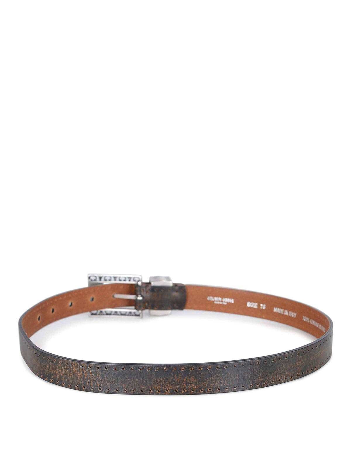 ブラックハンマーレザー製のゴールデングースベルト。ビンテージエフェクト。長方形のシルバーカラーのメタルバックル。穴の開いた調節可能なクロージャー。100% レザー。イタリア製