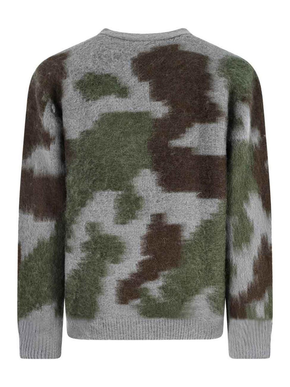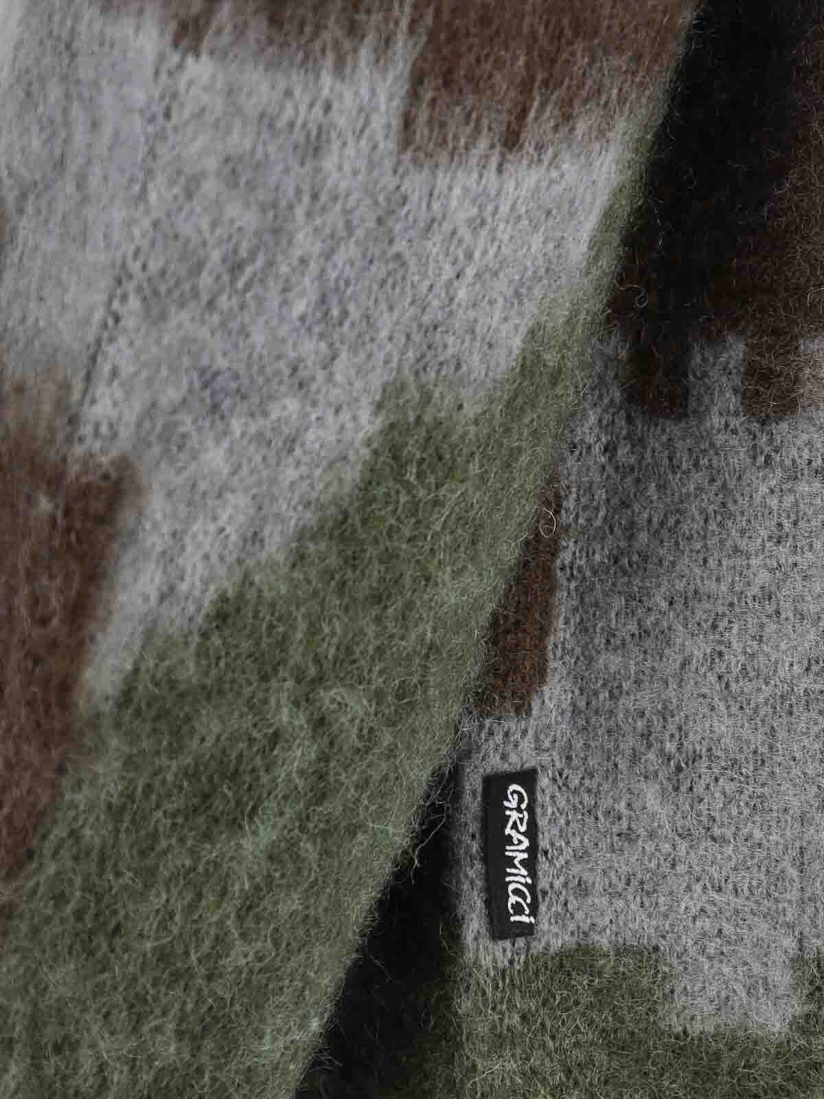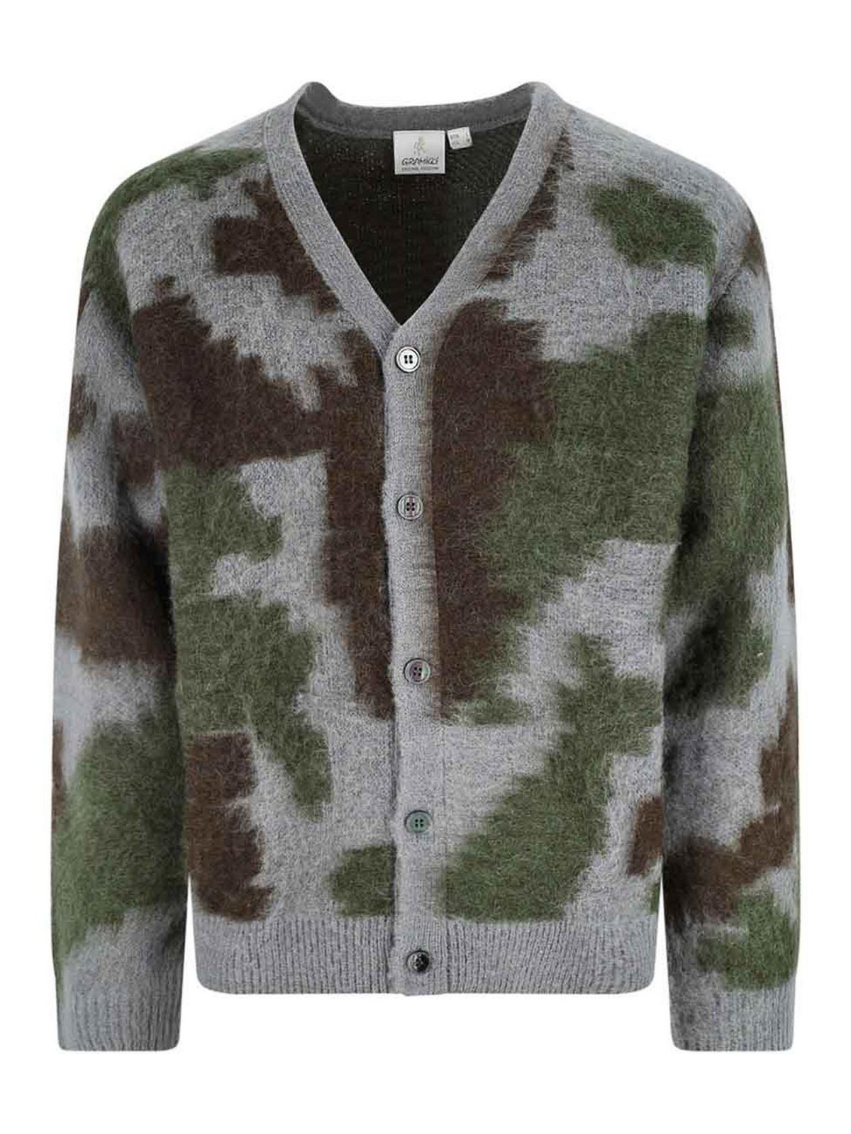 Gramicci カモフラージュカーディガン、マルチカラーウールブレンド、Vネック、ドロップショルダー、ボタン留め、リブ仕上げ、ストレートヘム。