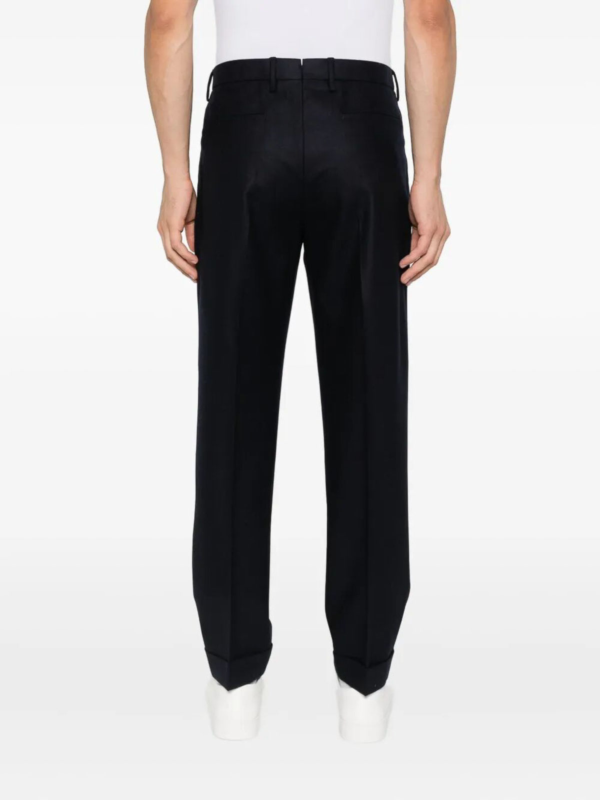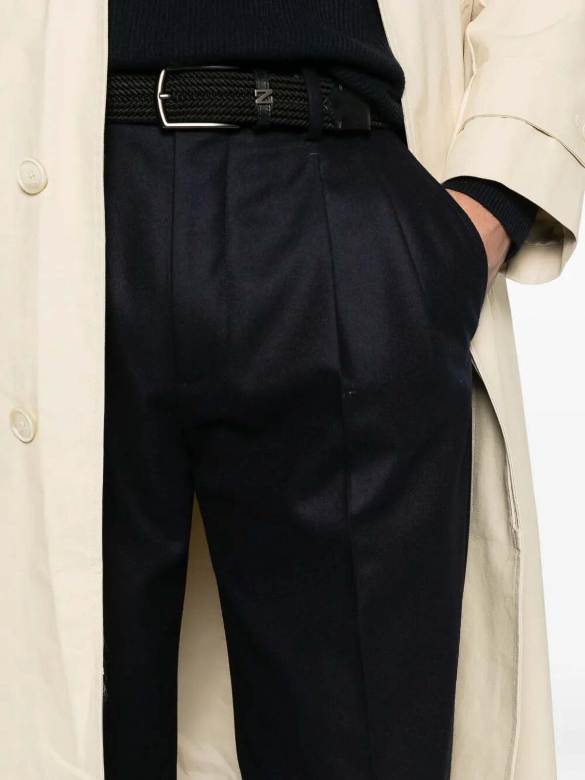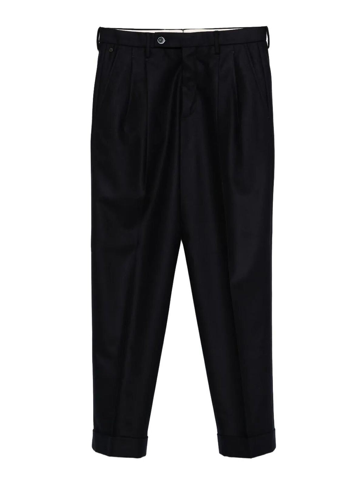 ダークブルー、プリーツフロント、カフ付きヘム、ボタンフライ、テーパードレッグ、ミッドライズウエスト