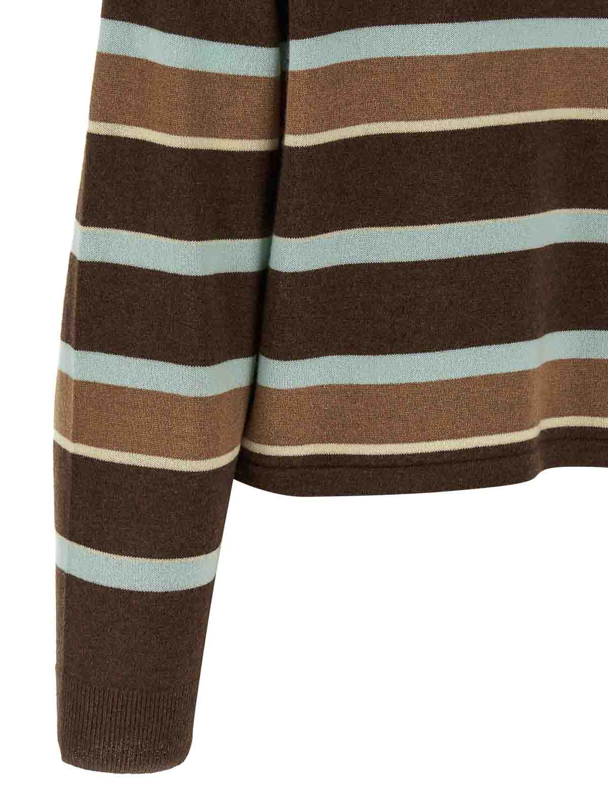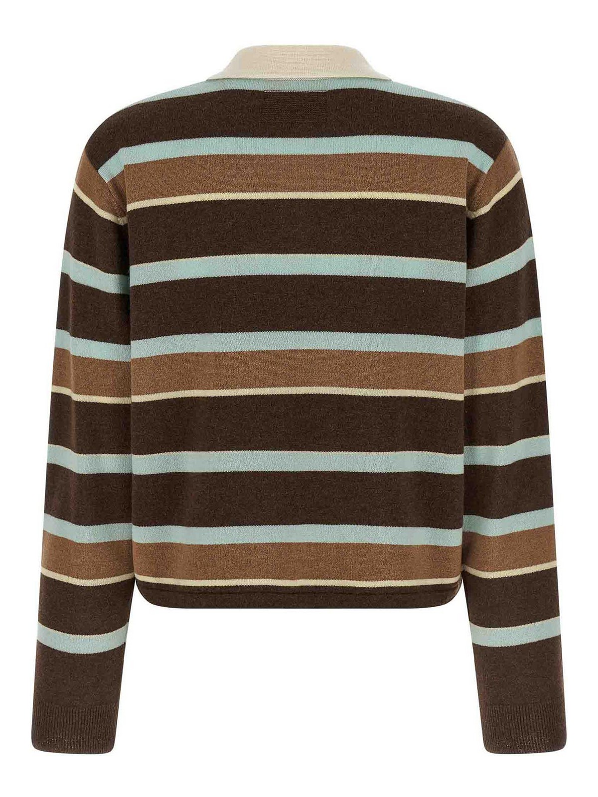 クロップドストライプラグビーカシミアセーター、クロップドポロモデル、襟、3つの隠しボタン付きフロントクロージャー、ストライプ柄、袖口付きロングスリーブ。